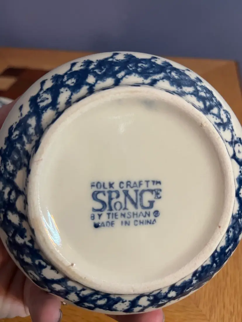 Tienshan is a brand known for producing decorative dinnerware and kitchenware, often featuring popular folk art motifs and patterns. Their "Sponge Blue" line, characterized by its distinctive blue sponged design on a white ceramic base, became popular for its rustic and charming aesthetic. These pieces are often collected for their decorative appeal and practical use in the kitchen.
