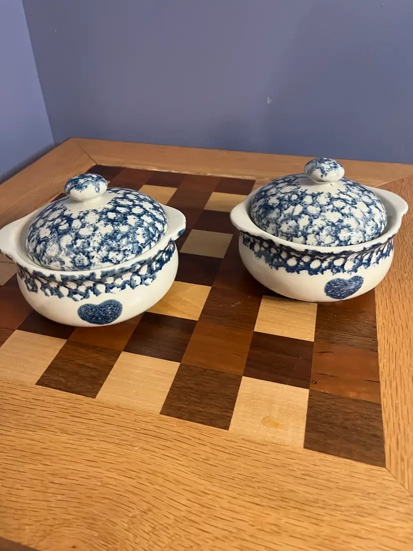 This particular "Sponge Blue" pattern often includes various folk art elements such as hearts, animals like rabbits or geese, and floral designs, making each piece unique. The casseroles with lids are designed for individual servings and are reminiscent of traditional stoneware, offering a blend of vintage charm and modern functionality. They are typically produced in the late 20th or early 21st century.