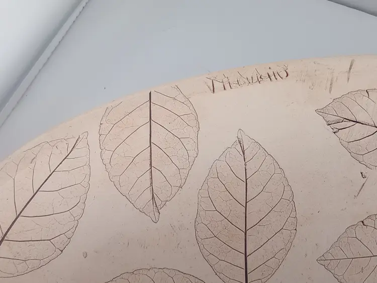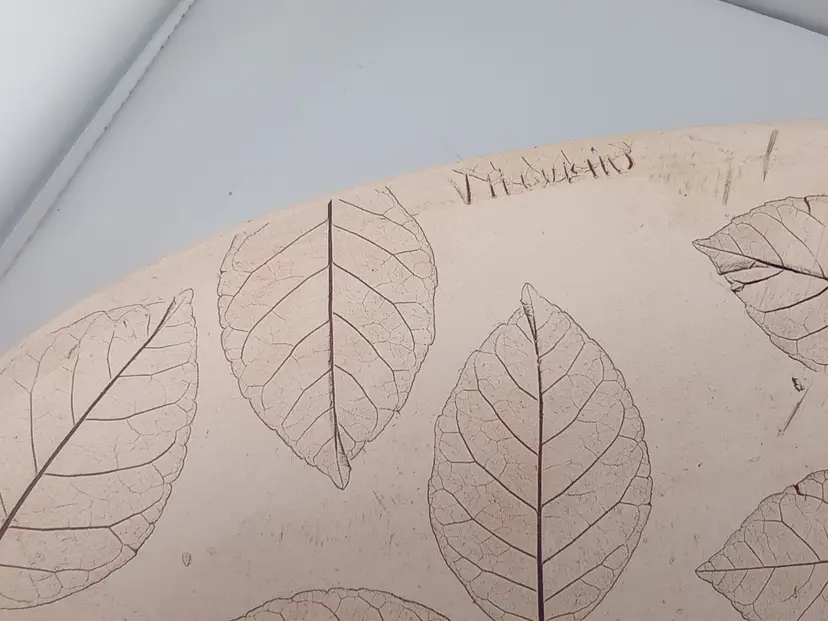 This is a gorgeous decorative platter, studio pottery signed by the artist Valerie Hawkins. It has a natural bisque finish with incised florals on the front and leaves on the back. The handles are glazed black. It's about 20" long and 8" wide and in excellent condition with no chips or cracks.