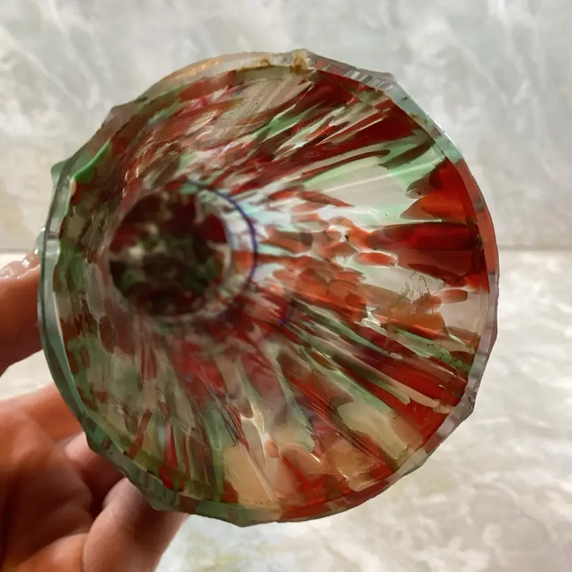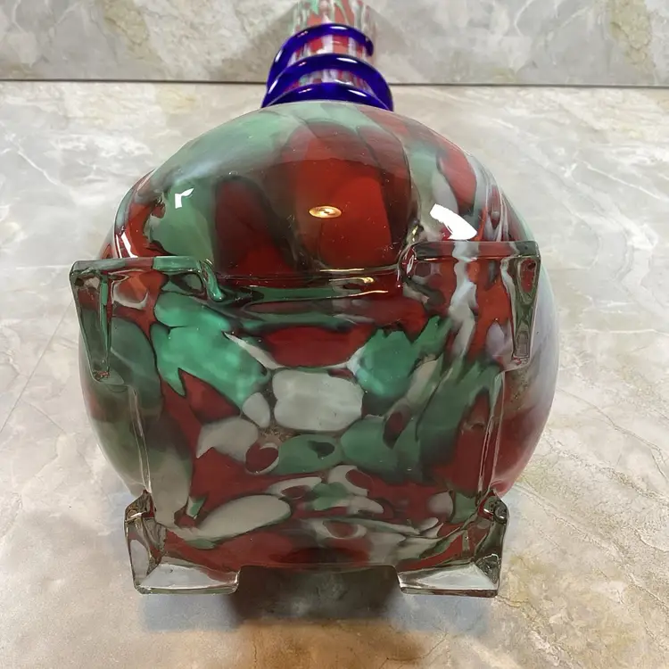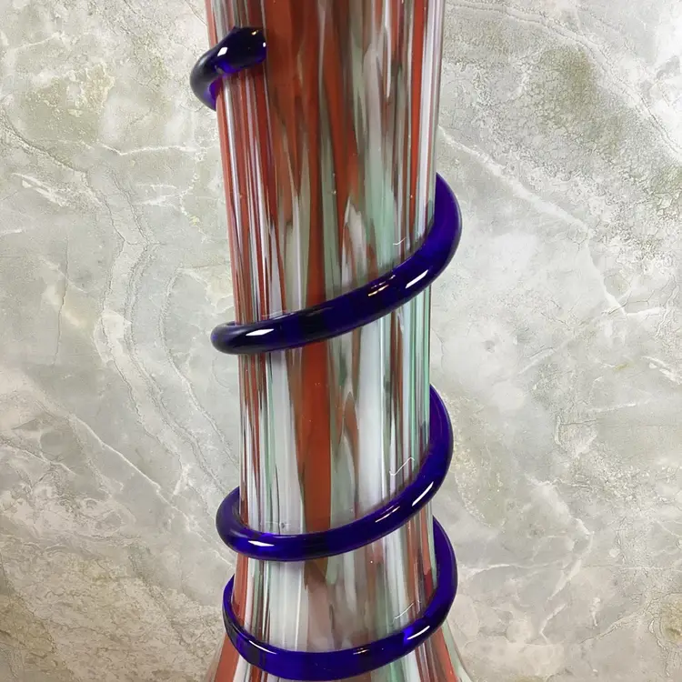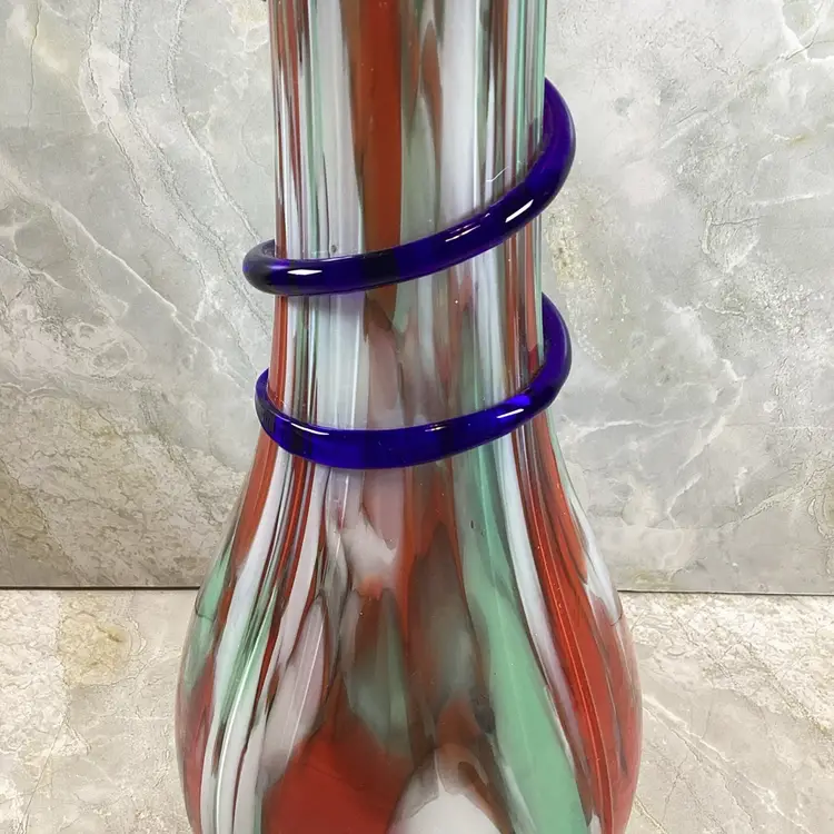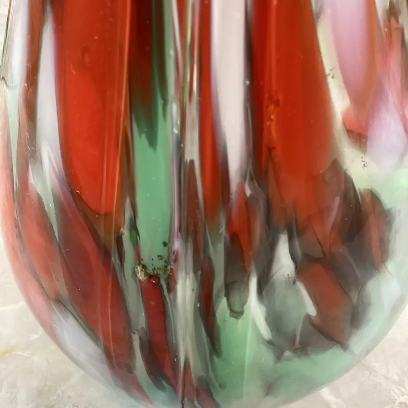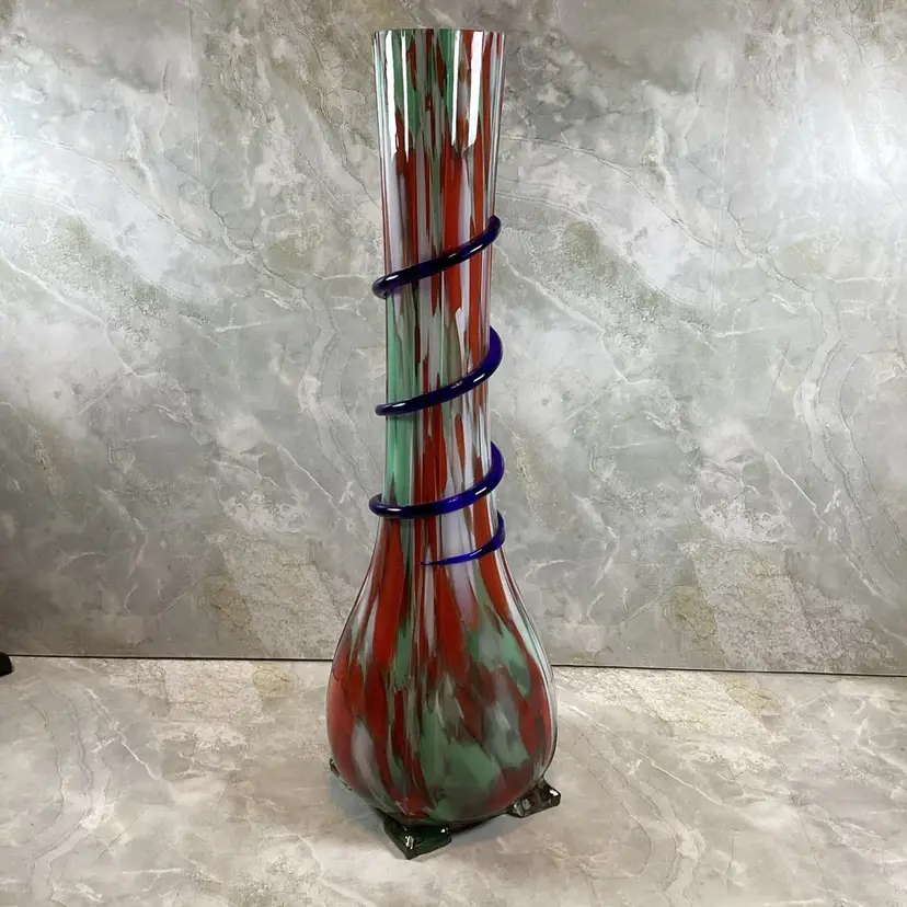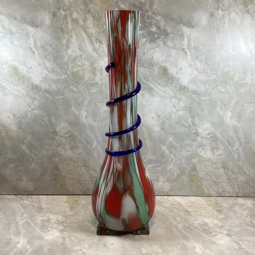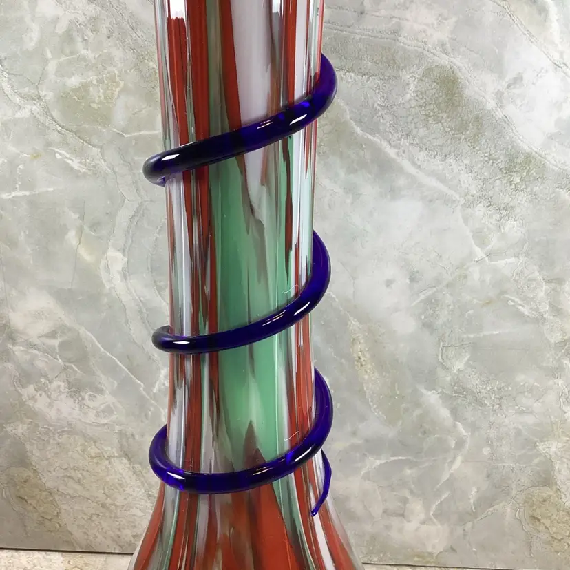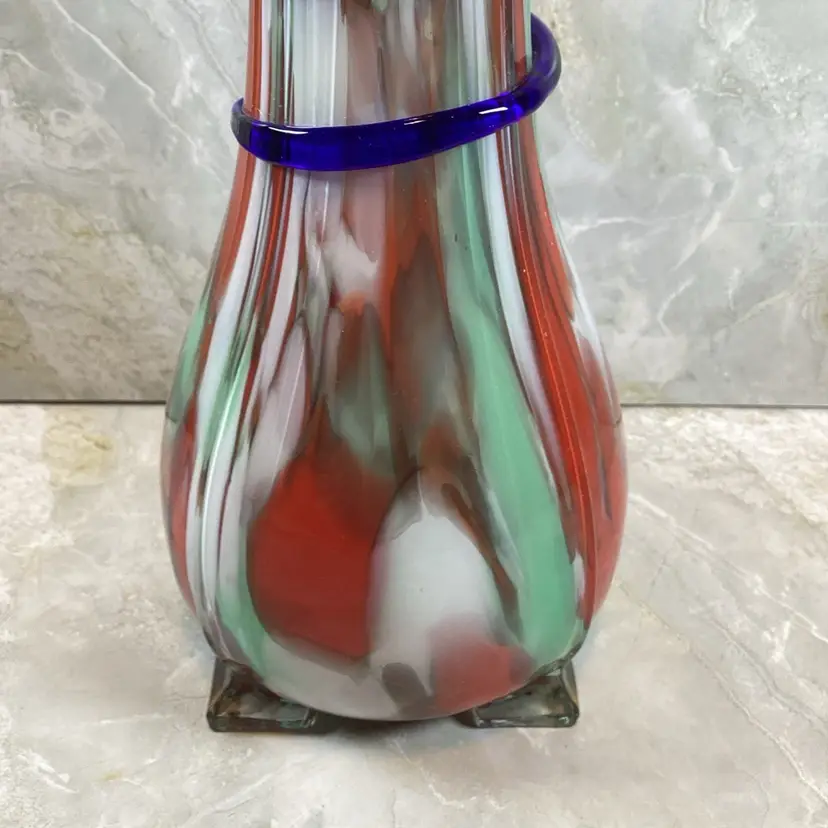 This vase is in excellent condition with no chips, cracks or repairs. There are a few rough spots especially where the blue coil was applied but this is typical for this type of vase, I mention it for accuracy. This is a beautiful art glass vase the red, mint green and blues in it. It has a ribbed texture to the surface. It is not signed or marked.