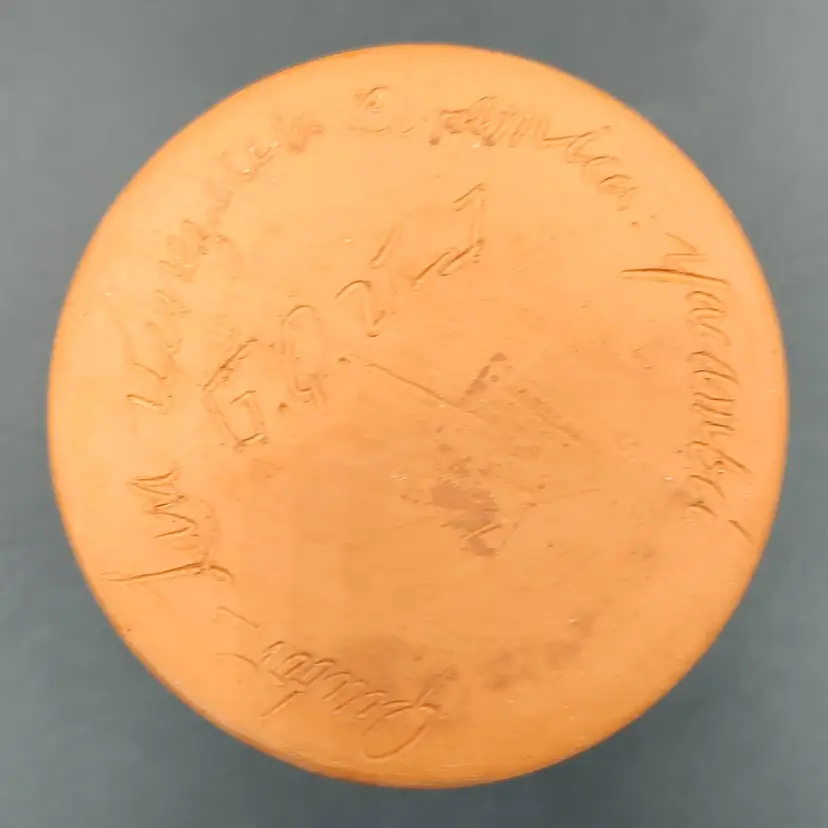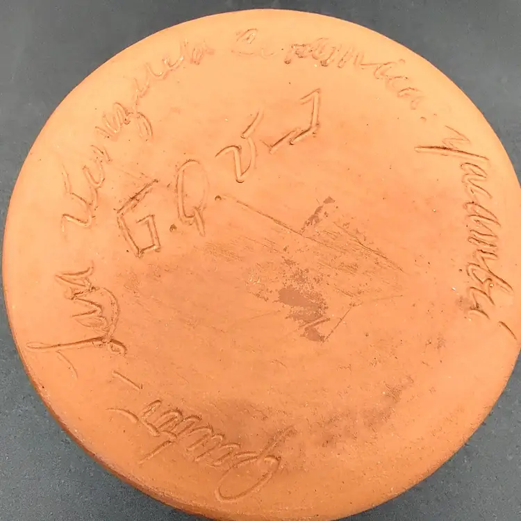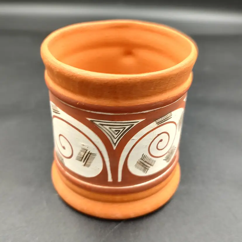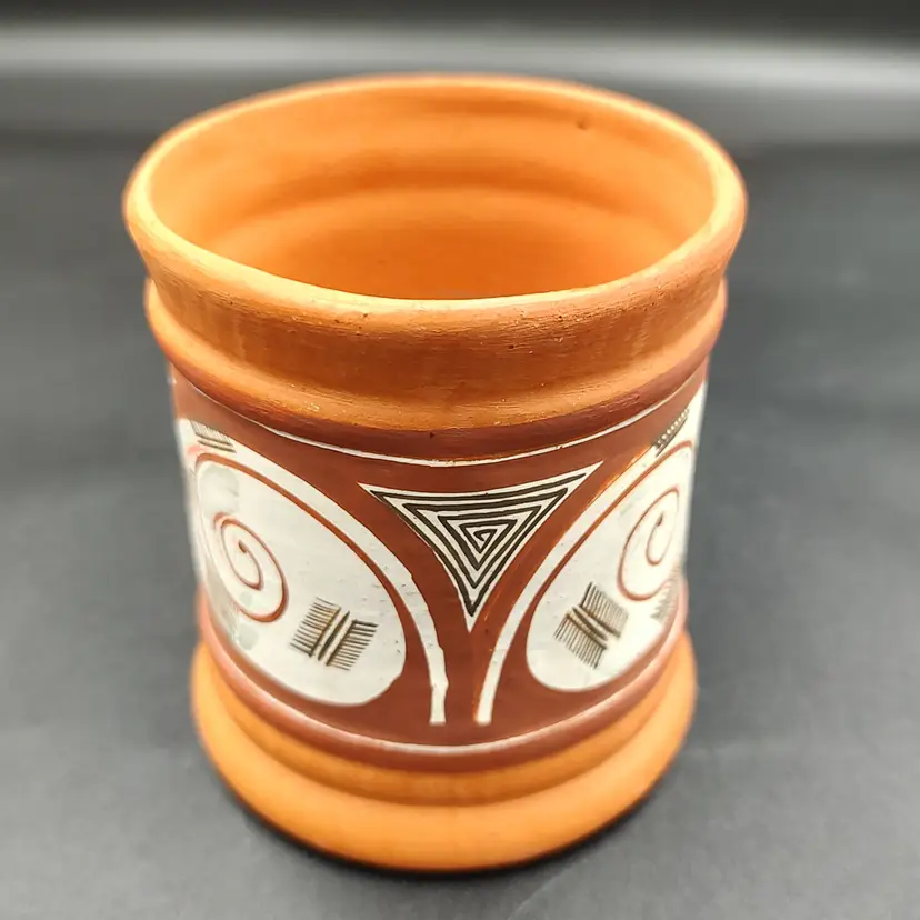 Venezuela Yacambu Hand Crafted and Painted Yacambu Art Pottery Signed By Artist Quibor Lara. Height 3. 8/16" x diameter 2. 75" Made in Venezuela