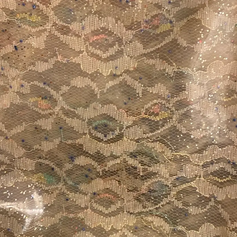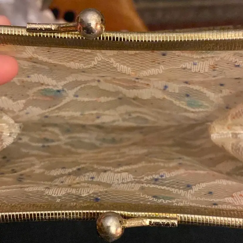 This mid century purse has the most adorable white lace trim with green, pink, yellow, and blue. It has multicolor sparkles throughout and also black matte sparkles. It has a lucite handle, a gold tone metal frame and a kiss style closure. It has plenty of room inside for your needs and is in great condition for its age!