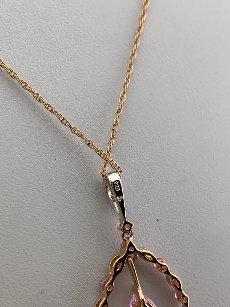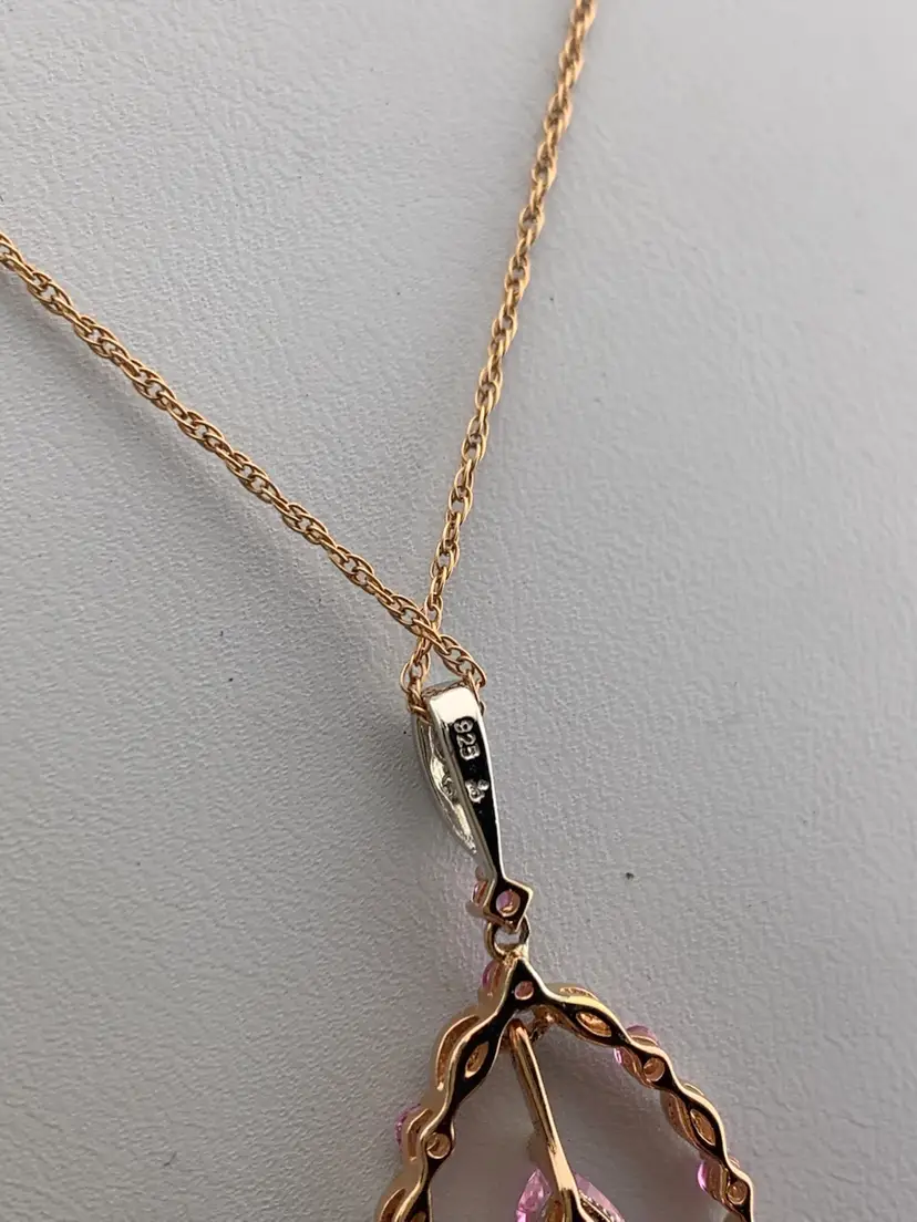 This is a Victoria Wieck pendant and chain. The pendant is marked 925 on the bail and the chain is marked 925 on the spring ring clasp. The dangle I simulated morganite. The chain is 18” long and the pendant is 1 3/8” long. This is in excellent condition. Please compare what is out there. This is a wonderful delicate piece.