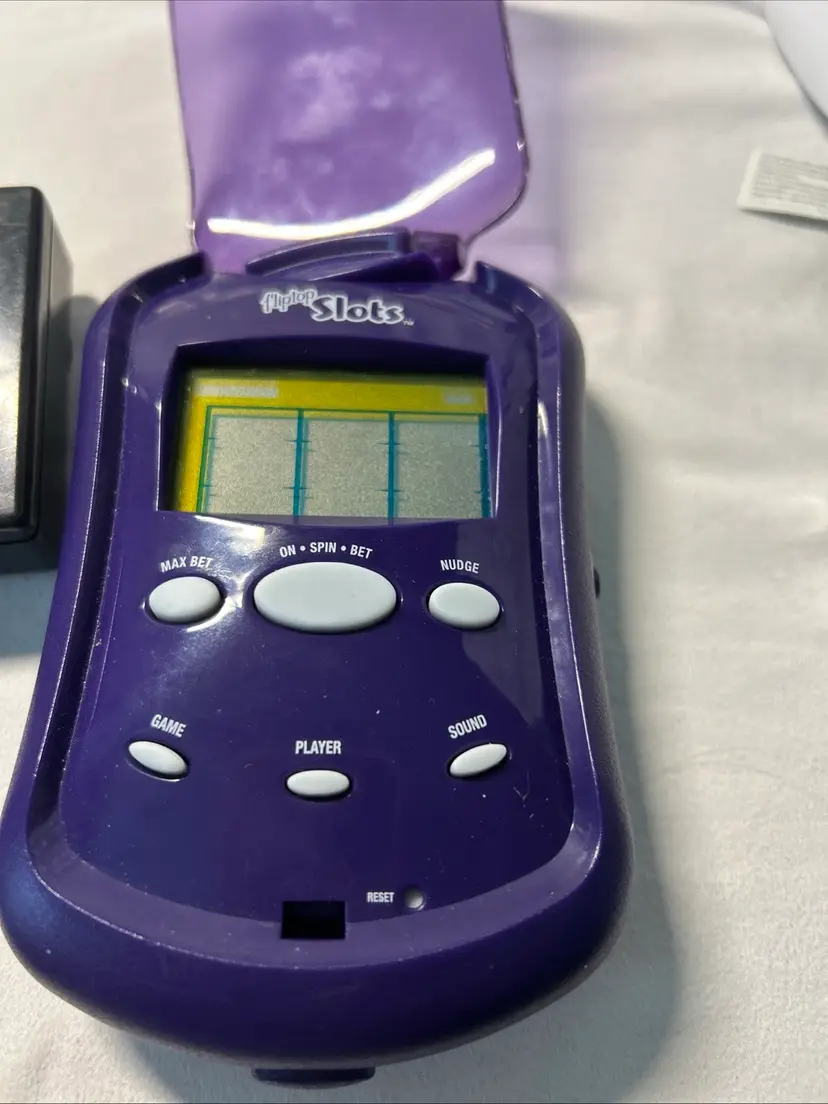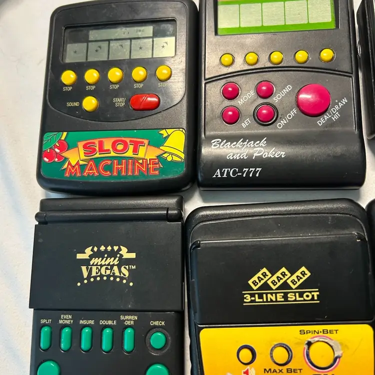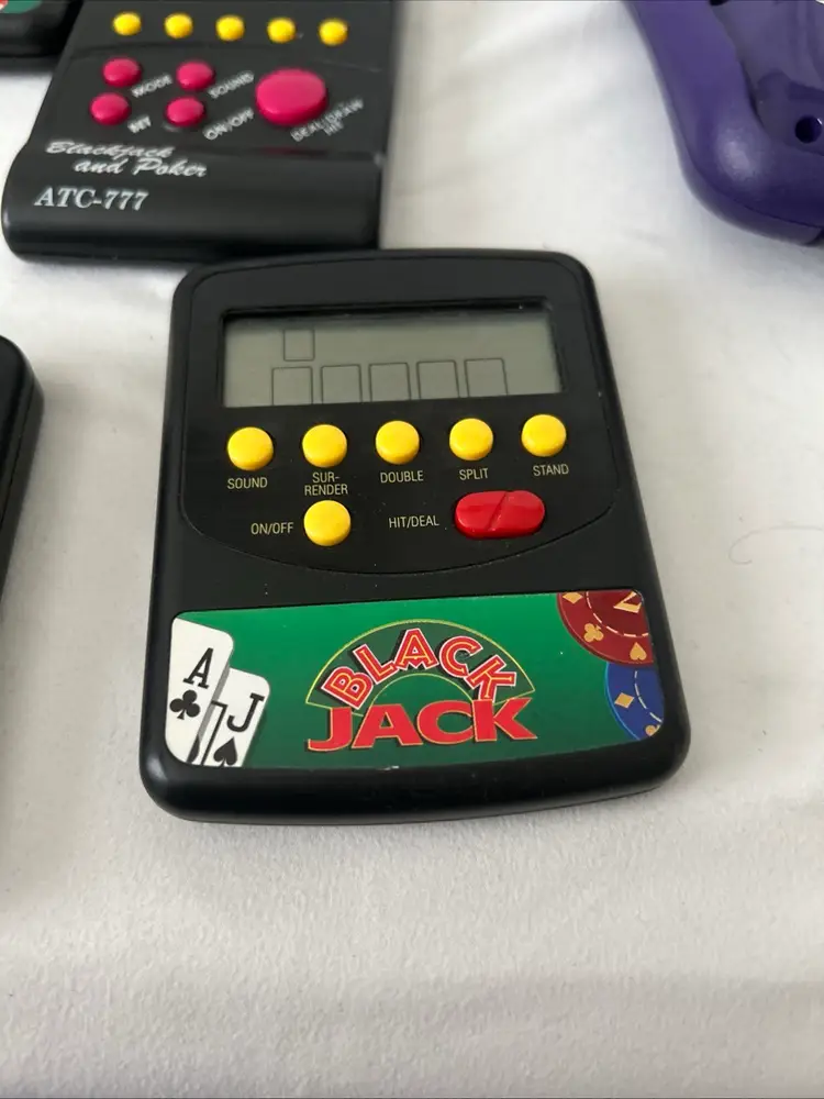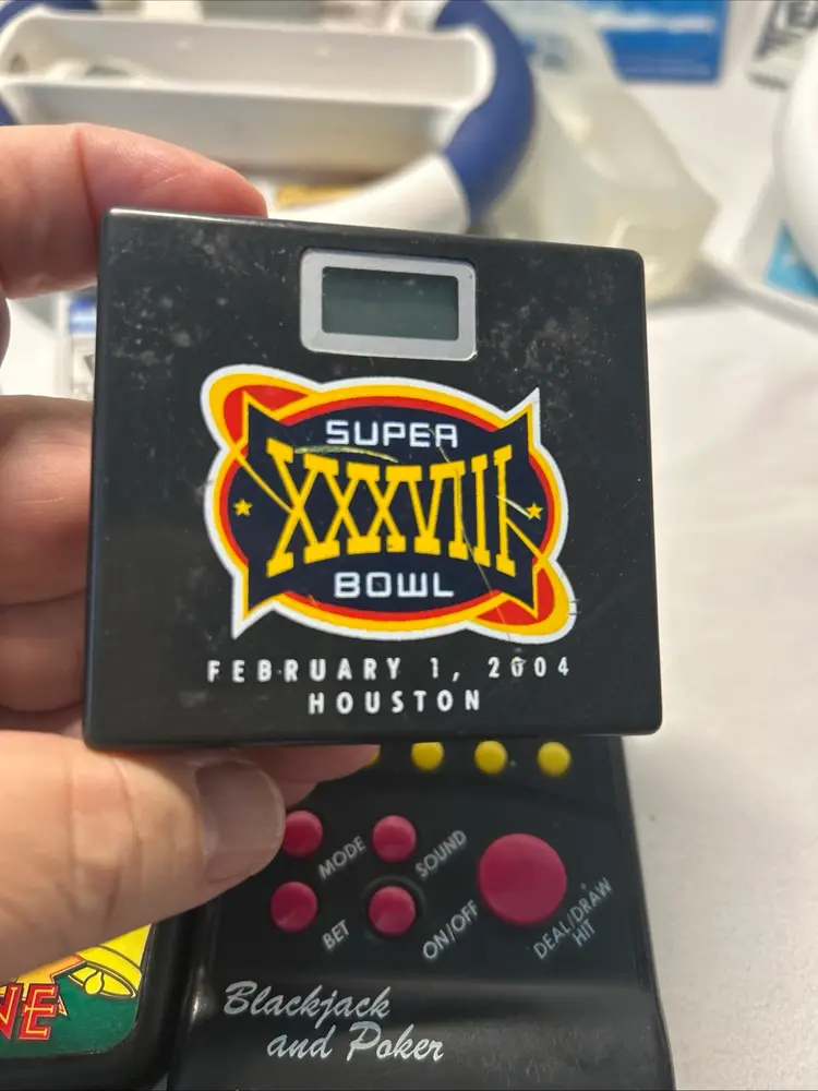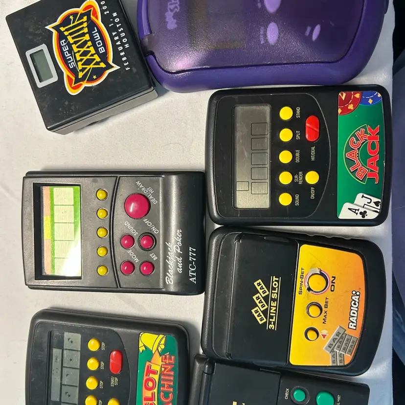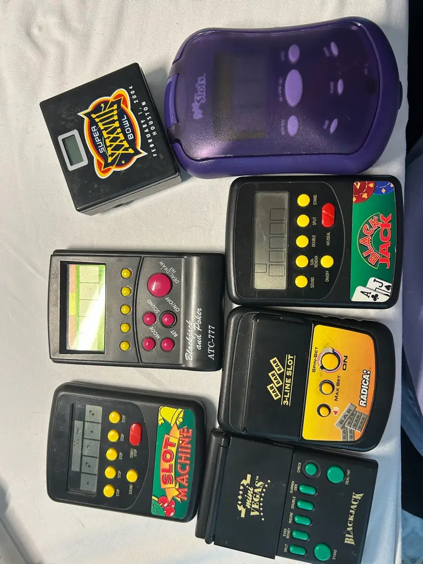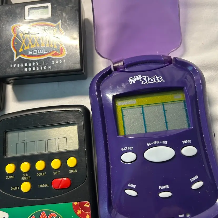 Handheld video games, two blackjack, one slot machine and a three line slot machine all turn on batteries, not included and a Super Bowl 37 turns on with batteries