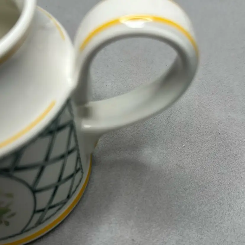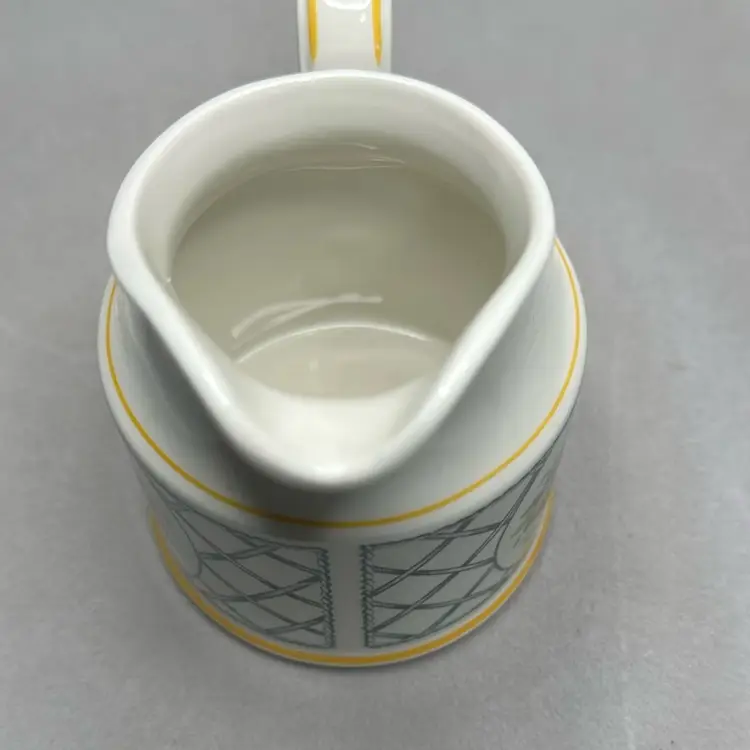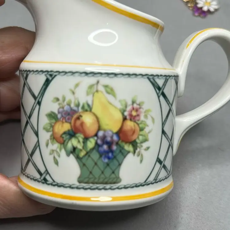 Small creamer measures 3.75 tall and is in the Basket patten. It is in excellent condition, no chip cracks or other issues.