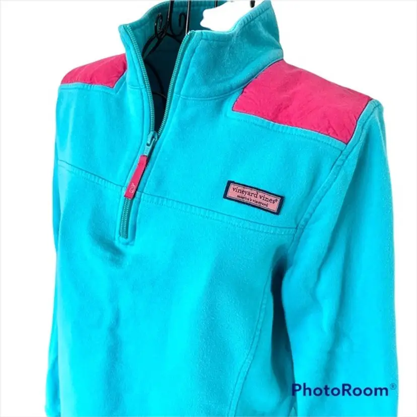 Robin egg blue with fuchsia pink color block shoulders Vineyard Vines Original Shep 1/4 zip fleece pullover. Boxy fit. Size M. Runs small. Please check measurements before purchasing. Approximate measurements: ♦️Armpit to armpit: 19 1/2” ♦️Length: 22” ♦️Sleeve: 22 1/2”