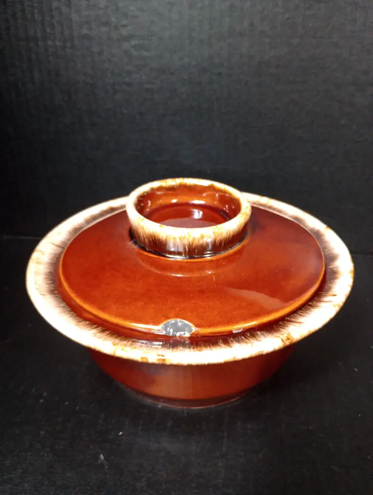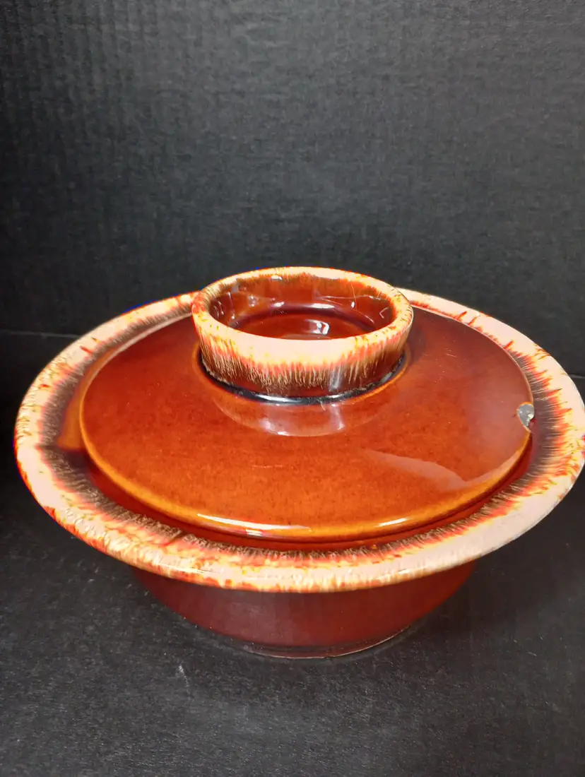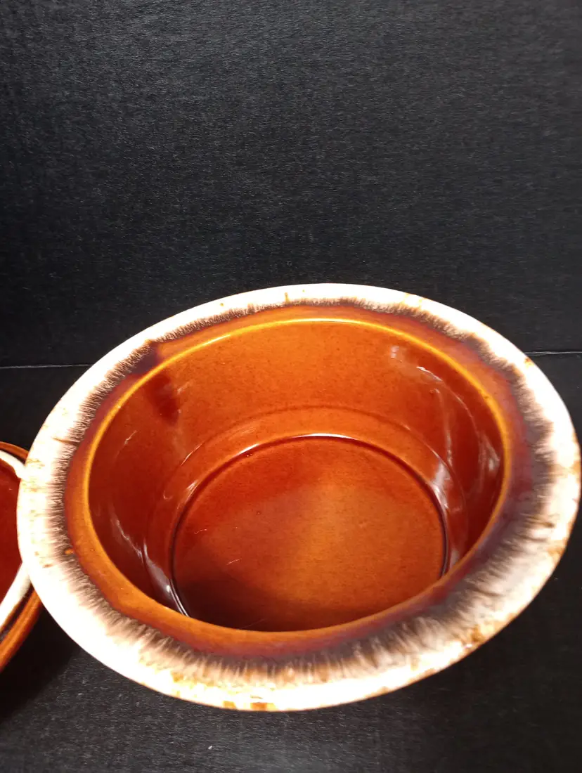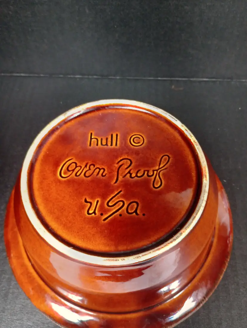 Vintage 1 qt Brown Drip Lidded Hull USA Oven Proof Round Casserole Dish Lid does have a chip but it doesn't affect the integrity of the dish. Please note chip in photos. Pieces are around 40 to 65 years old Review all photos as they are part of the condition and description