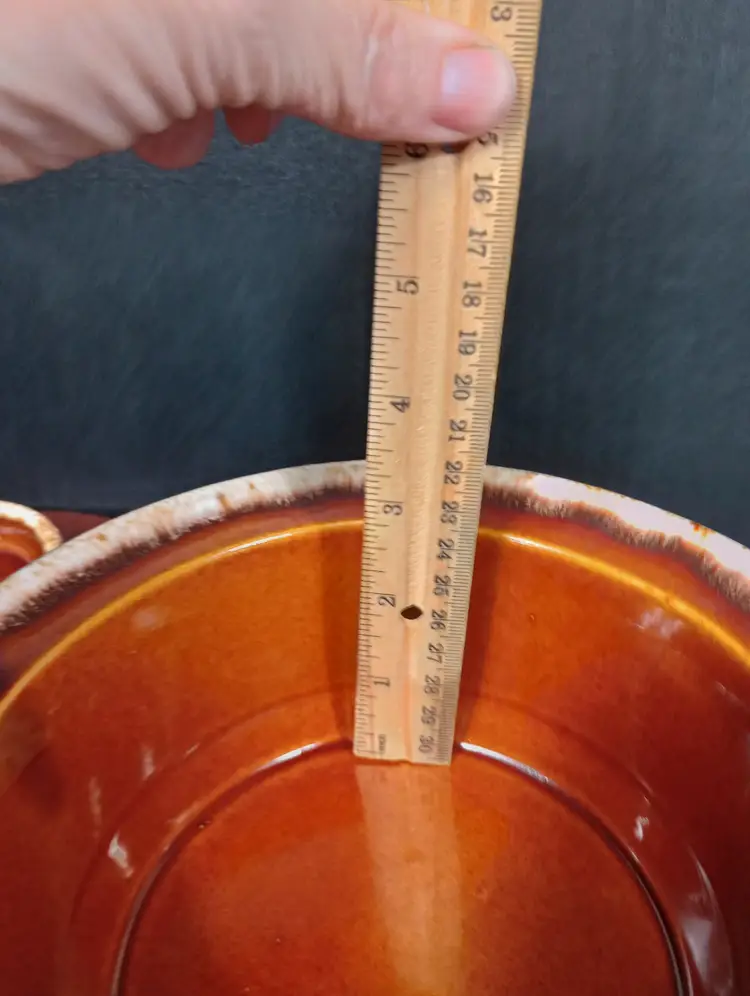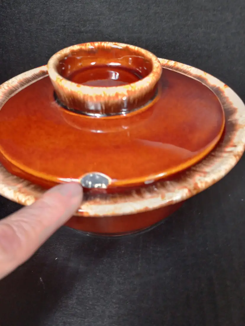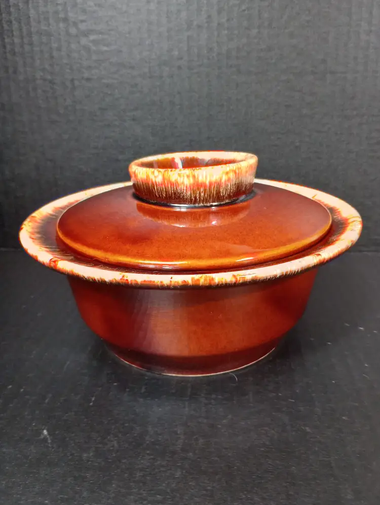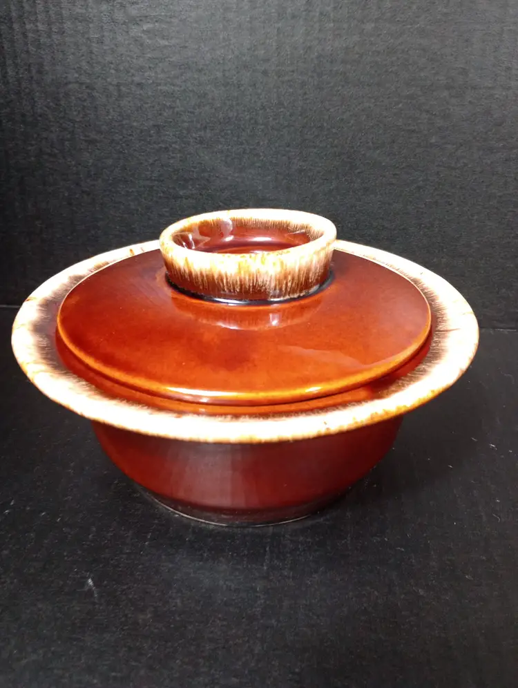 Vintage 1 qt Brown Drip Lidded Hull USA Oven Proof Round Casserole Dish Lid does have a chip but it doesn't affect the integrity of the dish. Please note chip in photos. Pieces are around 40 to 65 years old Review all photos as they are part of the condition and description
