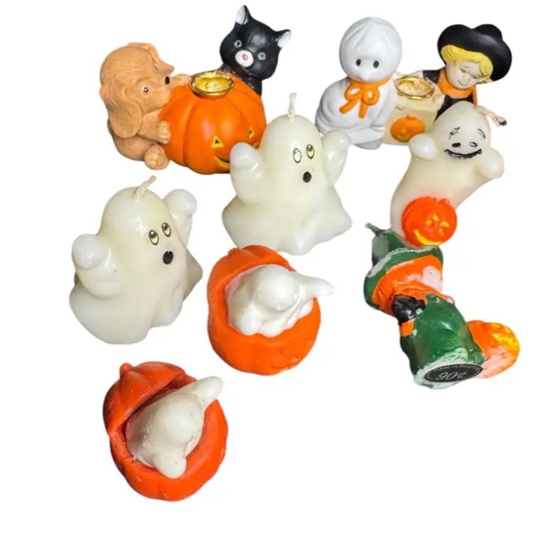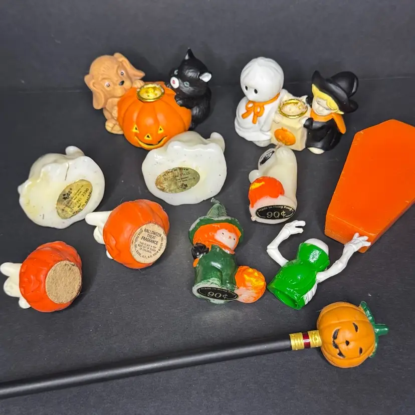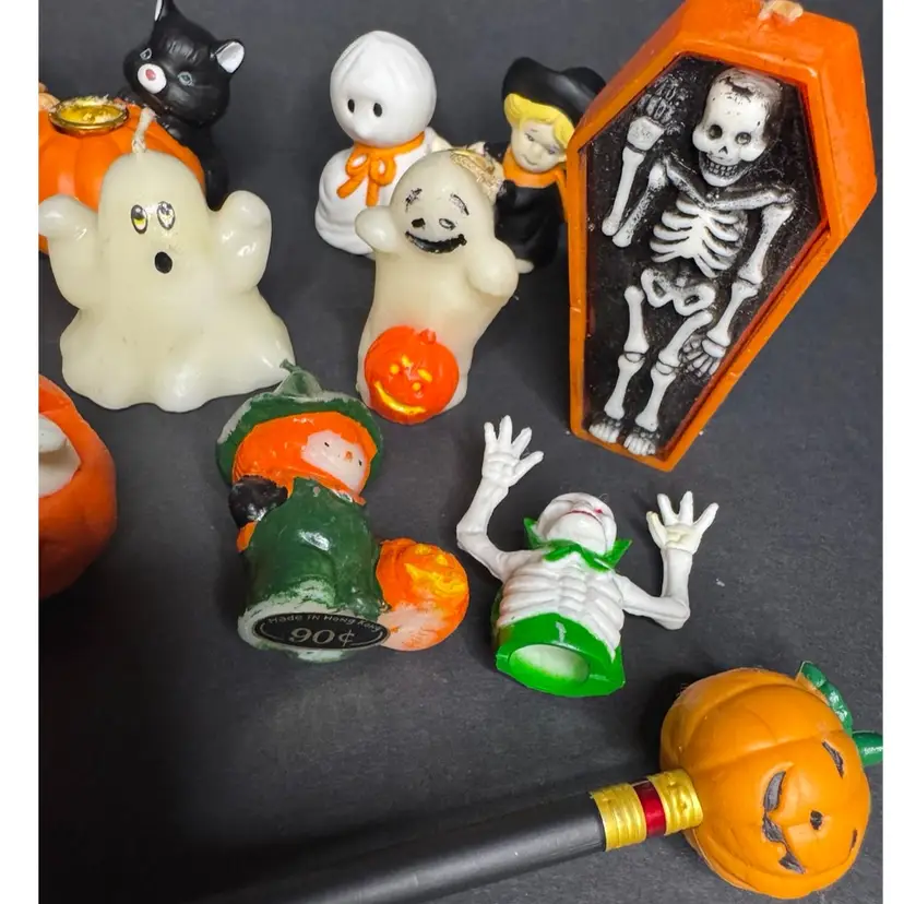 This is a great collection of vintage Halloween that you just can't find every day. It is an instant Halloween collection. -Two 1983 Avon Halloween treat Fragrance (no smell now) ghost in pumpkin -Two Russ, Made in Macau Ghosts -Two candle holders unmarked -Two Made in Hong Kong candles, boy in costume and ghost with pumpkin -Two pencil toppers, pumpkin and skeleton -One Coffin with skeleton