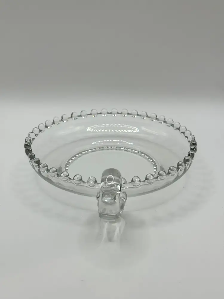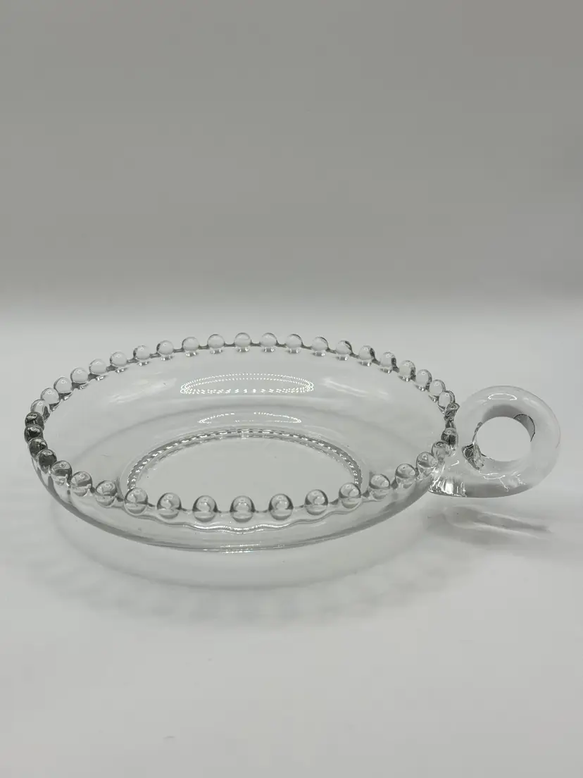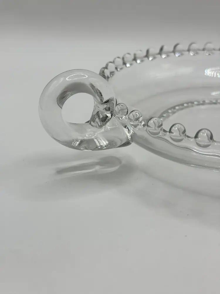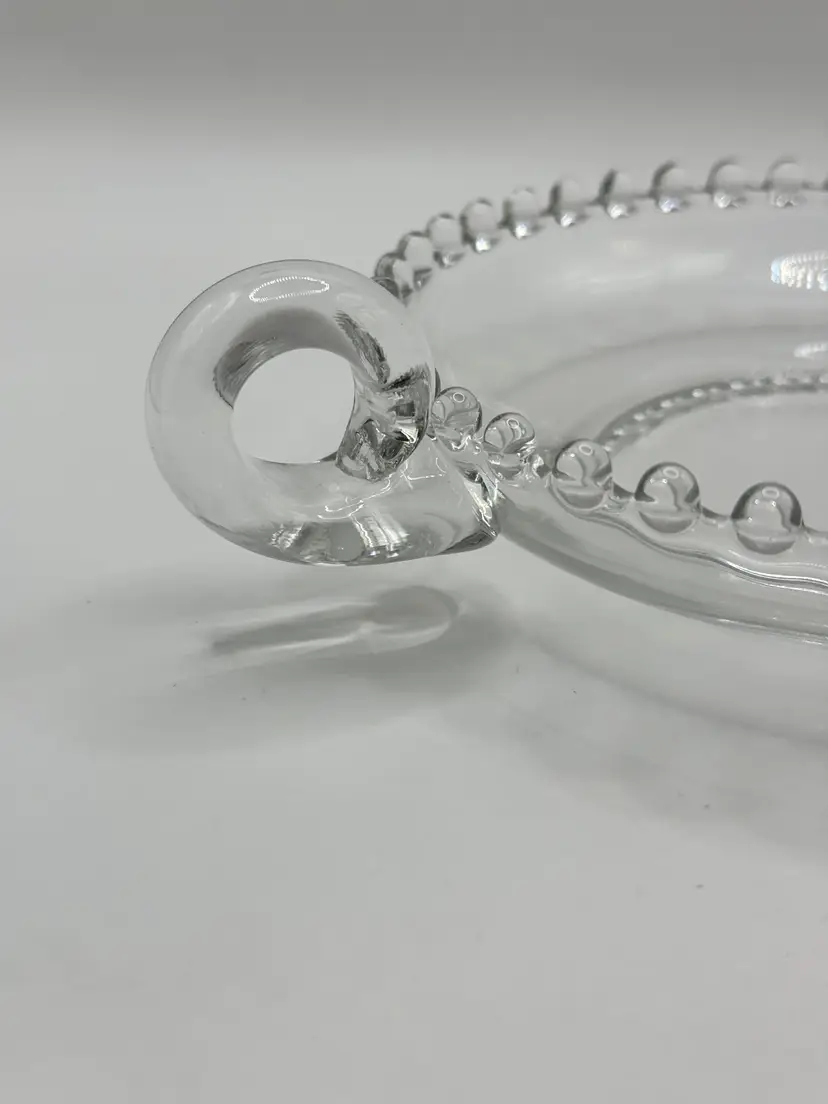 Serve up some retro charm with this vintage clear glass deviled egg plate, featuring a classic beaded edge design. Perfect for family gatherings or adding a touch of mid-century style to your kitchen decor. In excellent condition with no chips or cracks. Measures 7.5x1.5x3.75. Weighs 1lb.