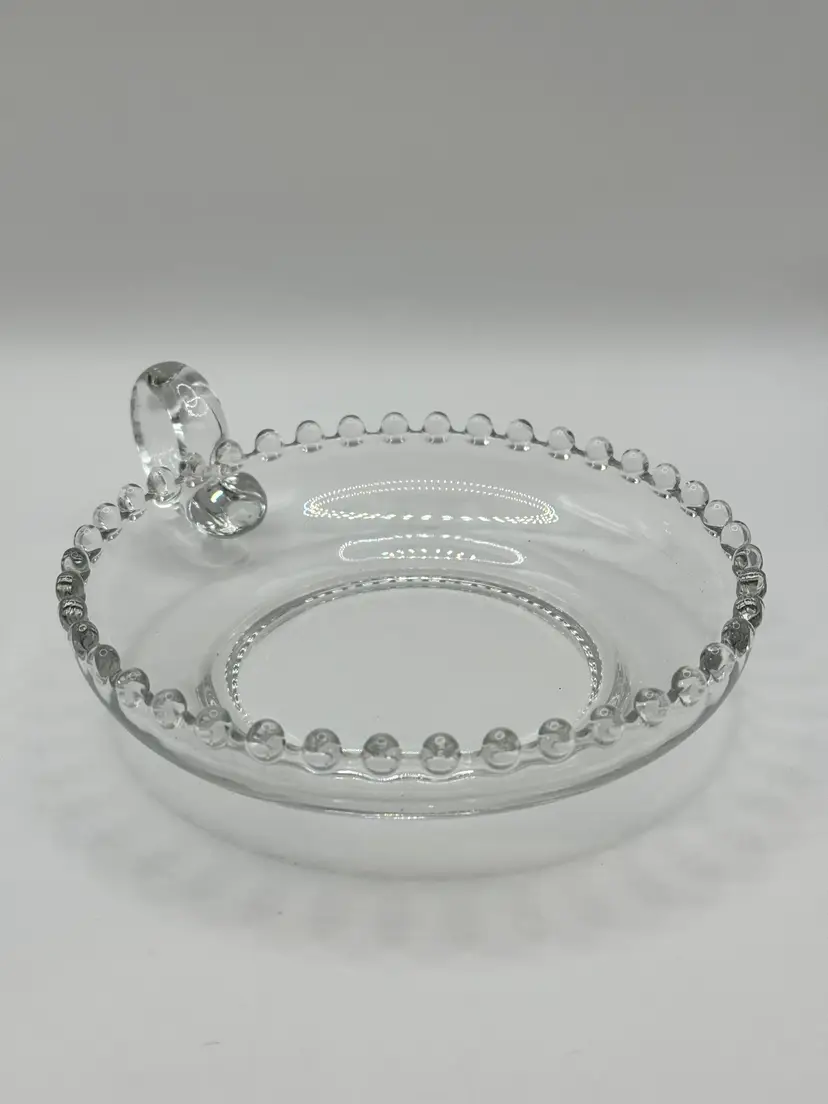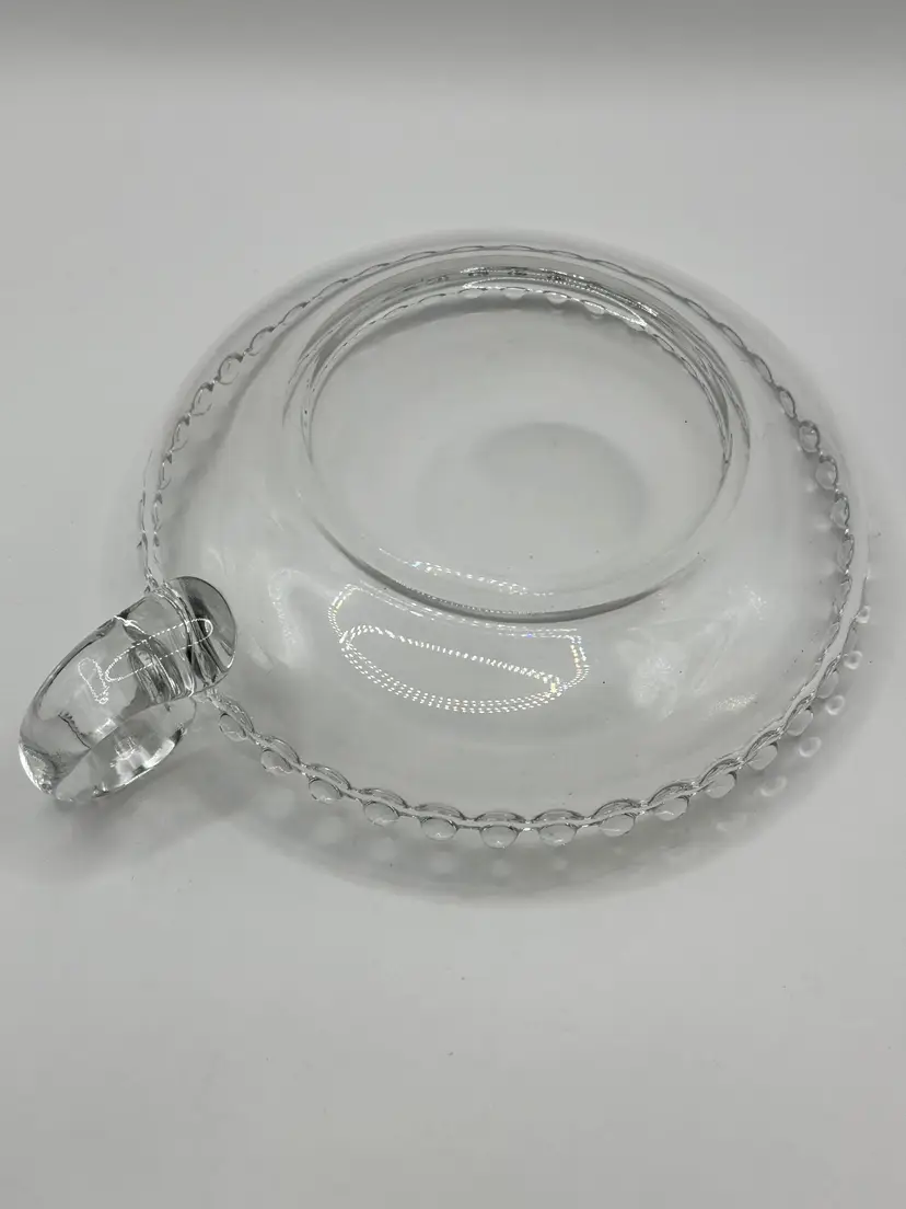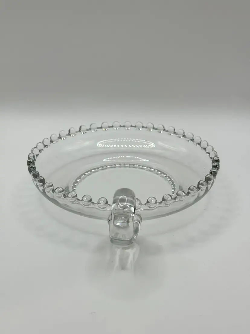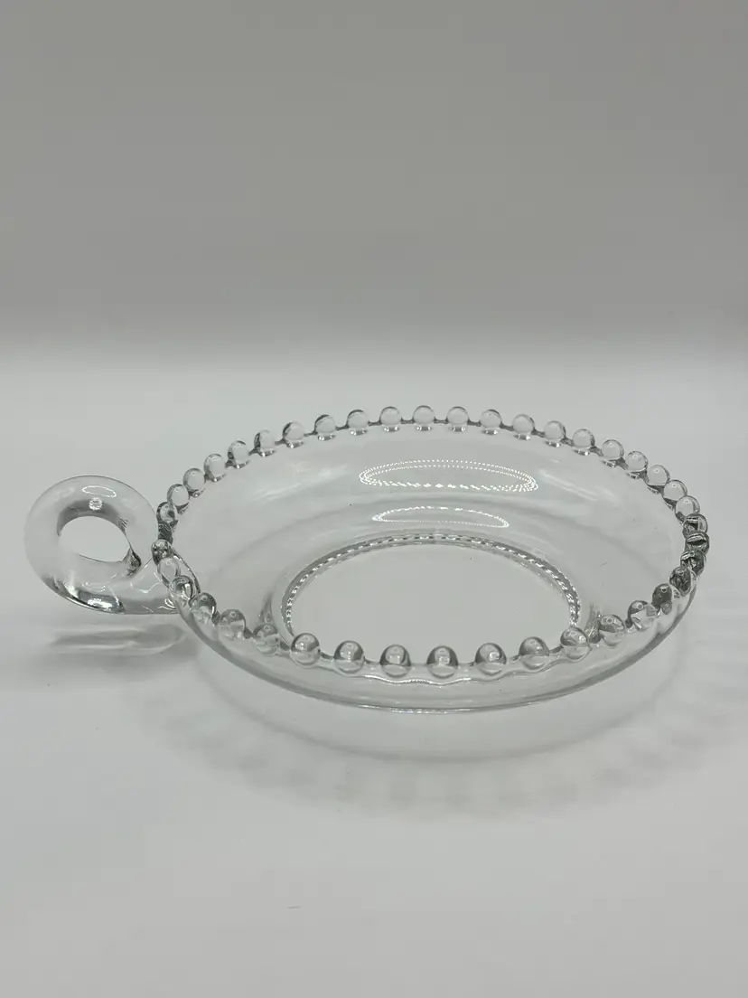Serve up some retro charm with this vintage clear glass deviled egg plate, featuring a classic beaded edge design. Perfect for family gatherings or adding a touch of mid-century style to your kitchen decor. In excellent condition with no chips or cracks. Measures 7.5x1.5x3.75. Weighs 1lb.