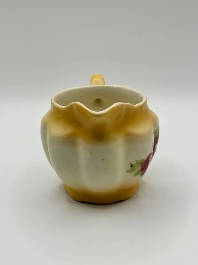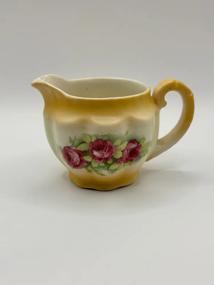 Add a touch of vintage charm to your kitchen with this delightful ceramic creamer pitcher, featuring a hand-painted rose design. Its quaint aesthetic is perfect for those who appreciate the beauty of yesteryear. In great condition with no chips or cracks, it's ready to be a part of your home's story. Measures 4x2.75x2.75. Weighs 1lb.