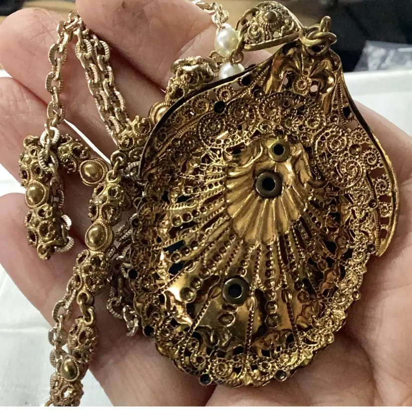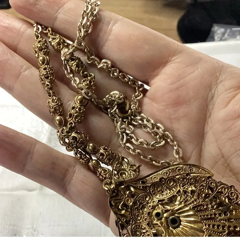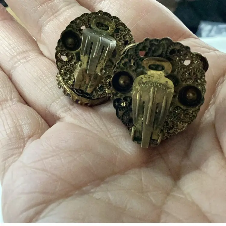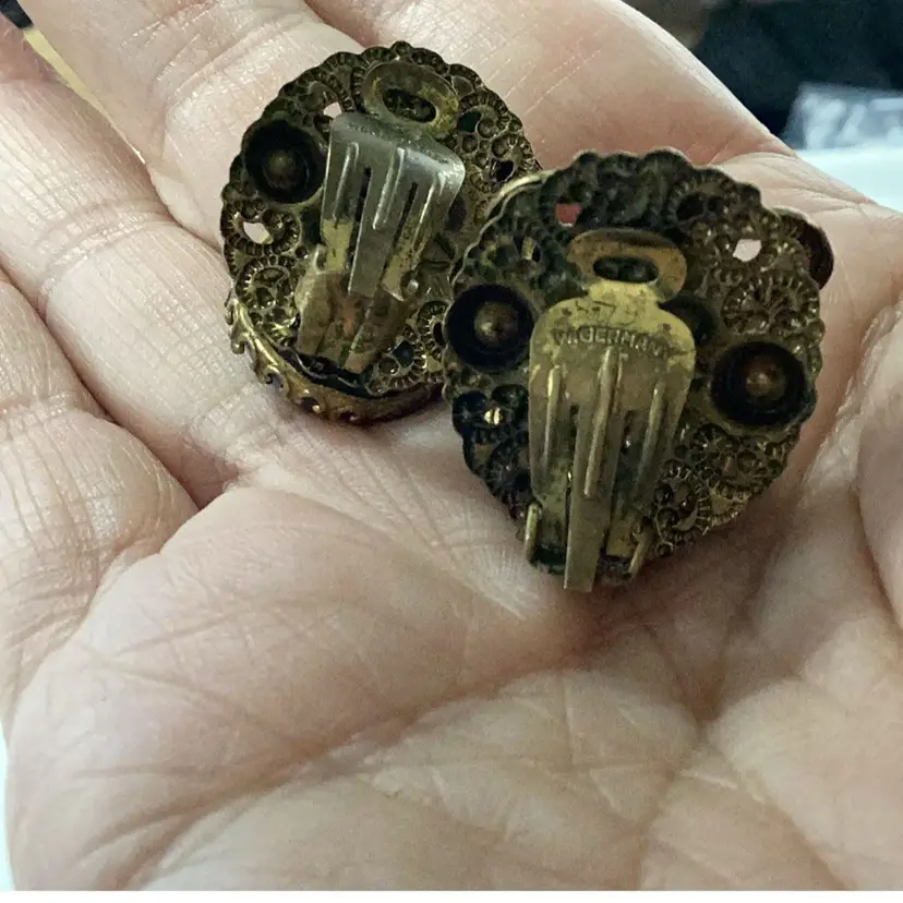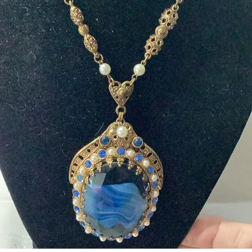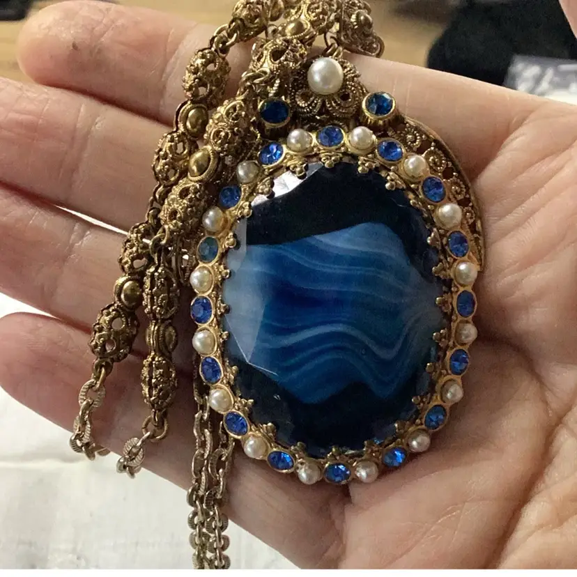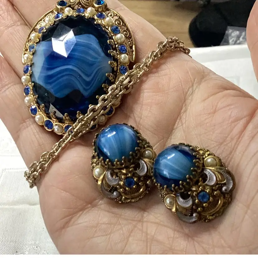 Great condition they are singed. Blue cabochon glass. Blue rhinestones and faux pearls. The upper part of the necklace chain has a lighter color, it might have been replaced at some point. Still a magnificent piece.
