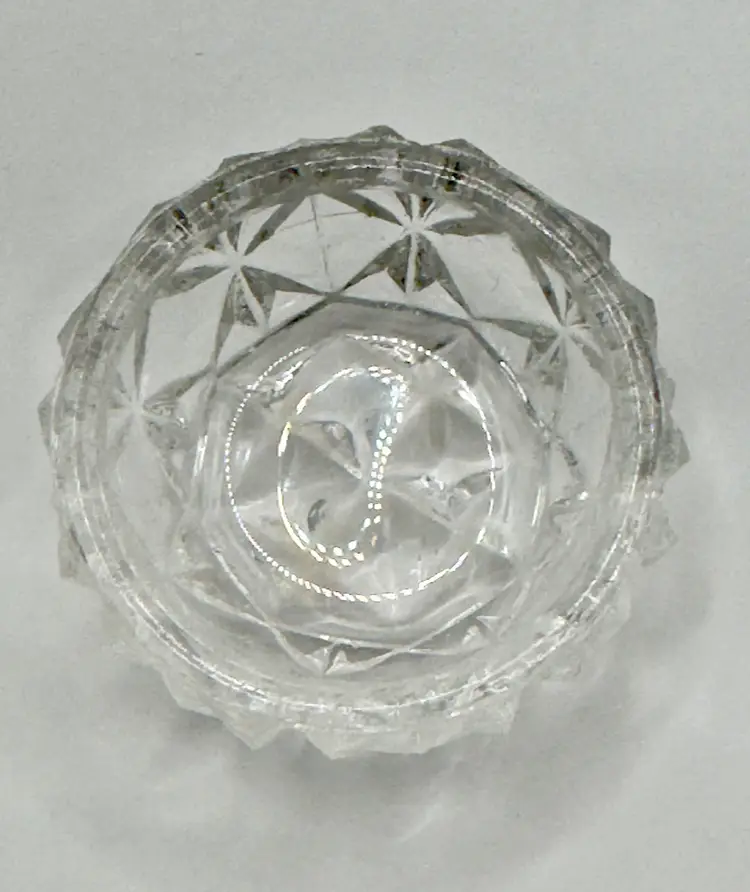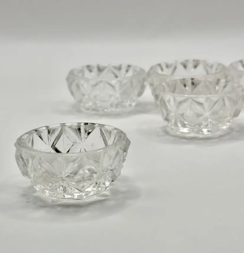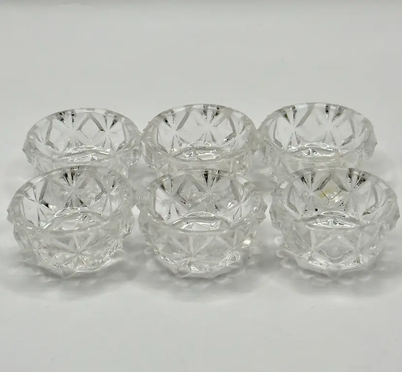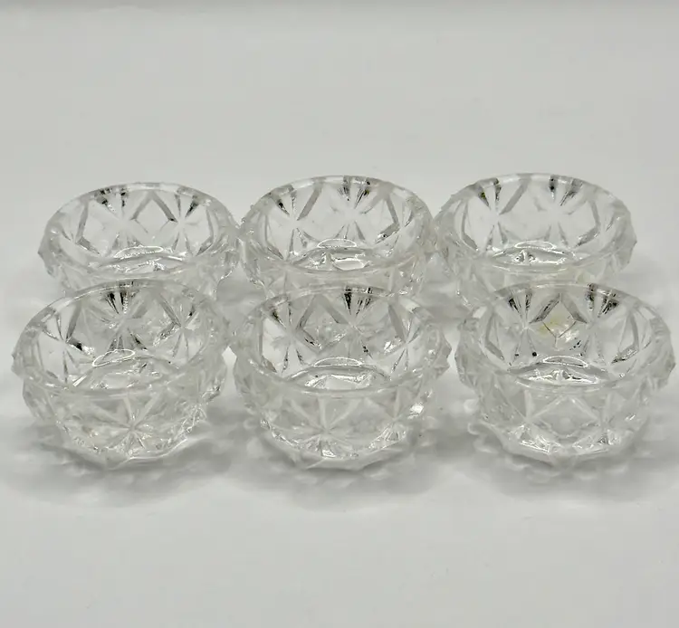 Add a touch of elegance to your dining table with this set of 6 vintage diamond cut glass salt cellars. These charming pieces feature intricate diamond patterns that catch the light beautifully. Perfect for collectors or as a unique addition to your table setting. Excellent condition with no chips or cracks. Measures.75x1.25 inches. Weighs 6oz.