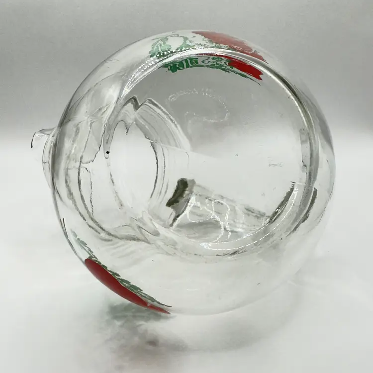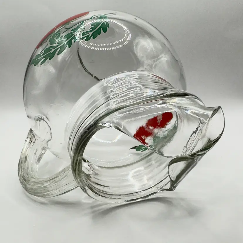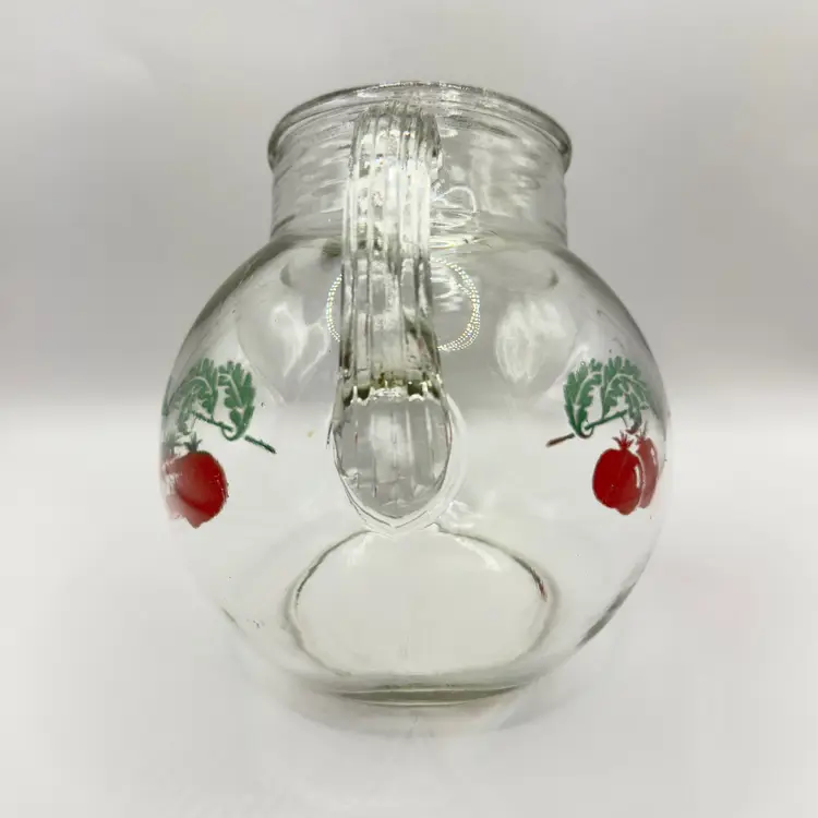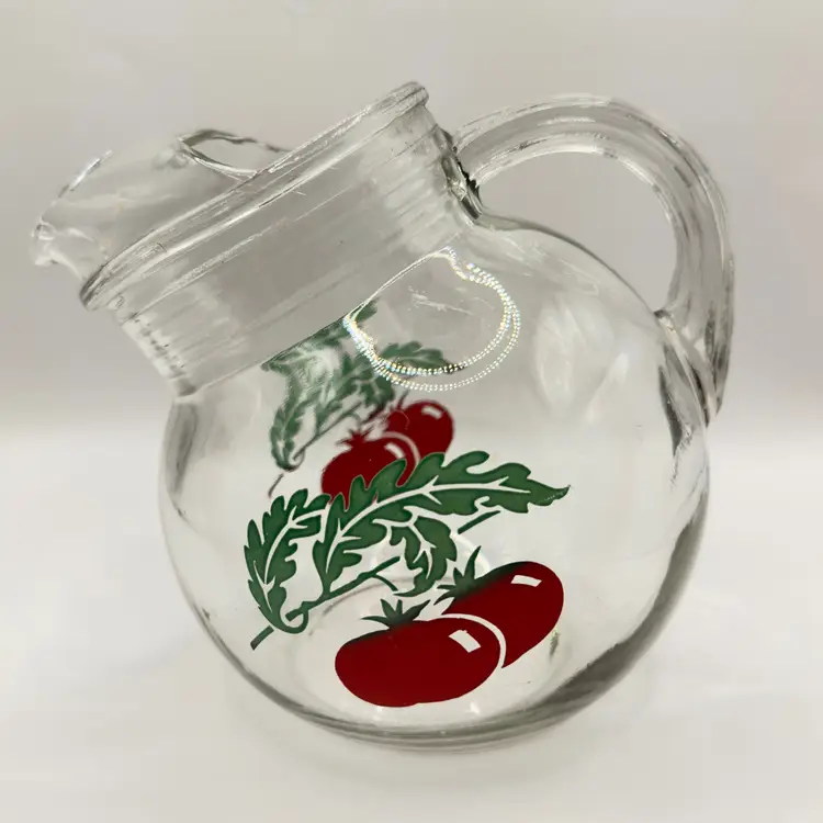 Add a splash of retro charm to your kitchen with this vintage glass pitcher featuring a delightful tomato design. Perfect for serving your favorite beverages or as a decorative piece. In excellent condition with no chips or cracks. Measures 6.5 inches. Weighs 3lbs.