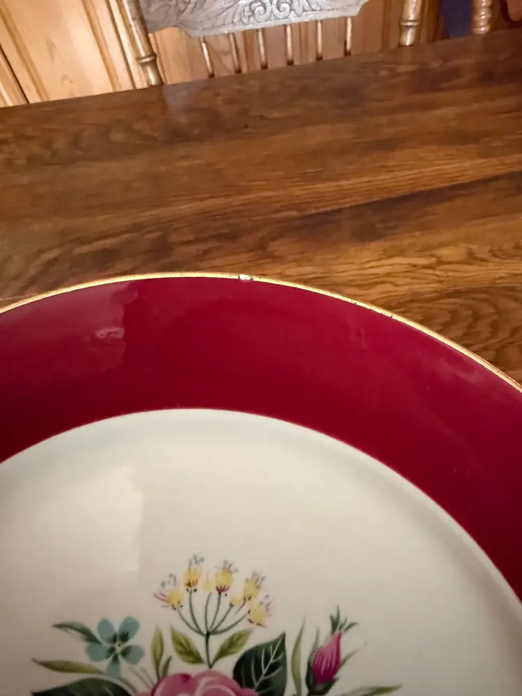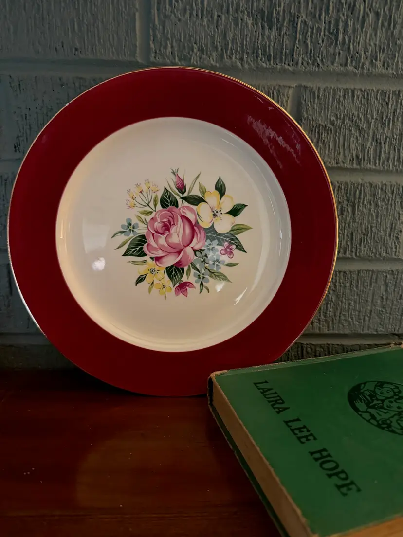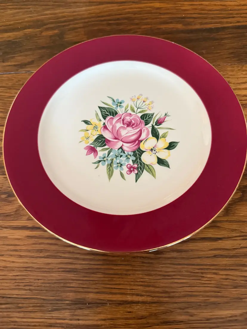 Add a touch of mid-century charm to your table with this lovely 9-inch Homer Laughlin plate, dated 1953. It features a vibrant burgundy rim with a gold edge and a colorful central floral bouquet of roses, yellow blossoms, and blue forget-me-nots. A timeless piece of American pottery perfect for display or replacement sets.