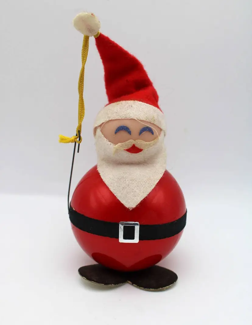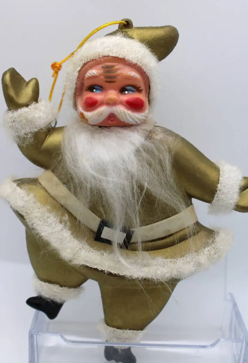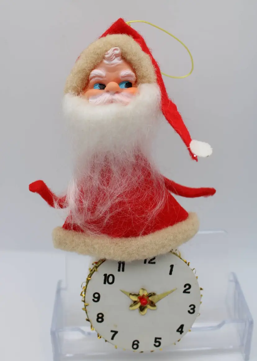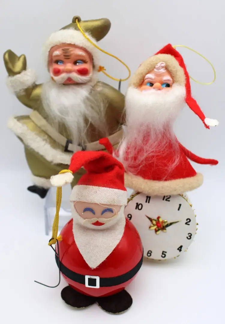 Set of three vintage Santa Claus tree ornaments. Features a plastic & felt, red and white Santa sitting on a Styrofoam clock, A golden-green, plastic "dancing" Santa, and a vintage plastic ball "Roly Poly" Santa Claus. Larger Santas measure 6" tall. Roly Poly Santa is 5 1/2" tall. They are pre-owned and therefore a little worn and dirty in spots, but no breaks or chips. They are really fun!