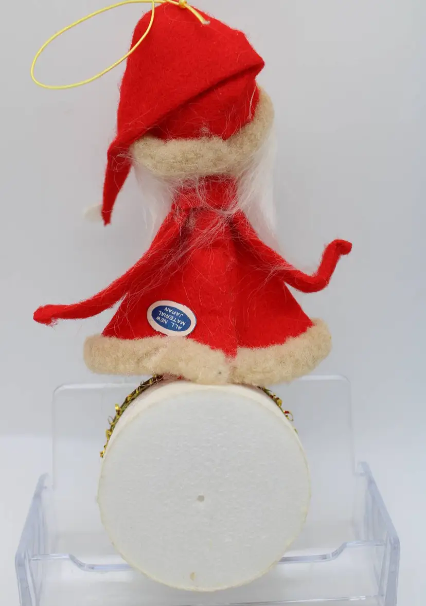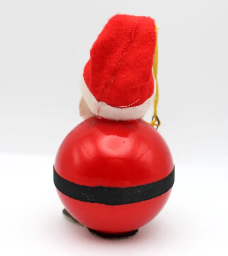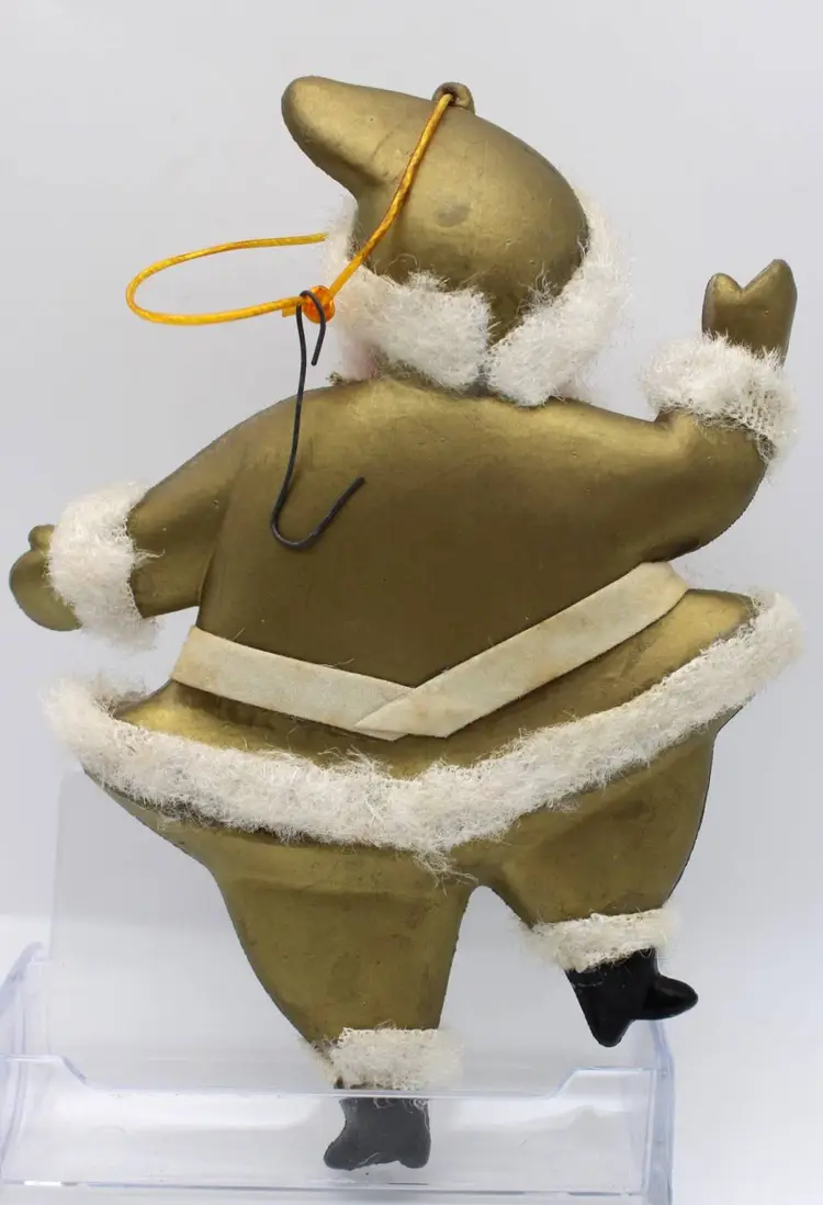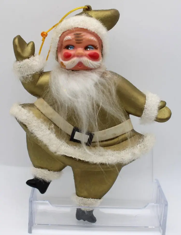 Set of three vintage Santa Claus tree ornaments. Features a plastic & felt, red and white Santa sitting on a Styrofoam clock, A golden-green, plastic "dancing" Santa, and a vintage plastic ball "Roly Poly" Santa Claus. Larger Santas measure 6" tall. Roly Poly Santa is 5 1/2" tall. They are pre-owned and therefore a little worn and dirty in spots, but no breaks or chips. They are really fun!