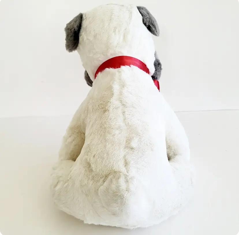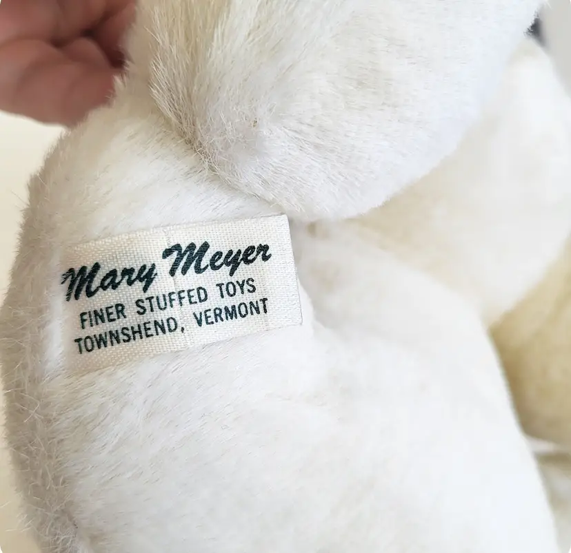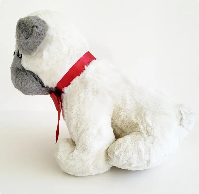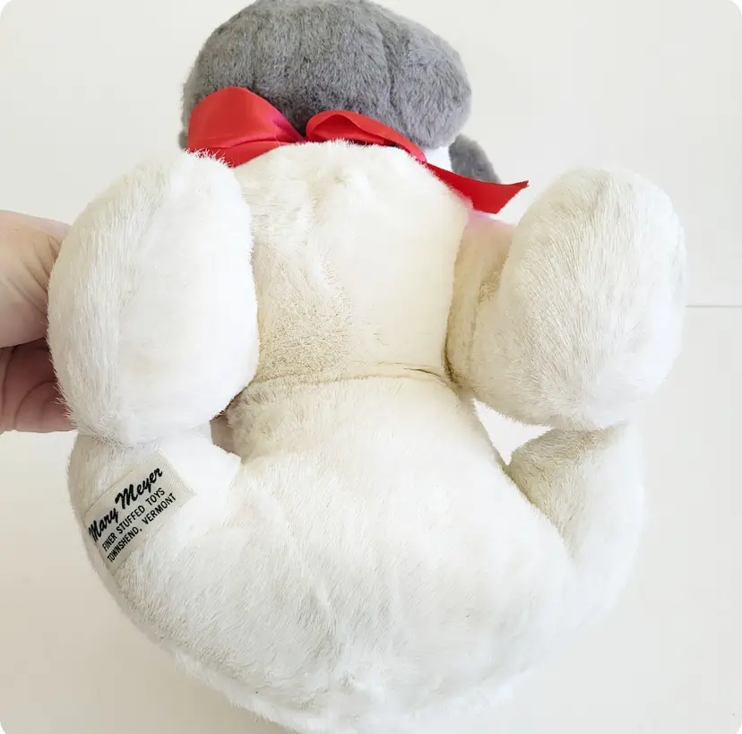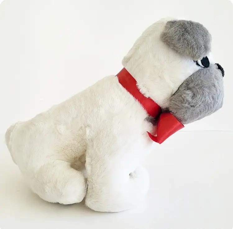 Vintage 1960s Mary Meyer plush bulldog. See all photos! Very clean, minimal wear. No holes or smells. Has original red ribbon bow. Felt eyes and mouth. Pompom nose. Original tag. Measures 10 in x 10 in x 7.5 in.