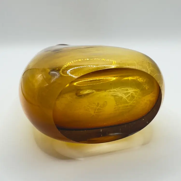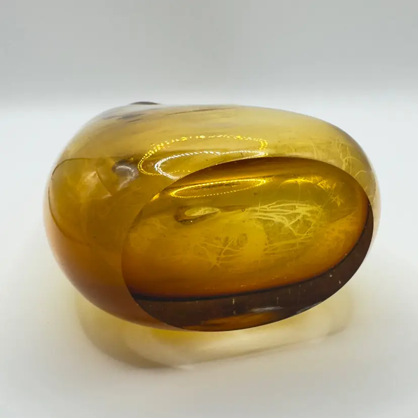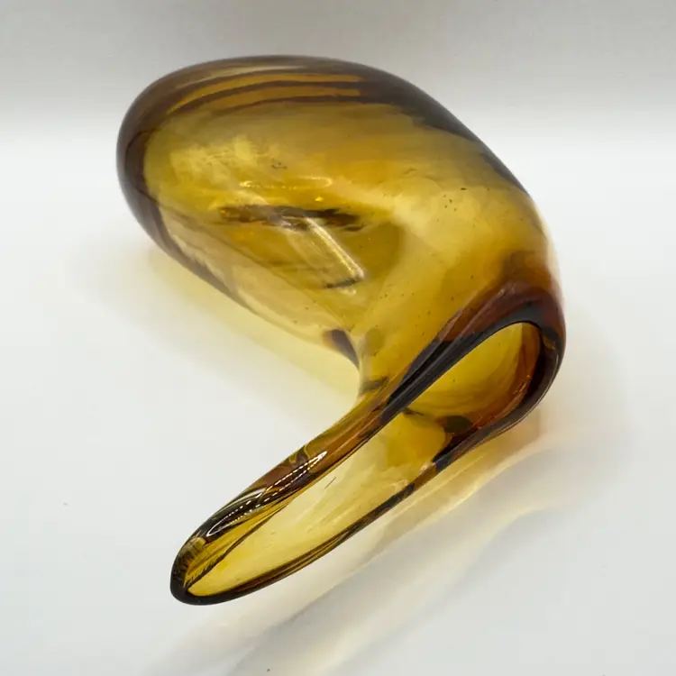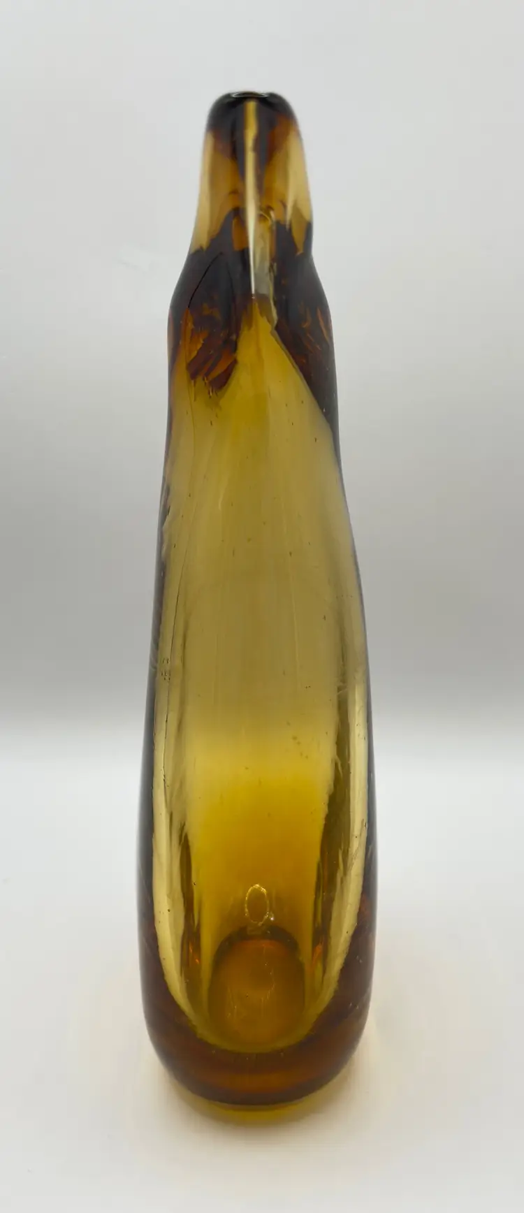Elevate your space with this stunning mid-century amber swung glass vase. Its unique shape and warm hue make it a perfect centerpiece for any room. In excellent condition with no chips or cracks. Measures 9 inches. Weighs 3lbs.
