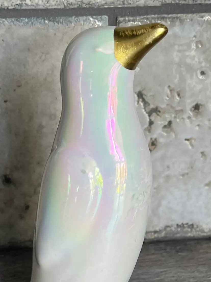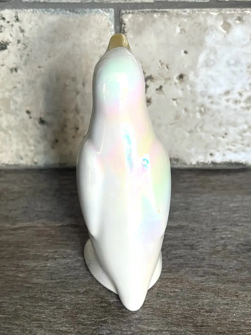 A adorable ceramic penguin from the middle century. Iridescent. He stands 5 inches tall and 2 inches wide. Fun to display for the winter and/or Christmas.