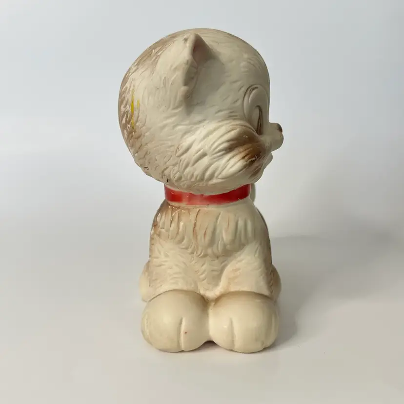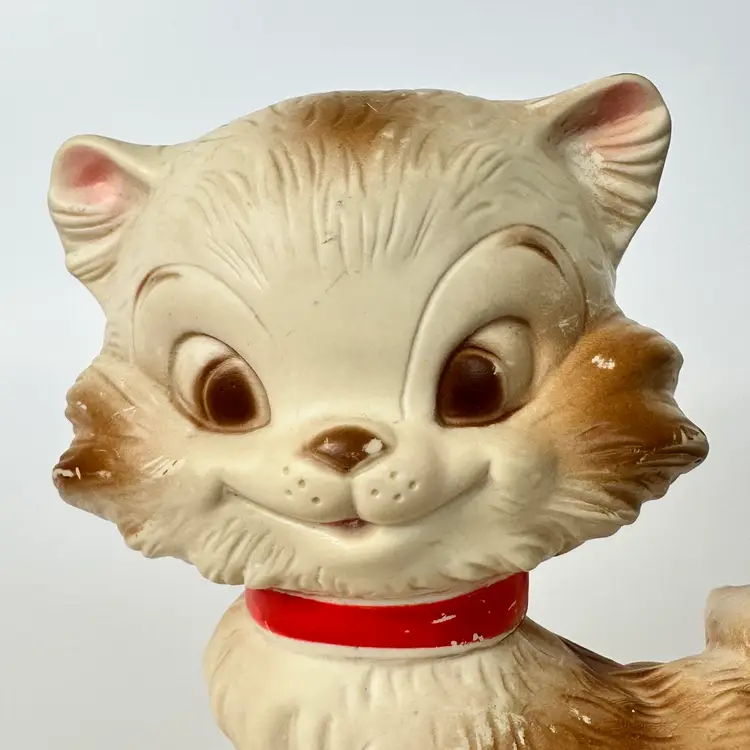 The Vintage 1968 J.L. Prescott Kitty Cat Rubber Squeak Toy is a charming and kitschy piece that is sure to bring joy to any collector of vintage toys. Made in the United States, this cute toy features a character from the Kitties family and is guaranteed to squeak with delight. Perfect for those who appreciate nostalgic and unique toys from the past, this vintage treasure is a sweet reminder of simpler times in the 1960s.