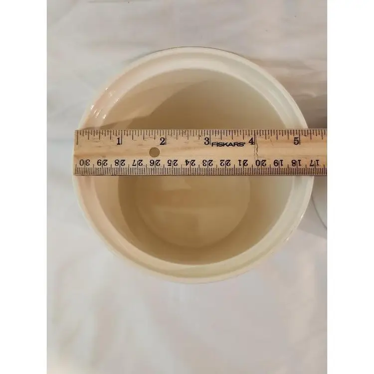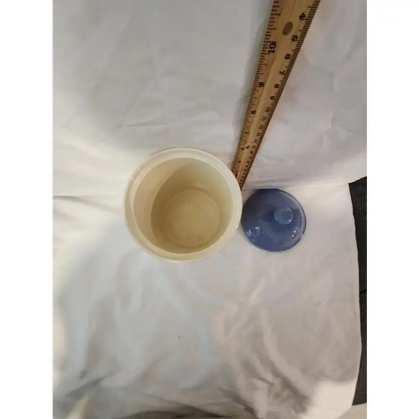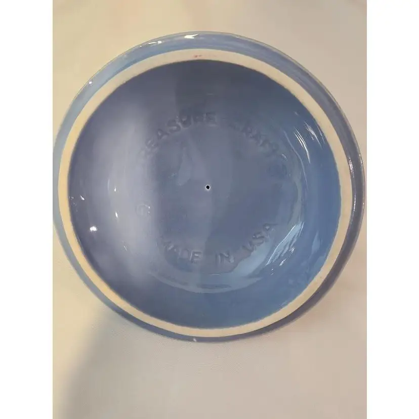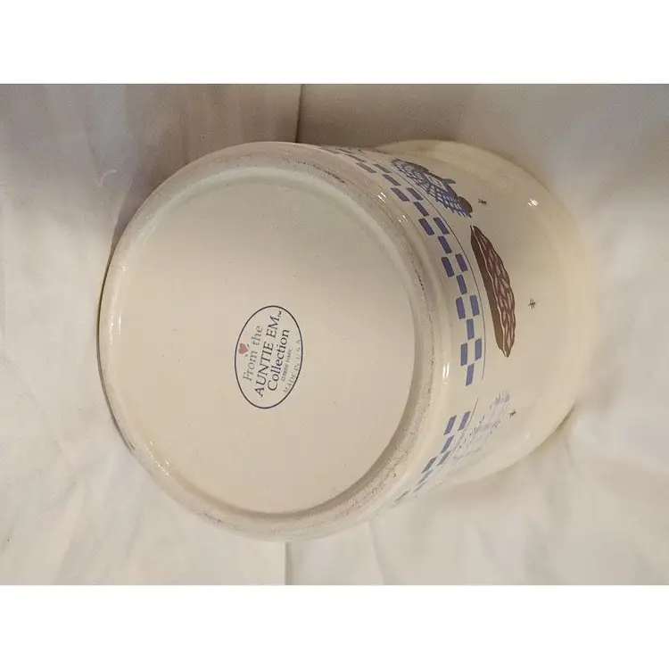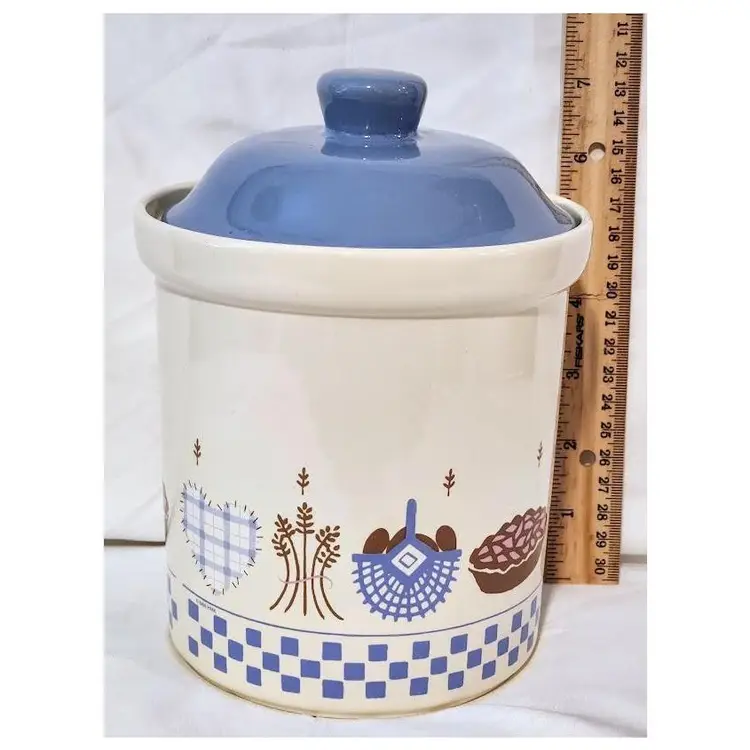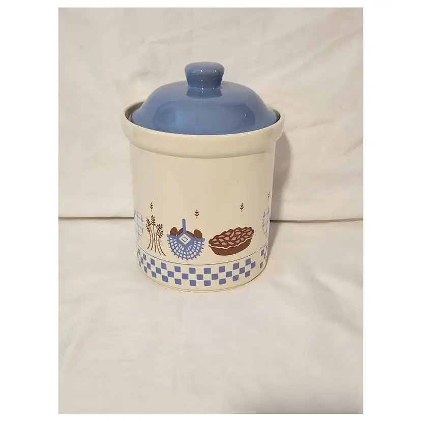 Add a touch of nostalgia to your kitchen with this charming vintage stoneware cookie jar. Featuring a classic blue and white design with delightful kitchen motifs, it's perfect for storing your favorite treats or as a decorative piece.