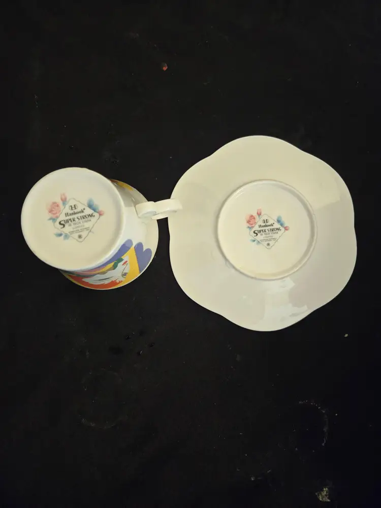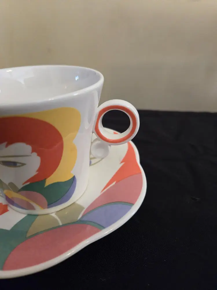 This very unique teacup or cappuccino cup and saucer is a wonderful 80s design by (Larry Laslo) Hankook Saint James. The face is of the Art Deco era which is neutral and striking. The plate or saucer does not have the usual indent of a saucer which isn't unusual for 80s design.