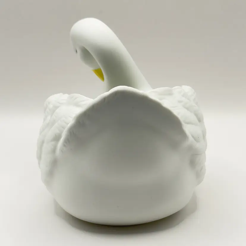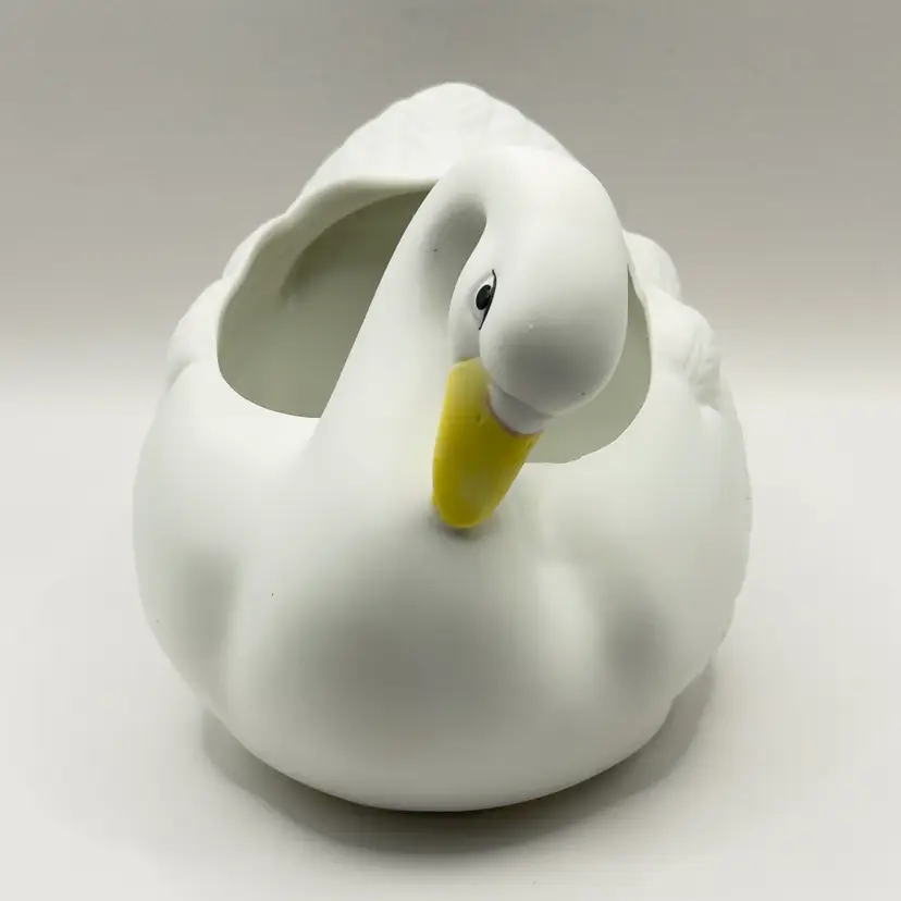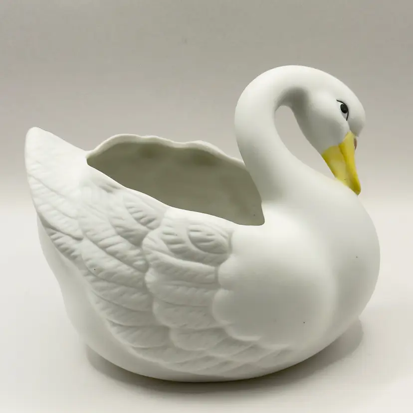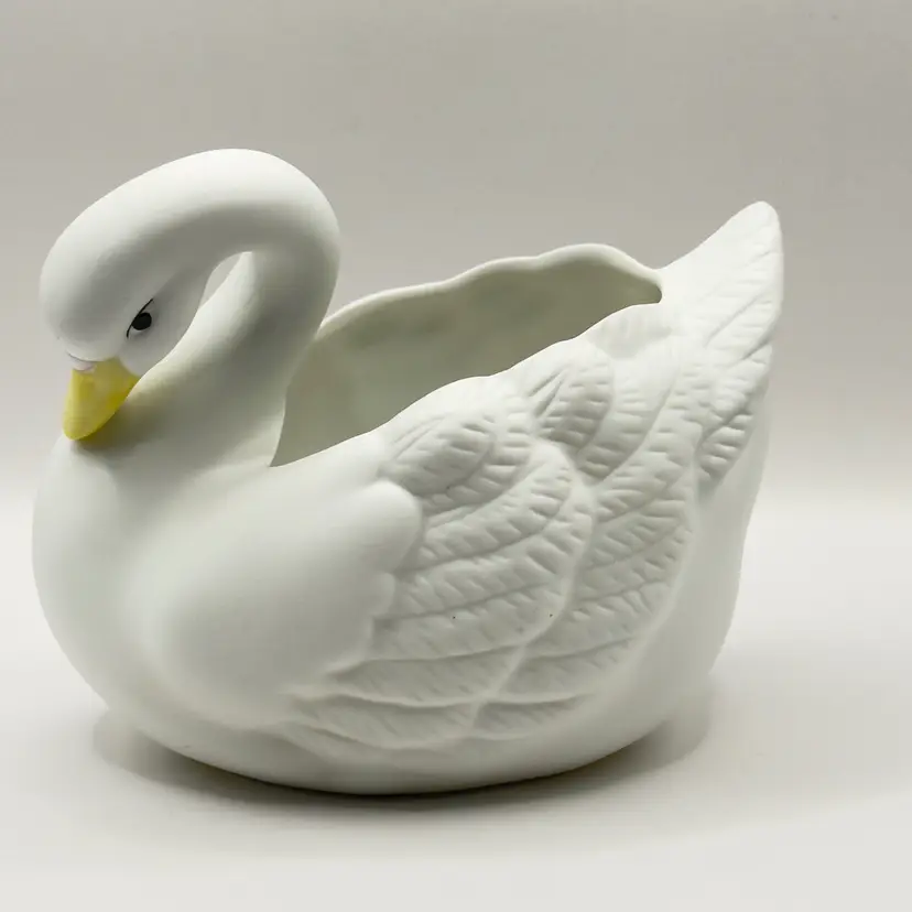 Add a touch of elegance to your home with this vintage white bisque swan planter. Crafted from ceramic, its graceful design and detailed feather texture make it a charming addition to any space. Perfect for displaying your favorite plants or as a standalone decorative piece. In excellent condition with no chips or cracks. Measures 5.5x4.5x4.25 inches. Weighs 1lb.