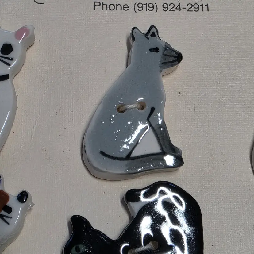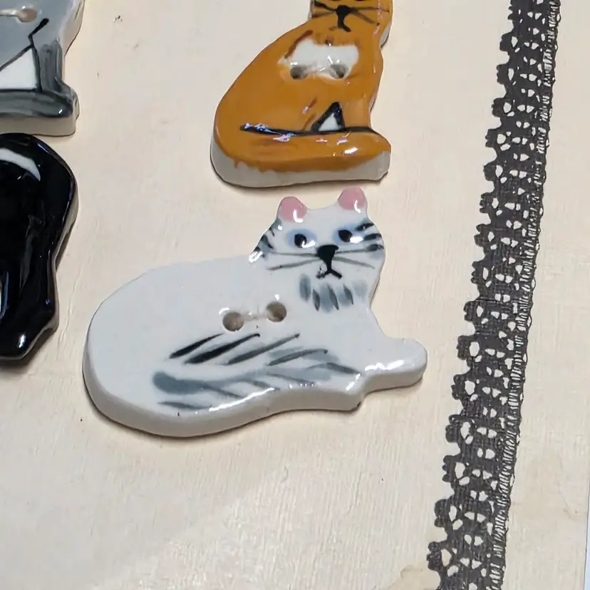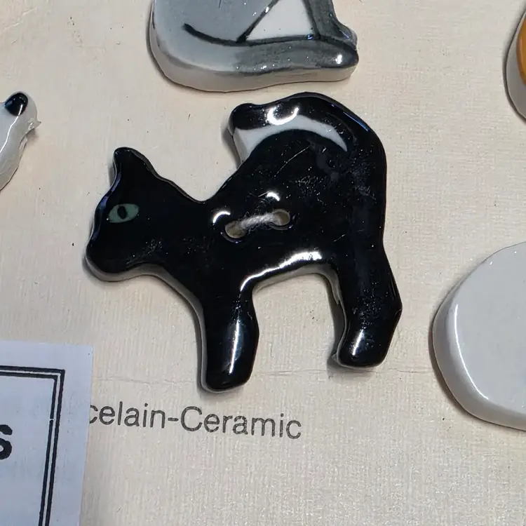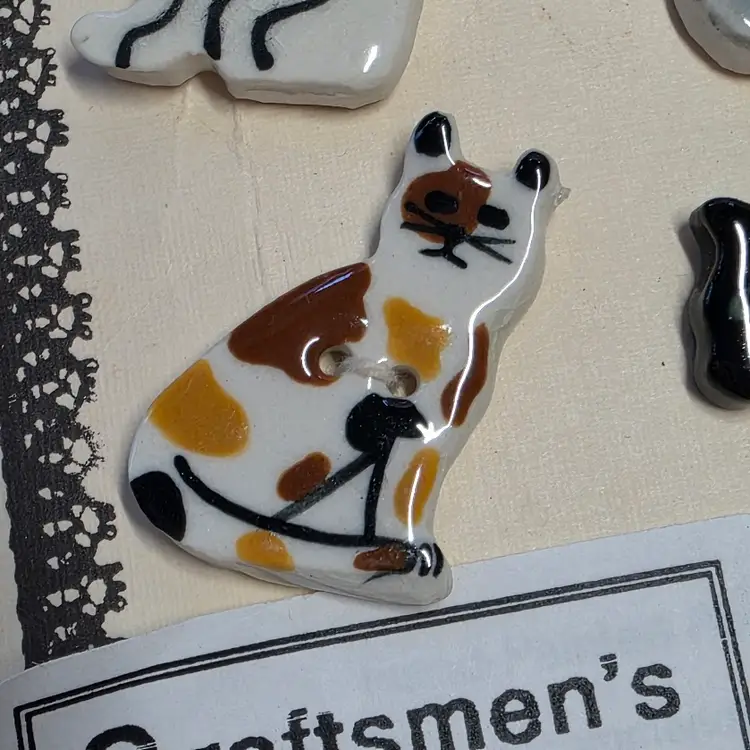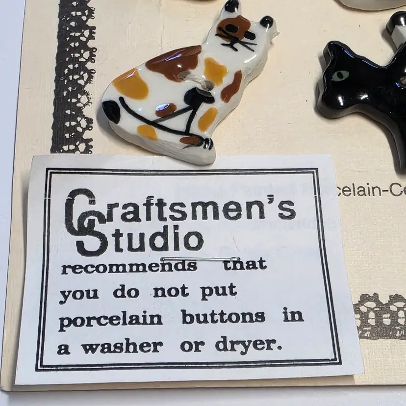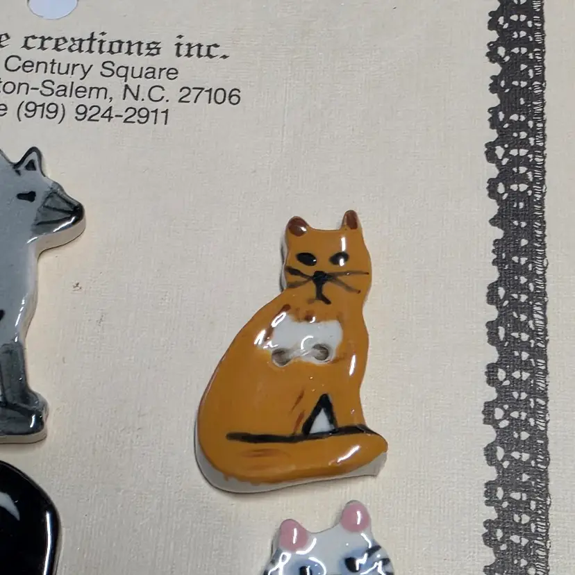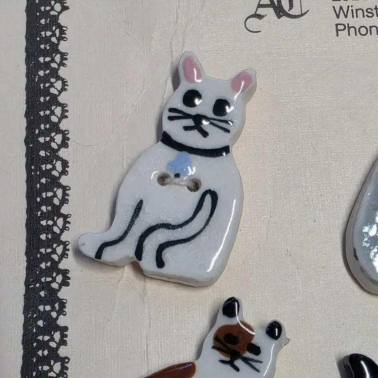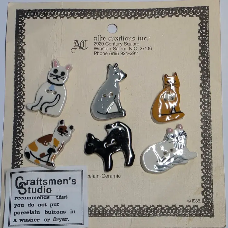 This delightful set of vintage porcelain buttons, crafted by Albe Creations in 1988, features intricate hand-painted cat designs. These unique buttons are a charming addition to antique collections, sewing projects, or decorative crafts. Their timeless artistry reflects the delicate craftsmanship of the era.