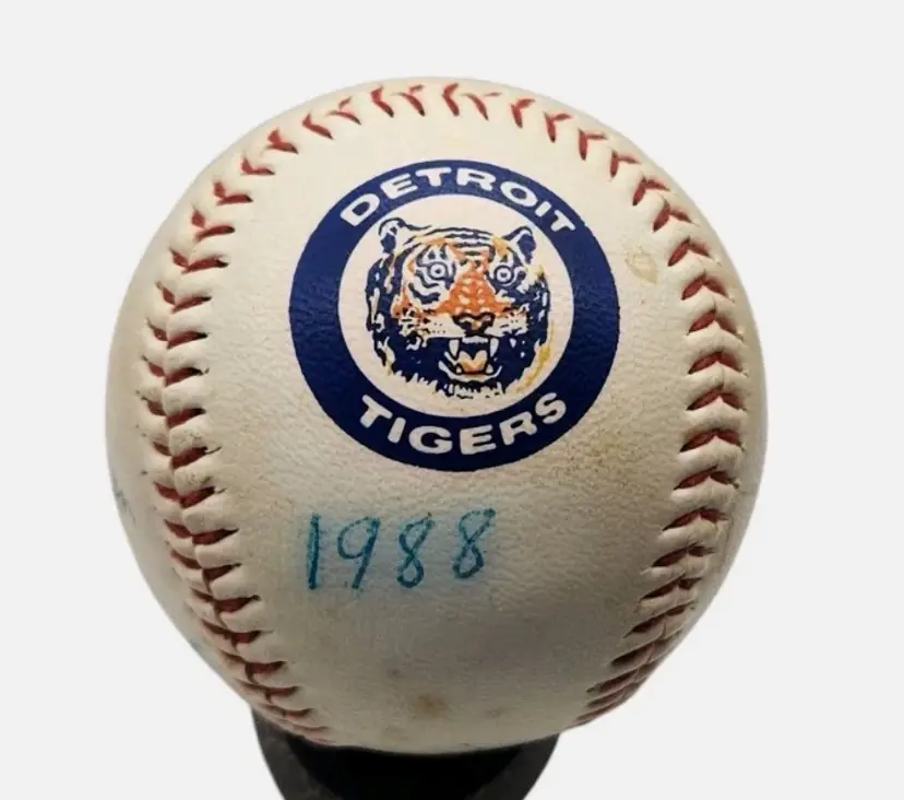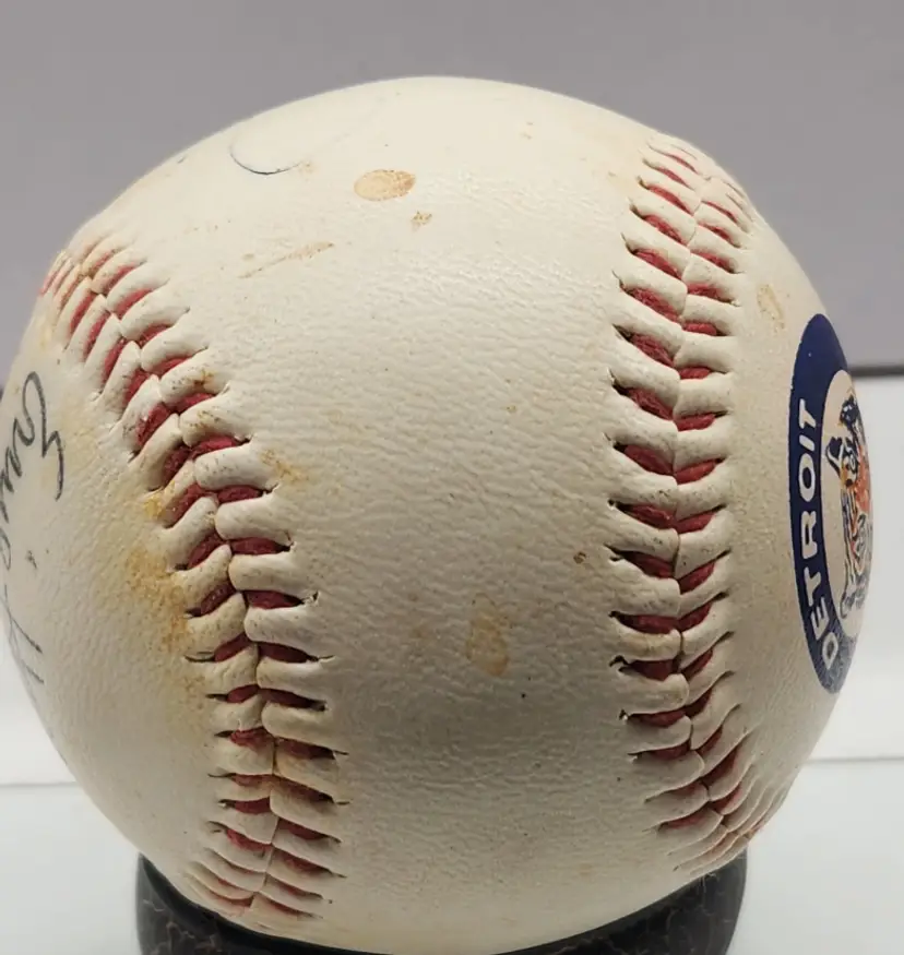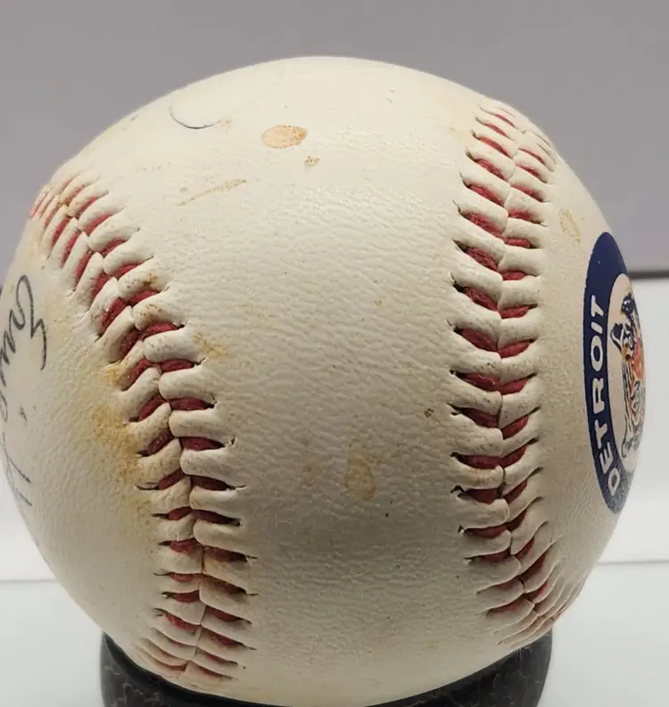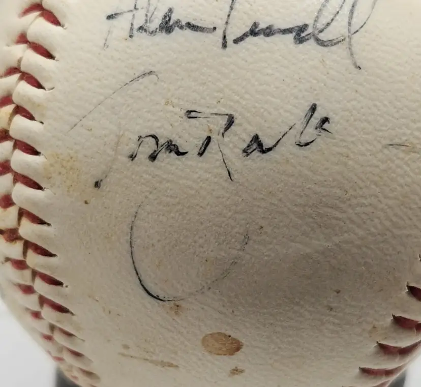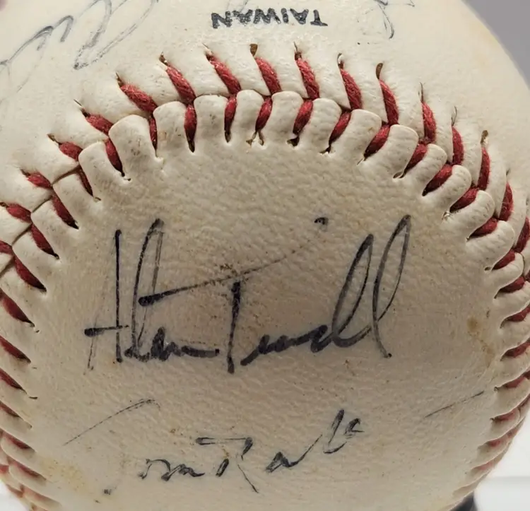 Ernie Harwell Billy Bean Tom Brookens Alan Trammell Sparky Anderson Brian Saltzgaber & Dave Bergman is in gold/yellow ink or was red and faded with age