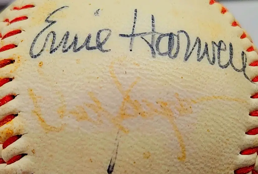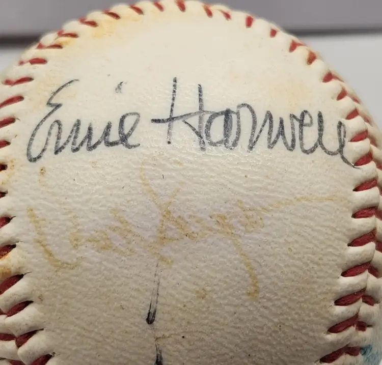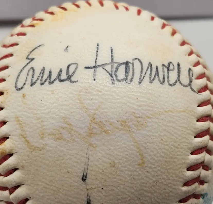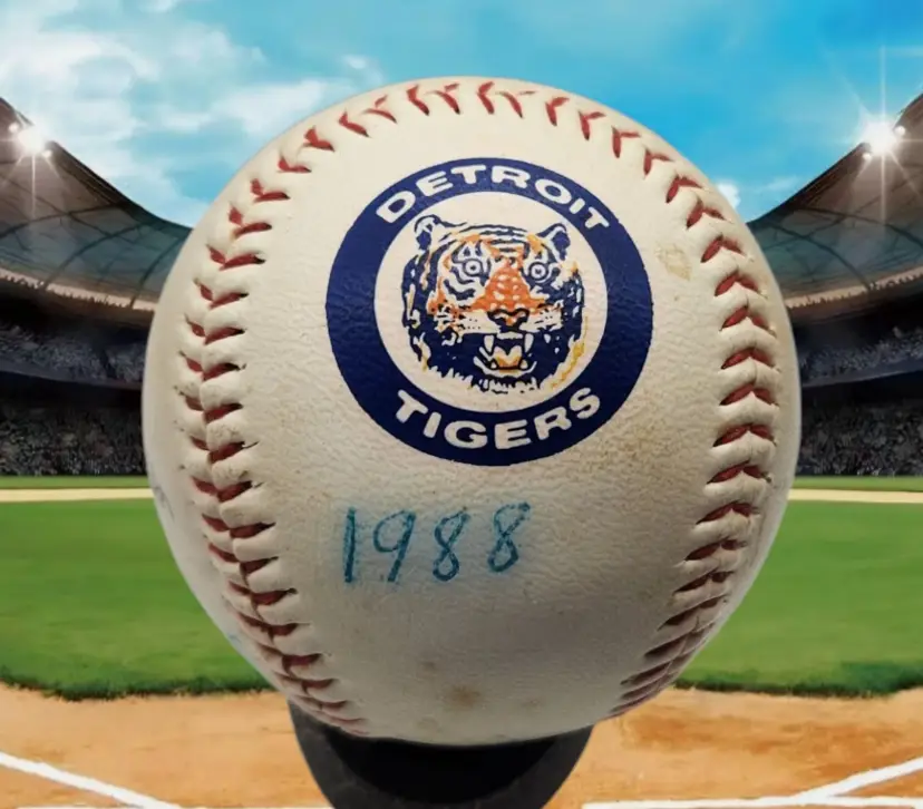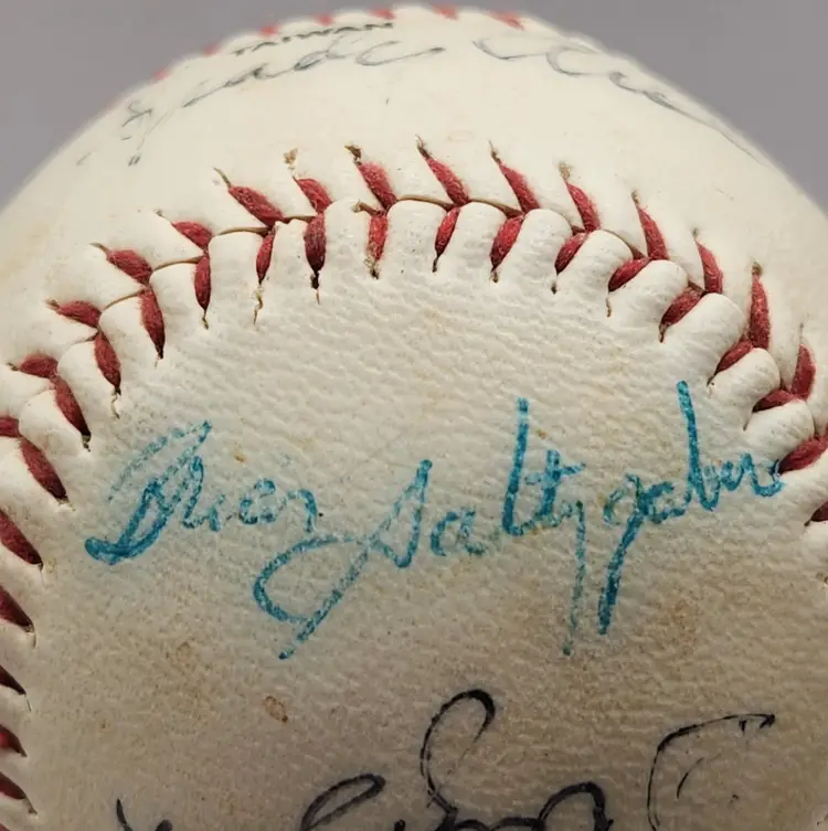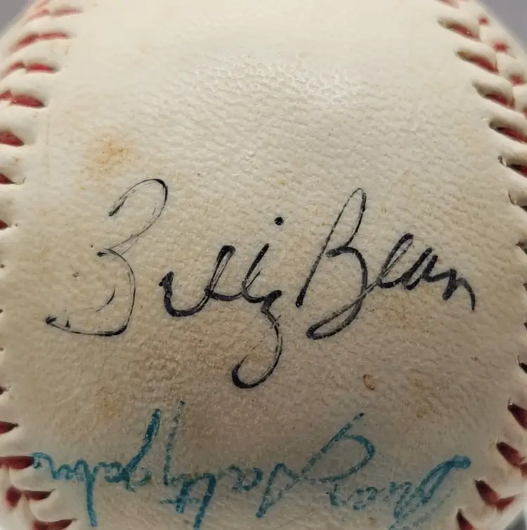 Ernie Harwell Billy Bean Tom Brookens Alan Trammell Sparky Anderson Brian Saltzgaber & Dave Bergman is in gold/yellow ink or was red and faded with age