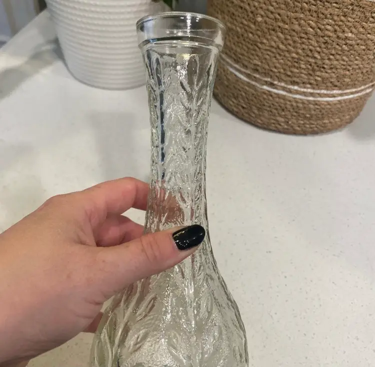 The Vintage 1990 FTD Clear Glass Vase with a Leaf Vine Design is a medium-sized bulb-shaped vase made of clear pressed glass. Featuring a mid-century modernist style, this vase is adorned with a leaf pattern, making it perfect for all occasions. With a vintage appeal and original design, this decorative collectible exudes a sense of nostalgia and botanical elegance, adding a touch of charm to any space. Standing at 9 inches tall, this vase is a unique piece of glassmaking history from the 1990s, ideal for collectors of vintage pressed glass.