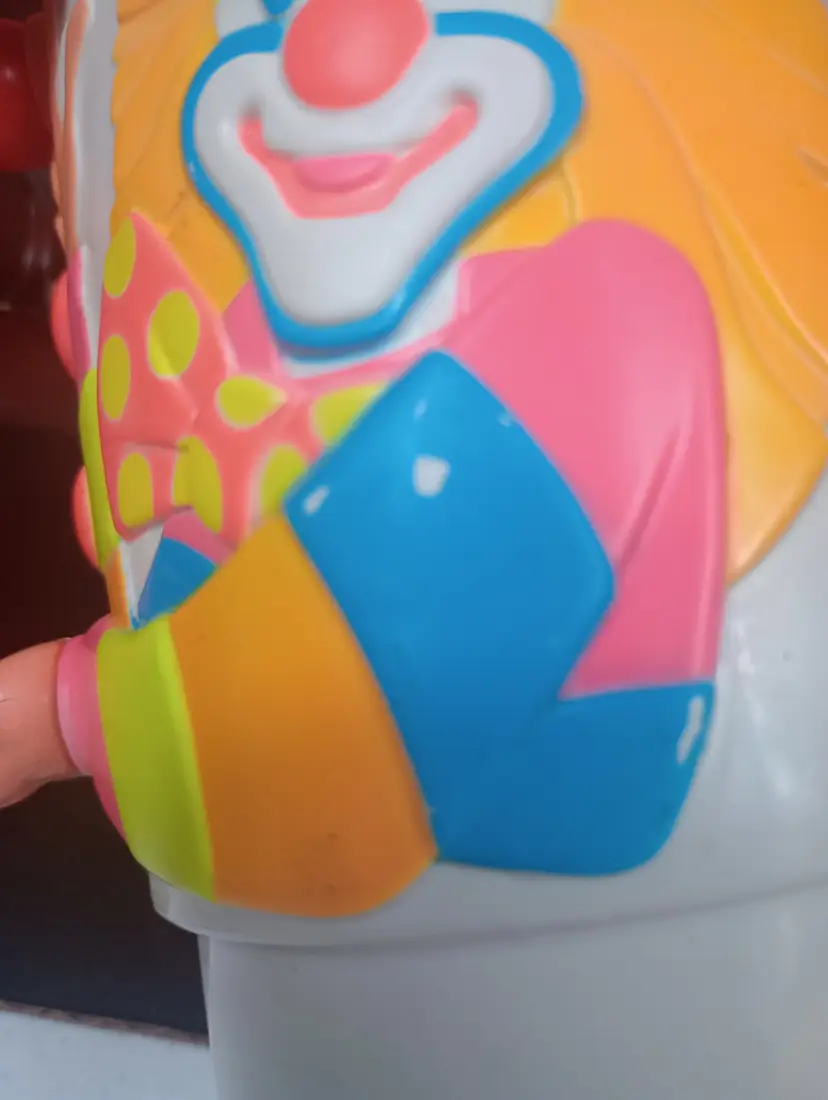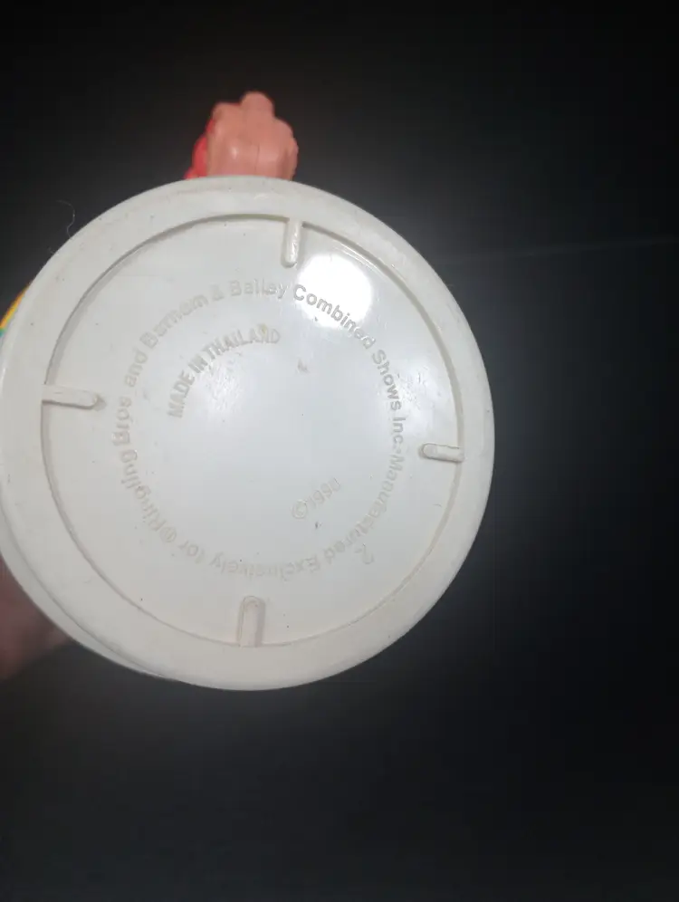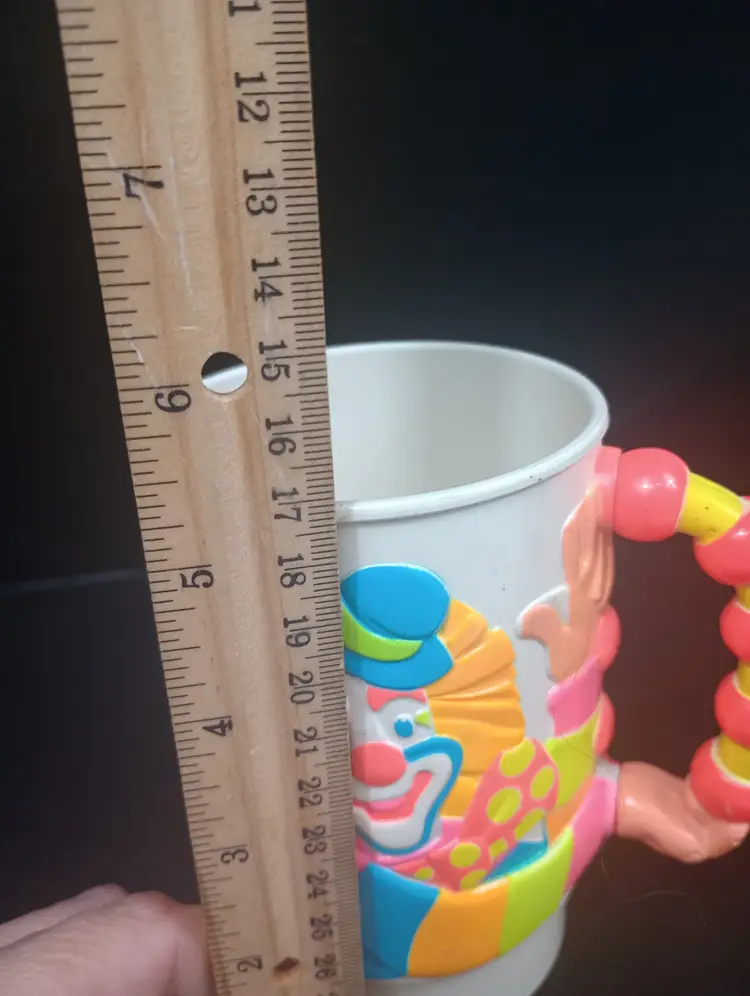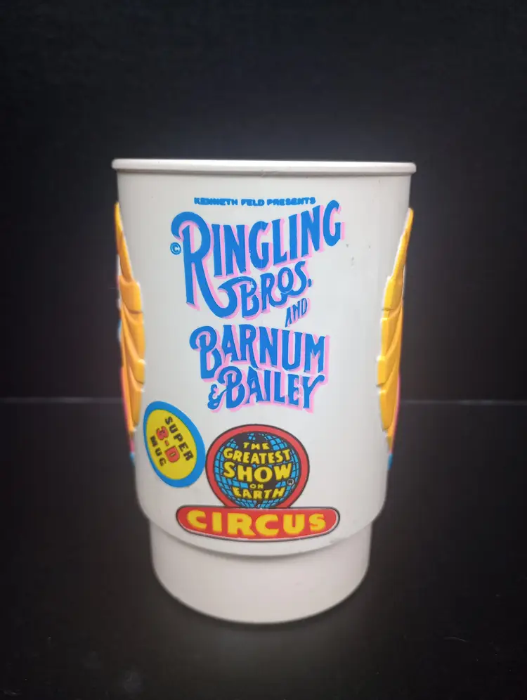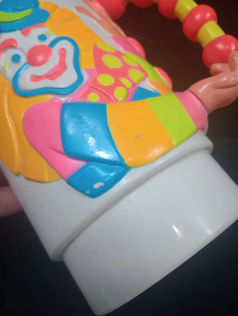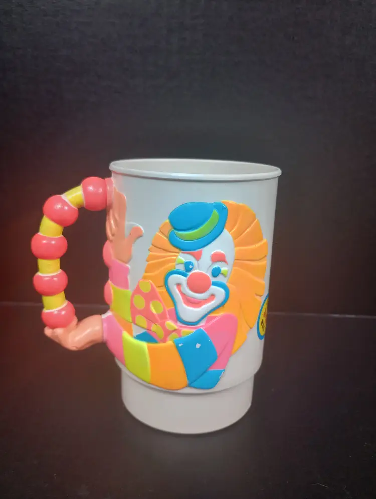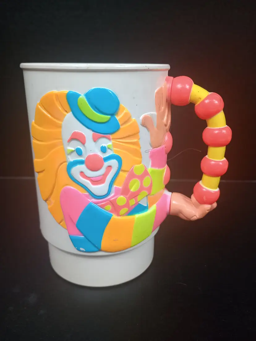 Vintage 1990 Ringling Brothers and Barnum & Baily Super 3D Plastic Neon Clown Mug. Has original Super 3-D Mug sticker still intact. Some wear highlighted in photos.