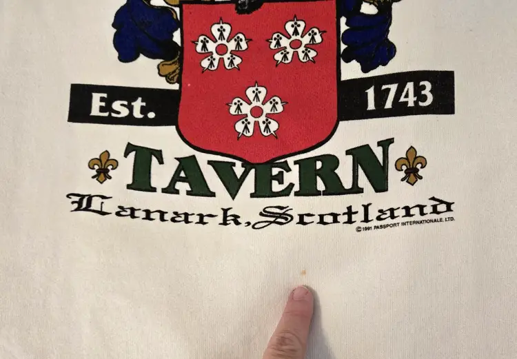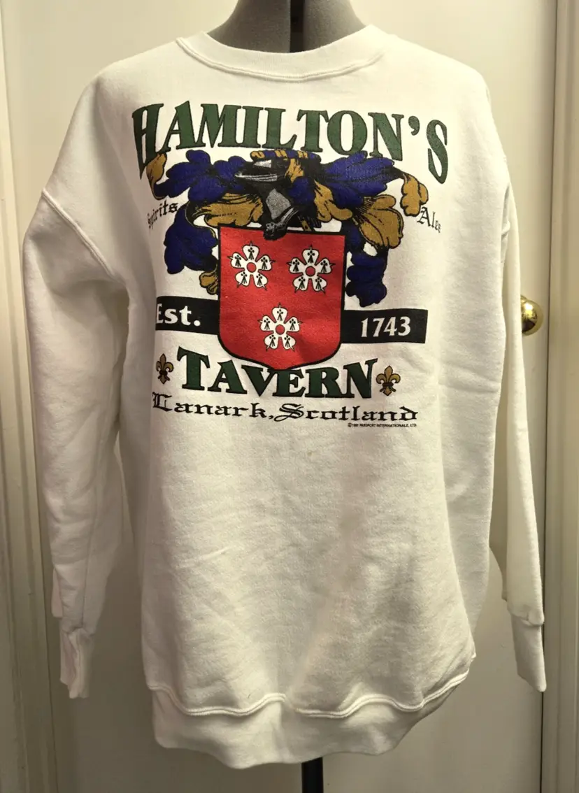 Vintage 1991 Lanark Scotland Hamilton's Tavern Graphic Sweatshirt Size XL Delta Fifty Fifty tag