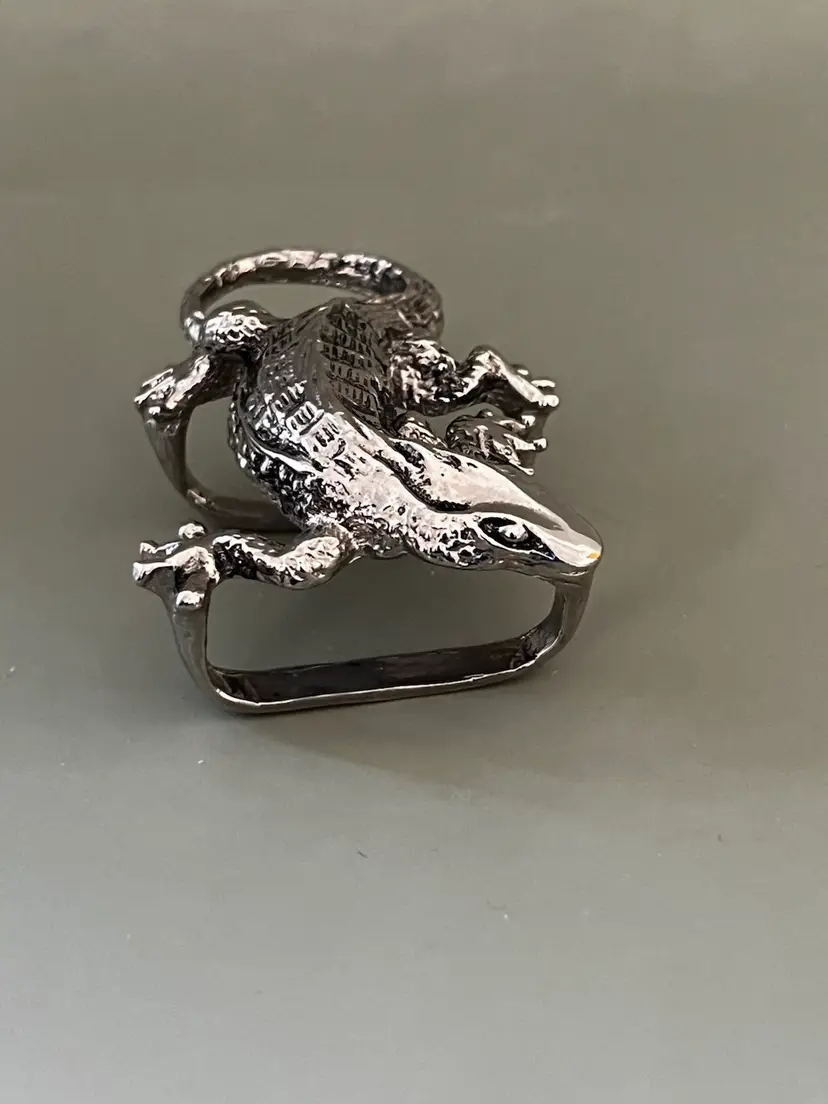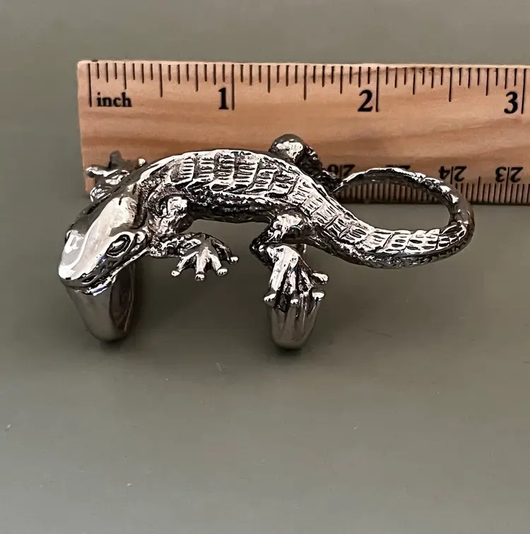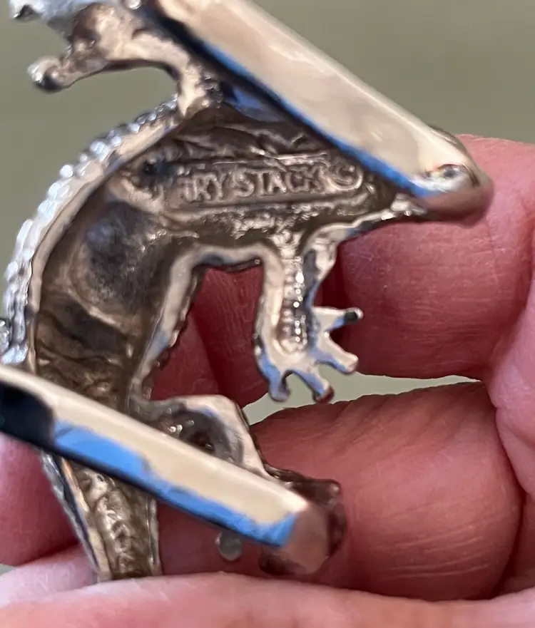 Terry Stack is a designer known for creating unusual shaped buckles and jewelry. This fun lizard shaped belt decor piece from 1993 is designed to slide along a 1.25" wide belt as a decor accent piece not as a buckle - easily repurposes into decor piece for desk or shelf. Fun form for fashion or decor use.