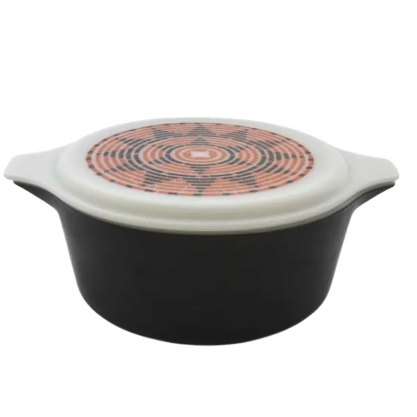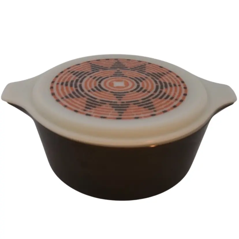 👉 11x9x4.5” 2.5qt 1974 Black Orange 👉Cinderella Casserole Style Opalware 👉Southwest Basketweave Pattern 👉No Chips or Cracks 👉 Review Photos for Best Condition Description 👉 Sold as Shown FUN FACT: The Pueblo was one of the first Patterns Corning offered with a trivet or hugger cradle to hold it. Previous casseroles used a more traditional style holder or candle warmer. Unfortunately many sets have been separated over the years as with the the one being offered here