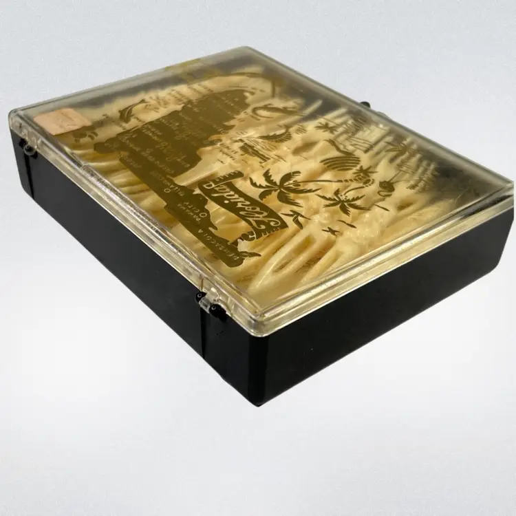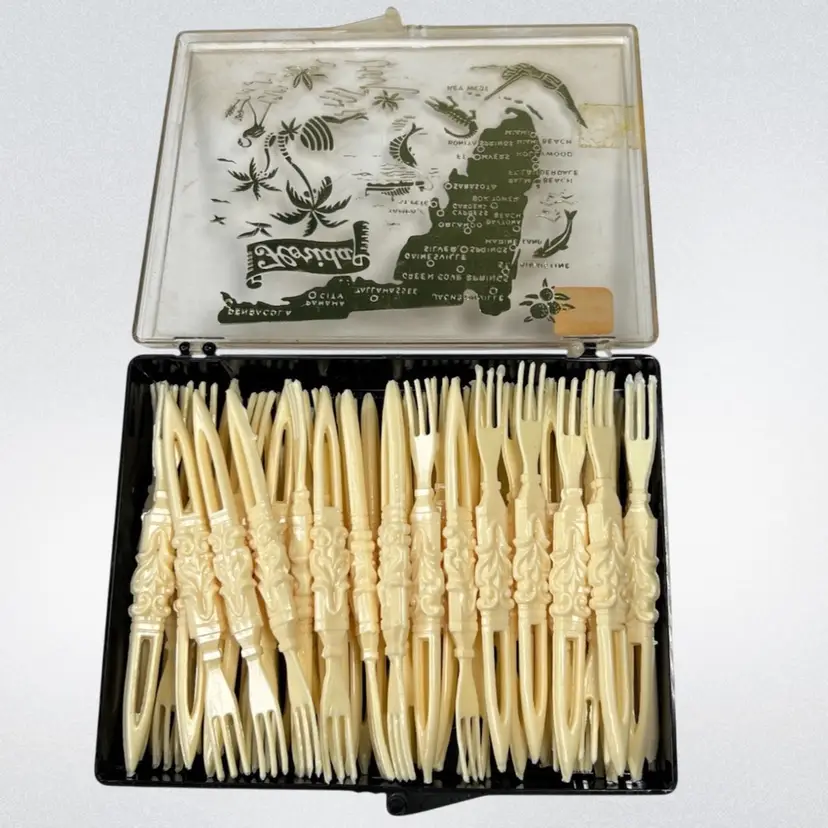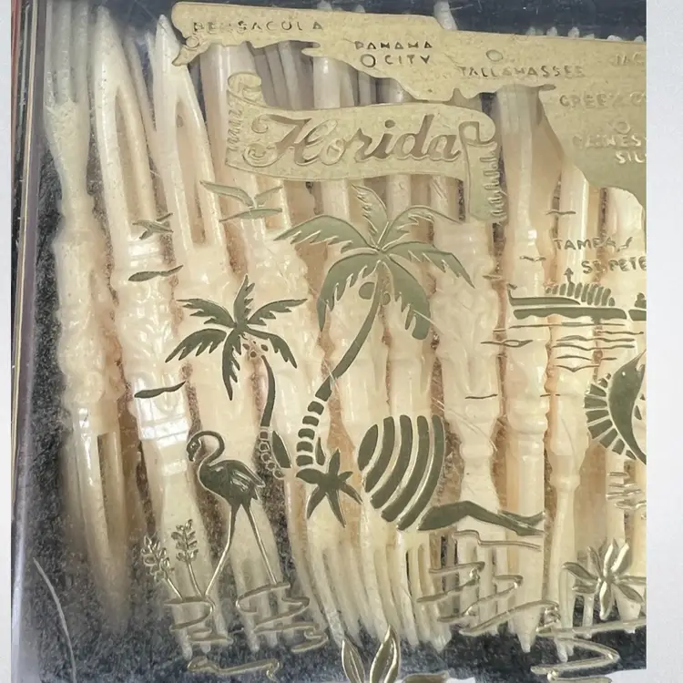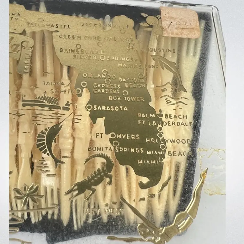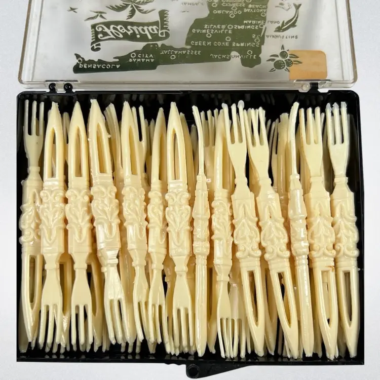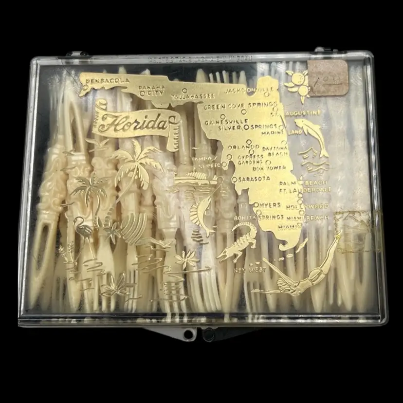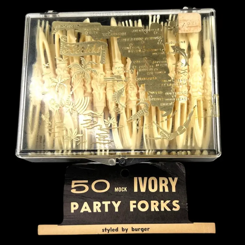 Vintage 52 “Mock Ivory” (Plastic) Party Forks In Souvenir Florida Case. Old $1 Price Tag on Lid. Original label says “50 Mock Ivory Party Forks. Styled by Burger”. There are actually 52 forks. Gold-Colored Embossed Florida Map & Infamous Icons On Lid. Great For Those Tiki Cocktail Beach Parties To Serve Up Hors D'oeuvres. Case: 4-1/2” x 3-3/4” x 1” Weighs 5 ounces “Made in U.S.A.” and Patent number embossed on inner lid. Condition: Case has 1 broken hinge, as shown in last photo