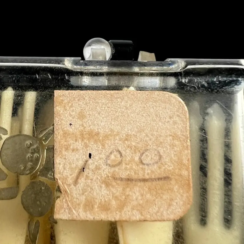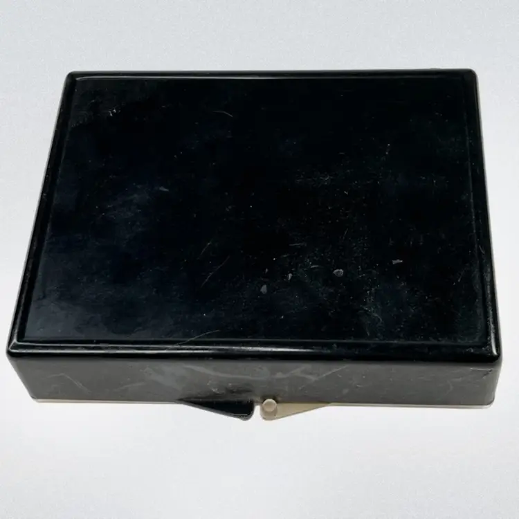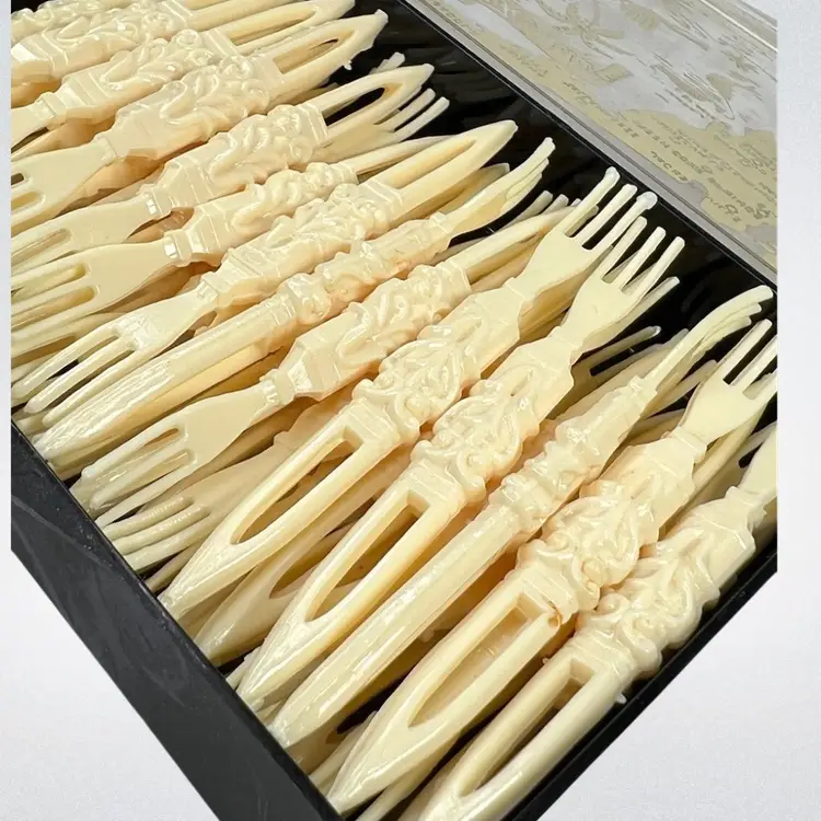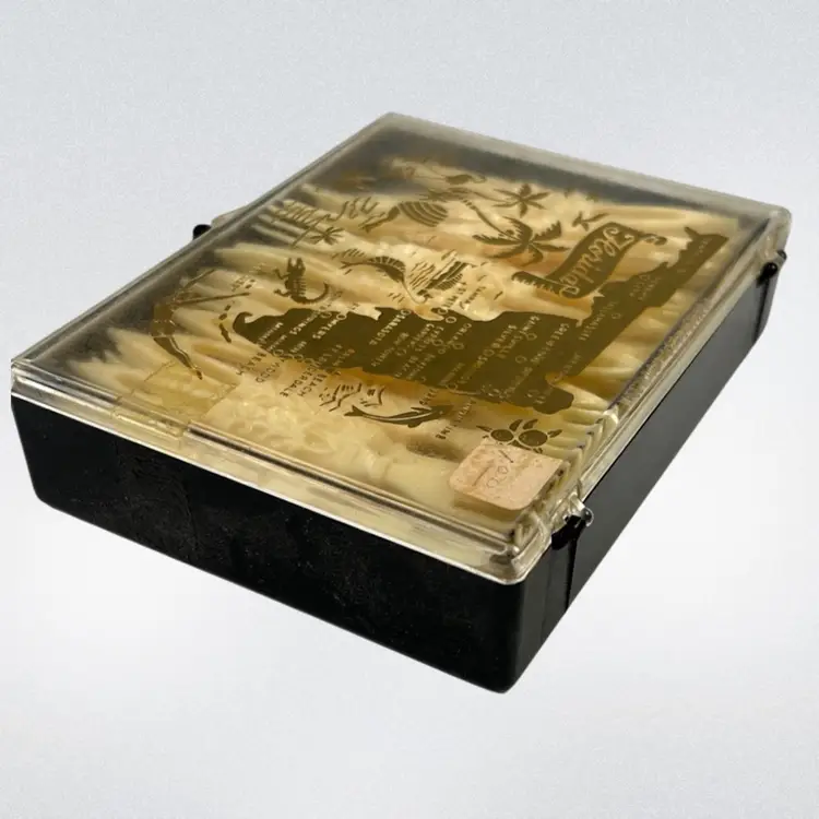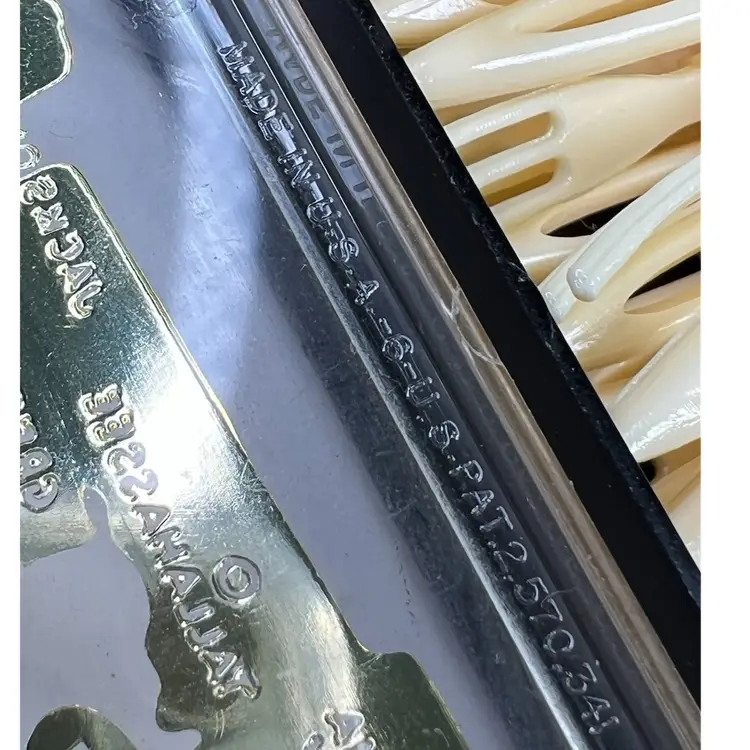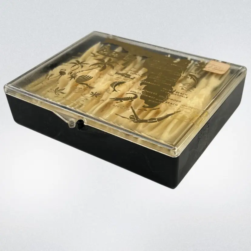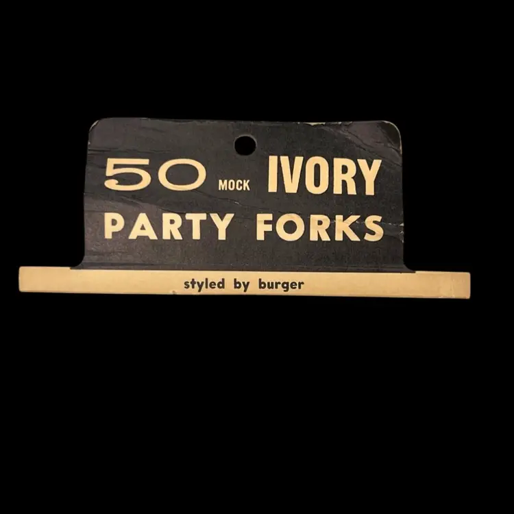 Vintage 52 “Mock Ivory” (Plastic) Party Forks In Souvenir Florida Case. Old $1 Price Tag on Lid. Original label says “50 Mock Ivory Party Forks. Styled by Burger”. There are actually 52 forks. Gold-Colored Embossed Florida Map & Infamous Icons On Lid. Great For Those Tiki Cocktail Beach Parties To Serve Up Hors D'oeuvres. Case: 4-1/2” x 3-3/4” x 1” Weighs 5 ounces “Made in U.S.A.” and Patent number embossed on inner lid. Condition: Case has 1 broken hinge, as shown in last photo