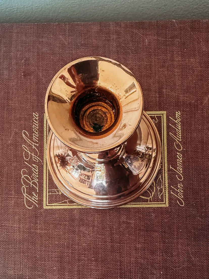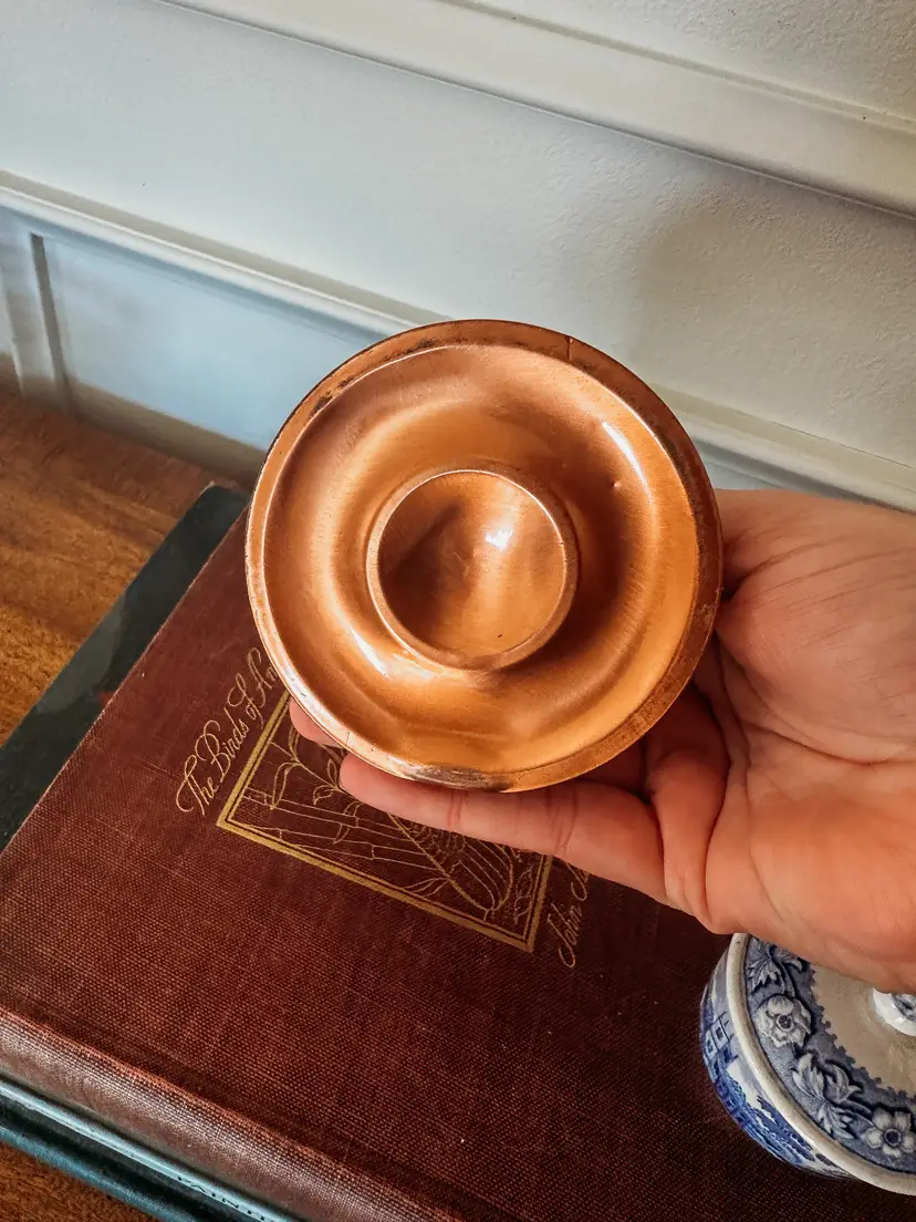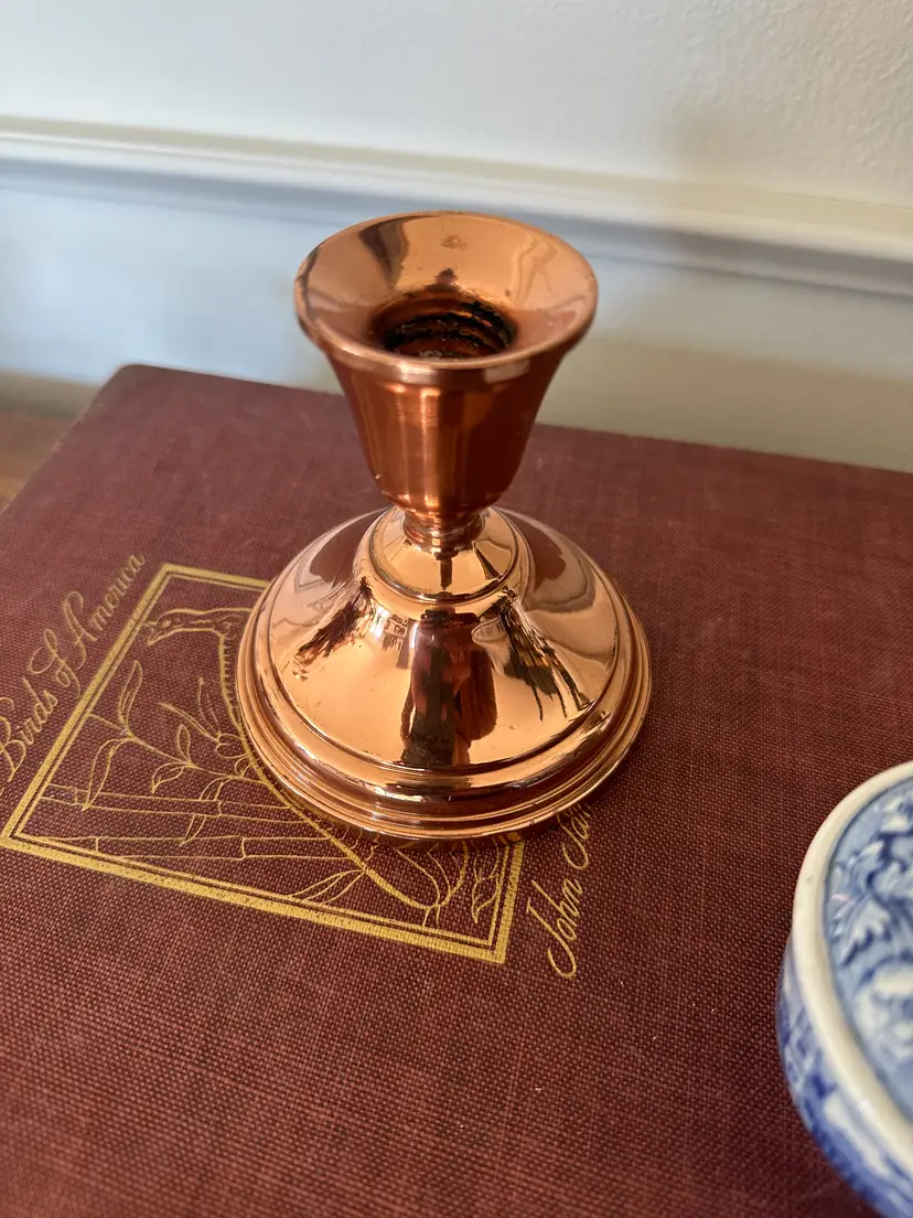 Gorgeous copper candle holder standing 4.5" tall. The top piece is a bit wobbly - it's all connected but wiggles a bit if you lift it by the top. Holds a taper candle securely and straight regardless of the "wobbly"