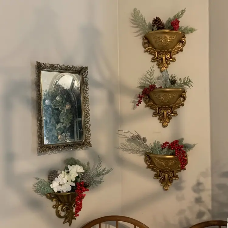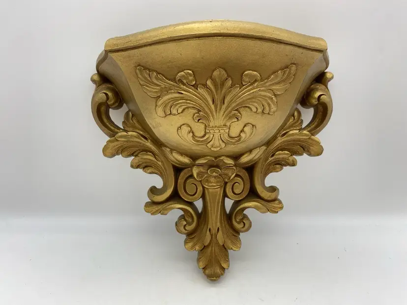 Vintage 70's Mid Century Homco Plastic Gold Wall Pocket Planter French Regency. In very good, preowned condition. Please be sure to check listing photos prior to purchase to confirm. Measures 8” height x 8.5” width x 4” depth.