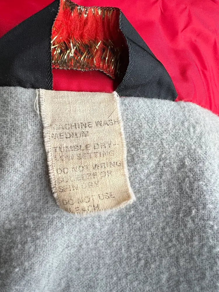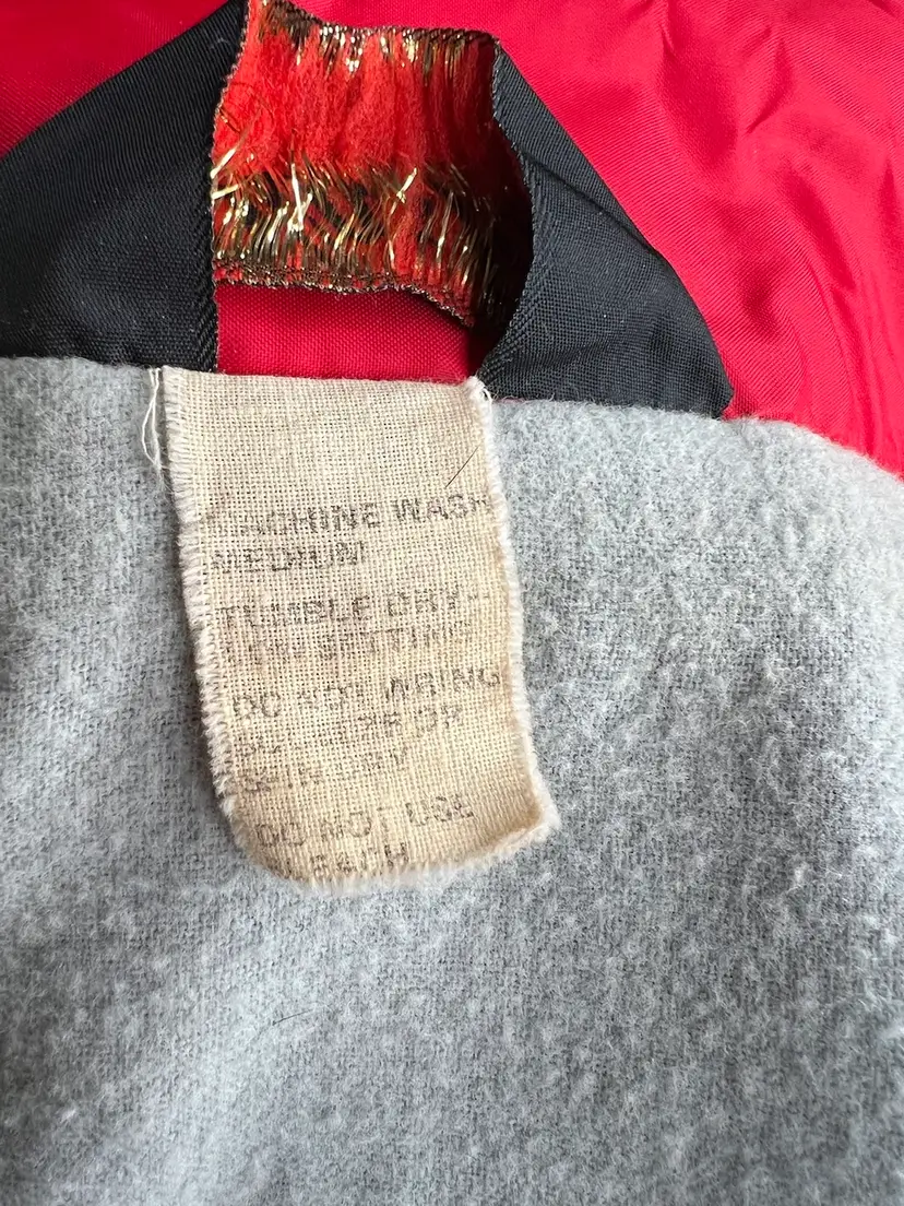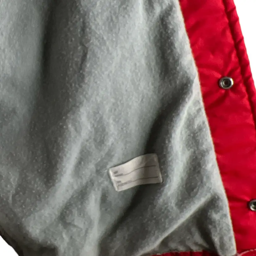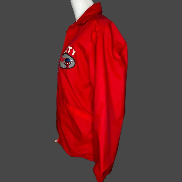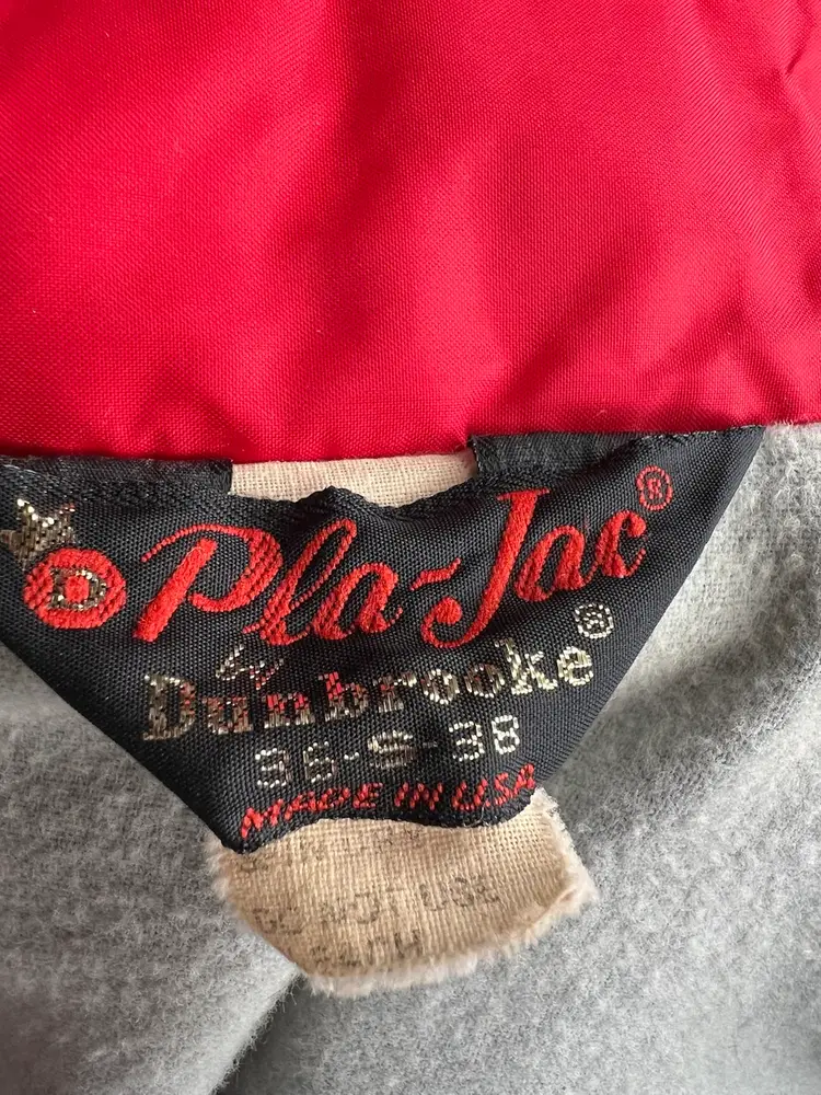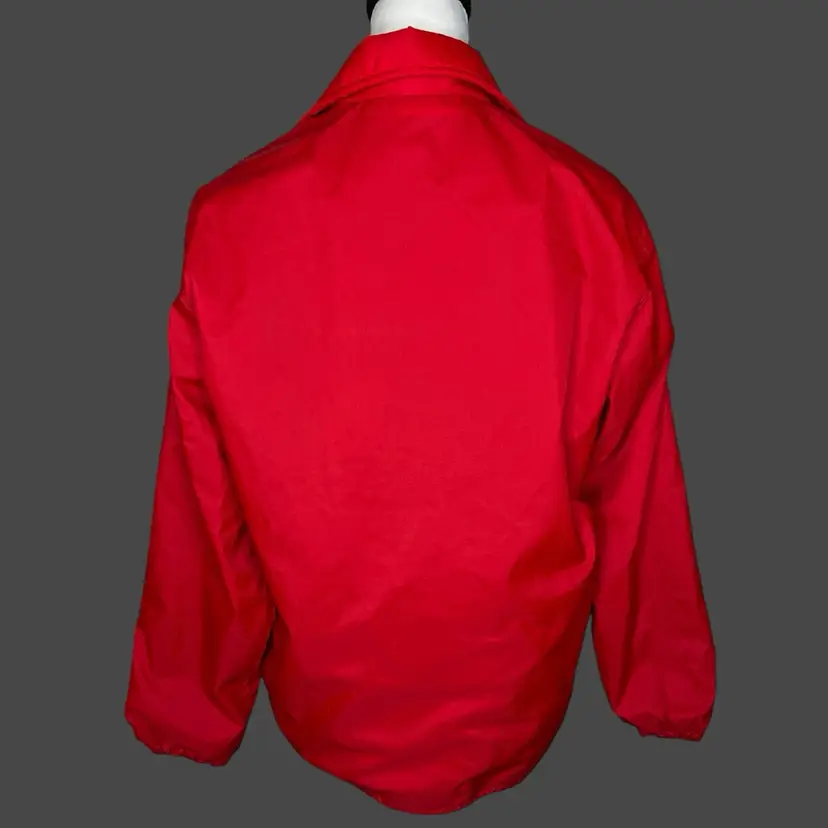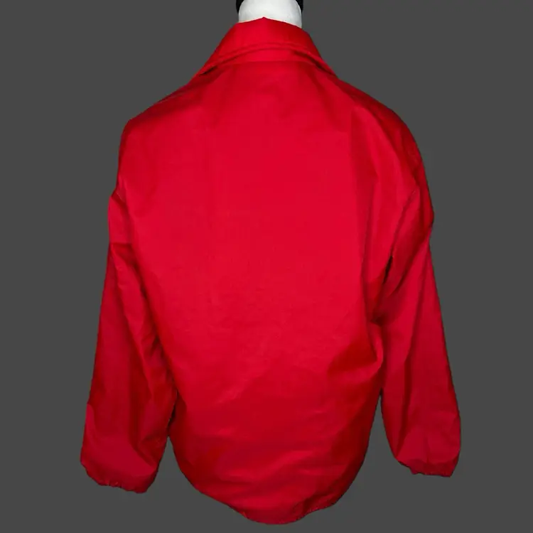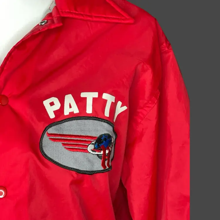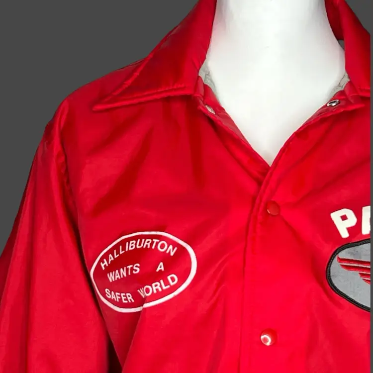 This vintage red windbreaker jacket from Pla-Jac by Dunbrooke is a must-have for any fan of 70s workwear. The red color, nylon outer shell, and solid pattern make it stand out, while the drawstring and snap closure keep you secure. The jacket is lined, has a snap up closure, drawstring at the bottom and features pockets to keep your belongings safe. The accents include an "around the world" patch logo. The name "Patty" appears above the sewn on patch, on the opposite side the jacket reads " Halliburton Wants A Safer World". "Patty" and "safer world" are printed on the jacket in the classic 70s medium. The jacket is a size S and is in great vintage condition. It was made in the United States and is perfect for anyone looking for a lightweight, stylish retro jacket. Tagged reads 36-S-38 Chest-42" Shoulder-18.5" Sleeve-18.5" Minor fading/cracking of both "Patty" and "Safer World", otherwise flawless vintage condition! Smoke free environment.