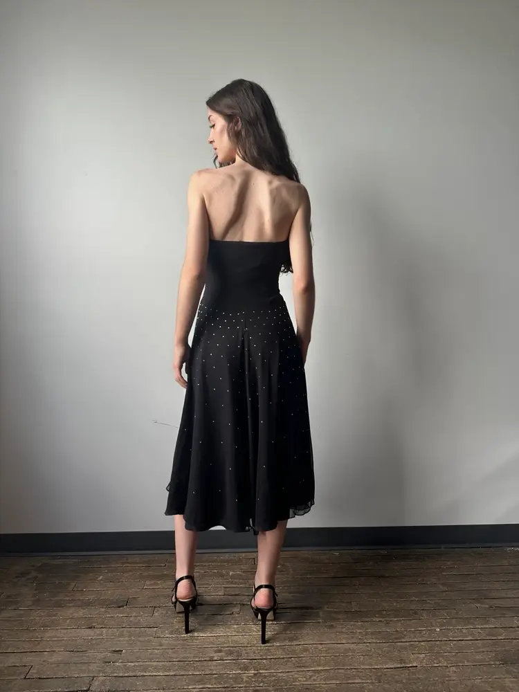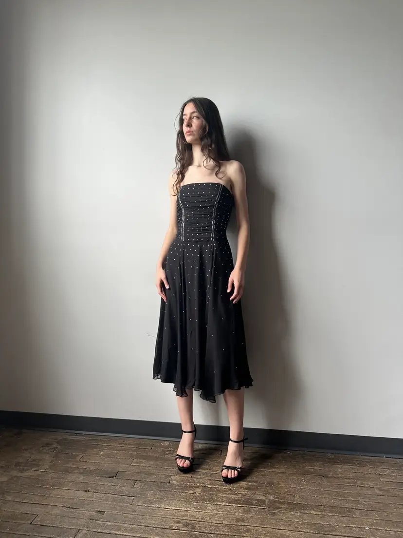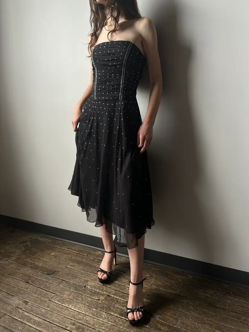 The most stunning silk chiffon midi dress from Betsey Johnson. This piece has a closet style bodice that’s strapless.