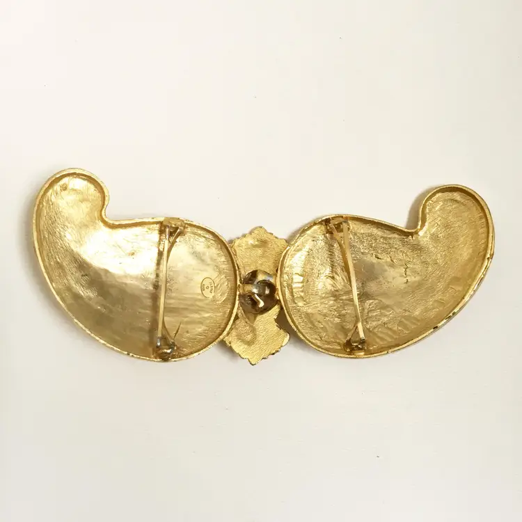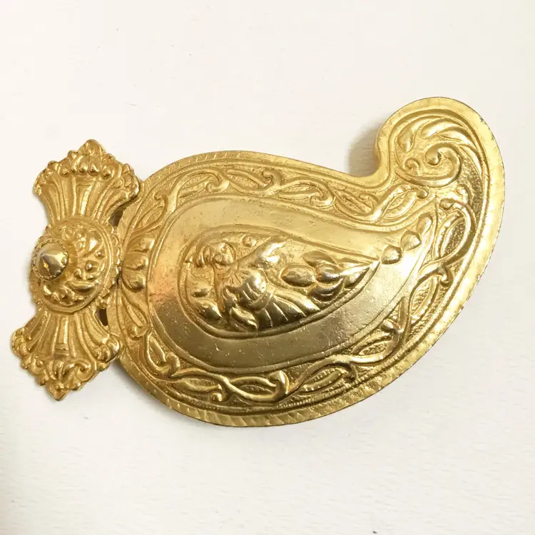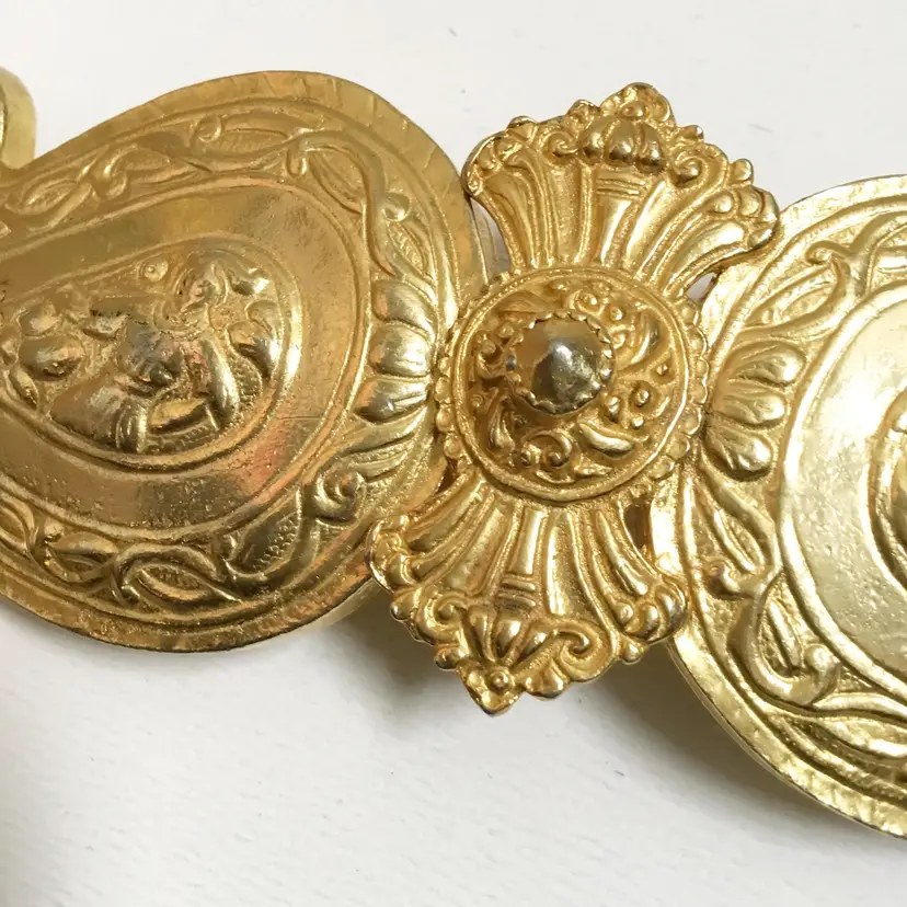 This two piece Alexis Kirk statement gold tone belt buckle features a knight figure and ornamental design.