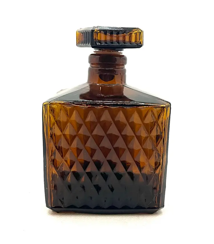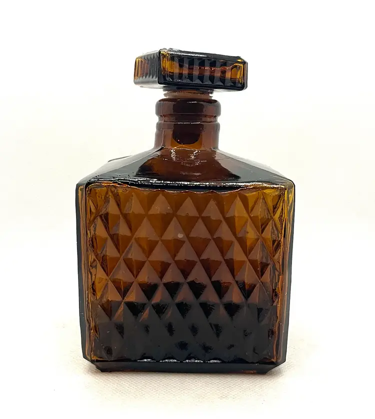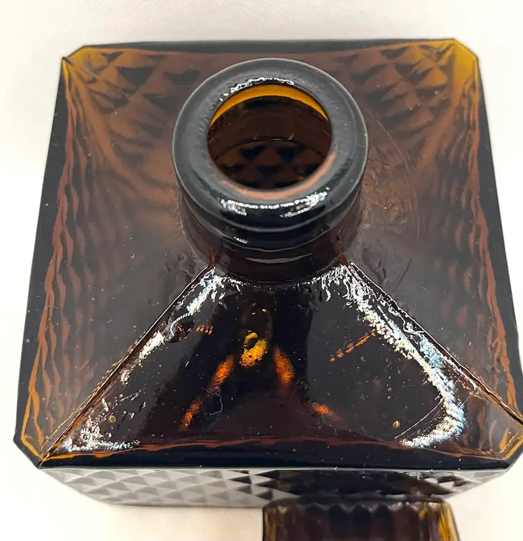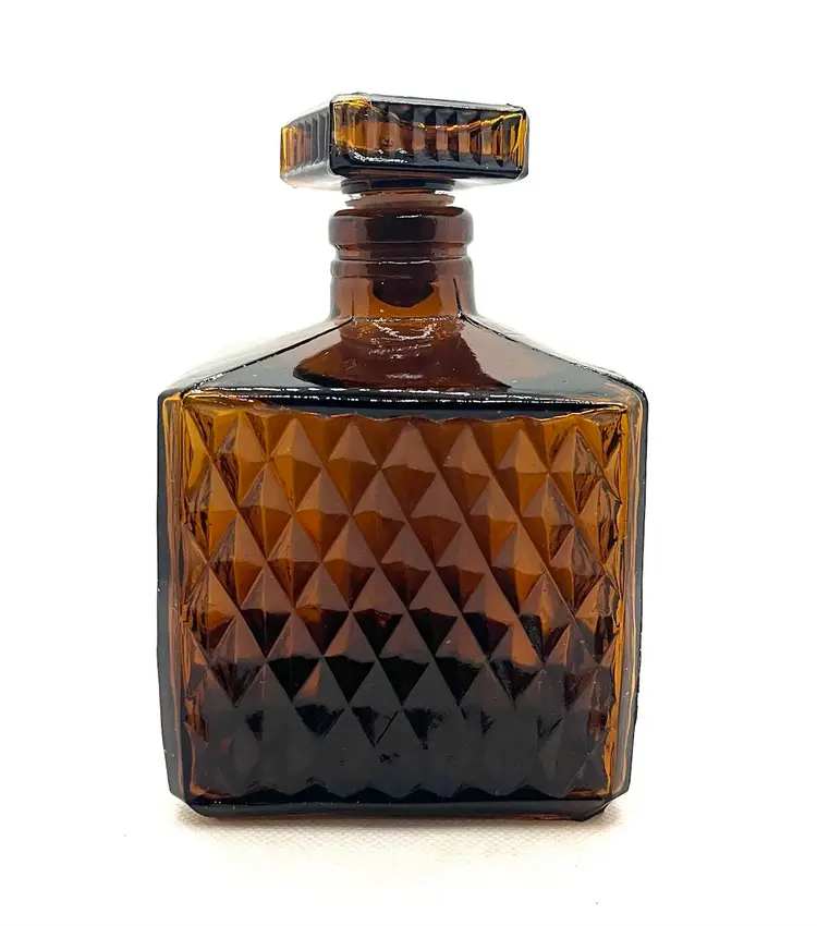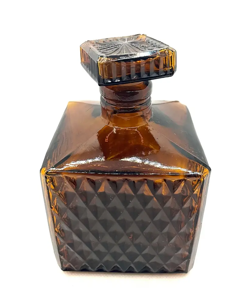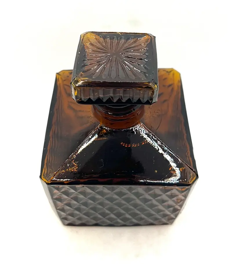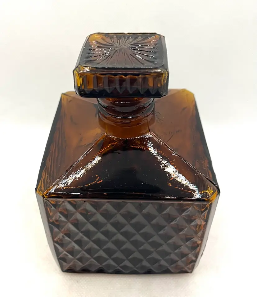 Vintage Amber Glass Square Diamond Point Decanter Bottle W/ Stopper MCM Barware. Lovely Fall Halloween Decor. Made in Taiwan. Minimal surface wear or scratches. No chips or cracks.