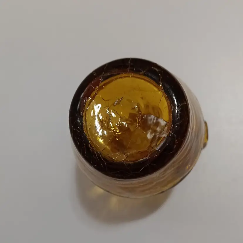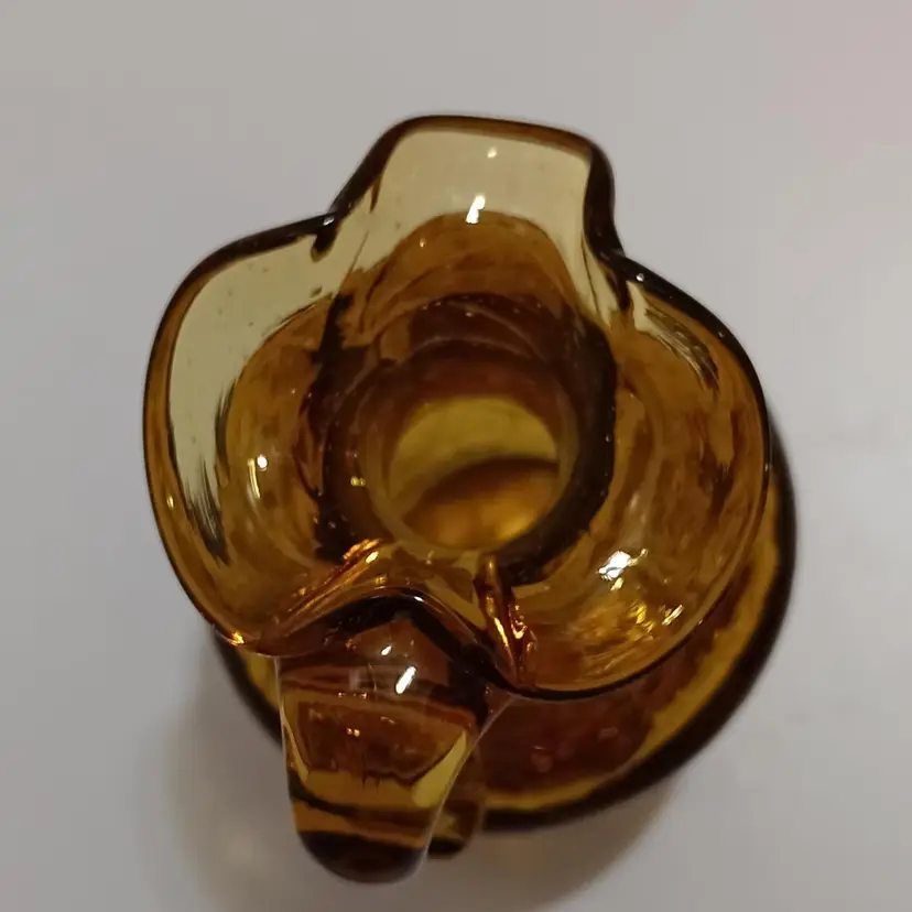 Vintage Amber Hand Blown Crackle Glass Pitcher With Applied Handle from 1960's; 5" T x 3.5" W thru handle; Excellent Condition; No Chips or Cracks; Pontil mark on bottom.