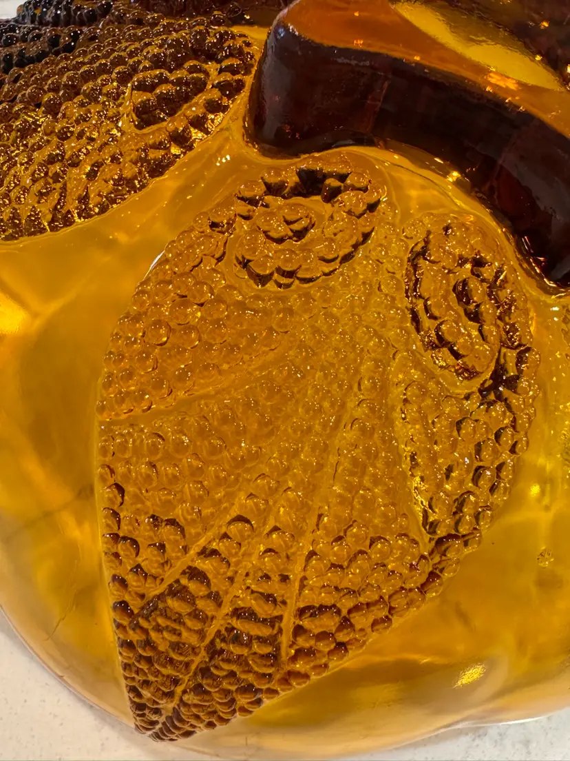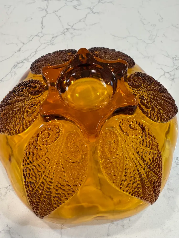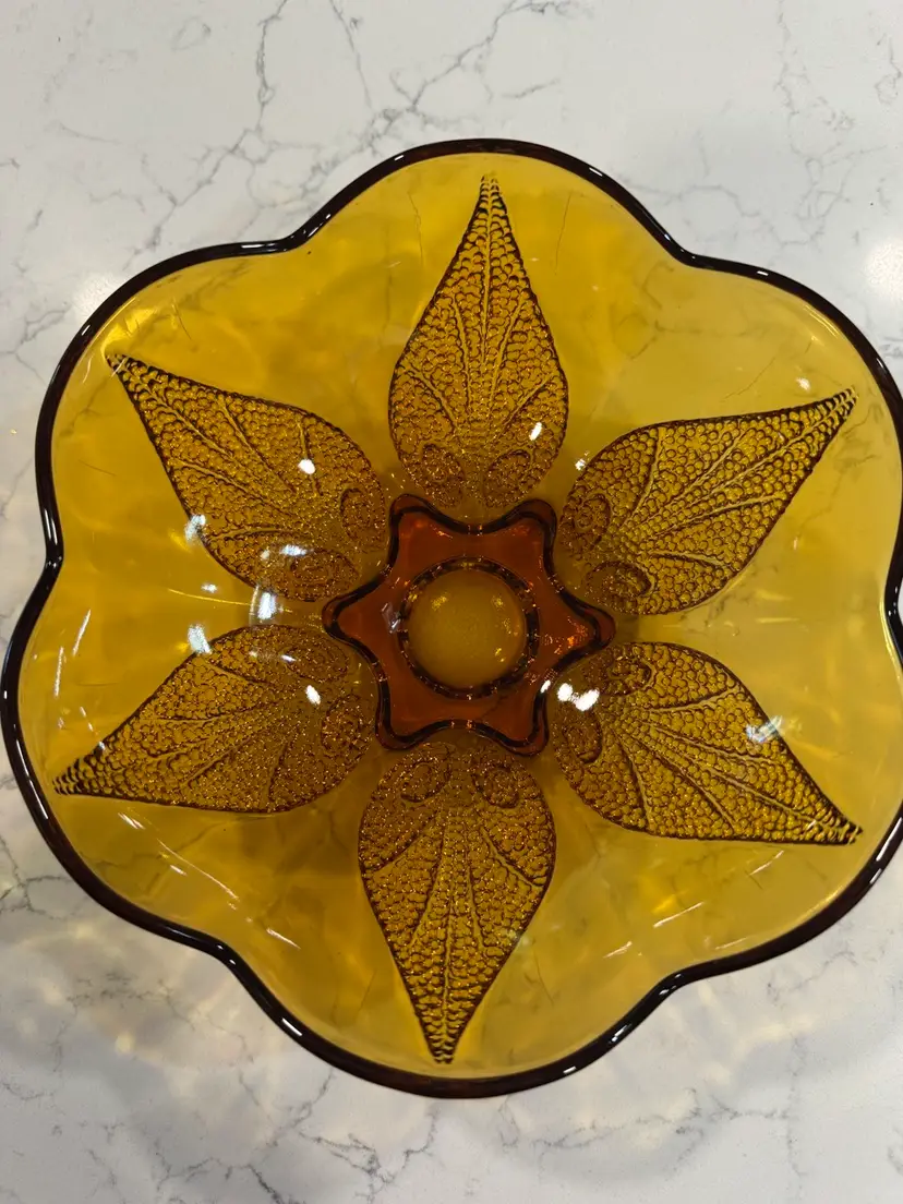 Discover this stunning glass bowl, a true testament to mid-century design. This beautiful amber glass bowl features an intricate beaded leaf pattern that catches the light wonderfully, adding a touch of vintage elegance to any setting. It's unique design and craftsmanship make it a desirable piece for collectors of vintage glassware. Excellent pre-owned condition with no chips, cracks, or significant wear, showcasing its enduring quality.