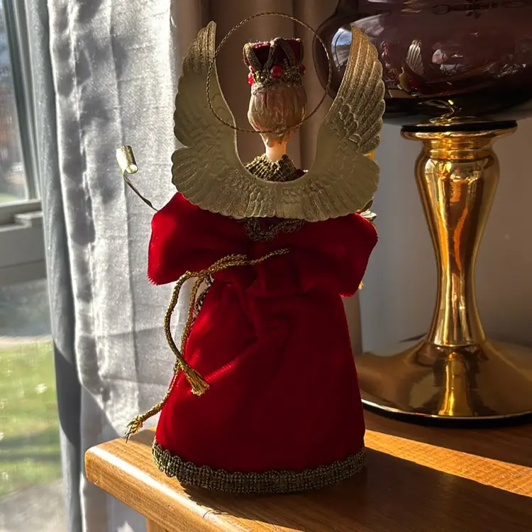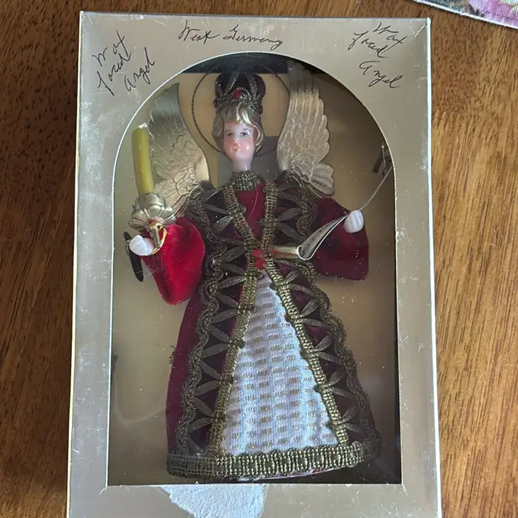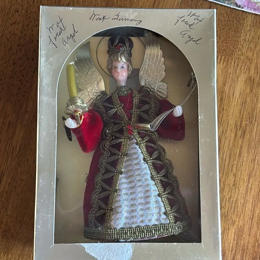Vintage west German Hand crafted Angel tree topper in original box. Face is crafted in wax with velvet dressing. Beautiful condition. Measures 7” tall.
