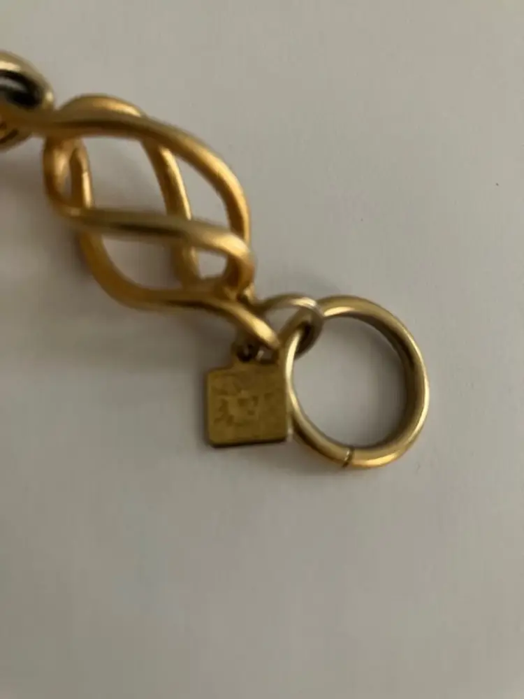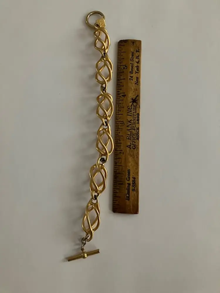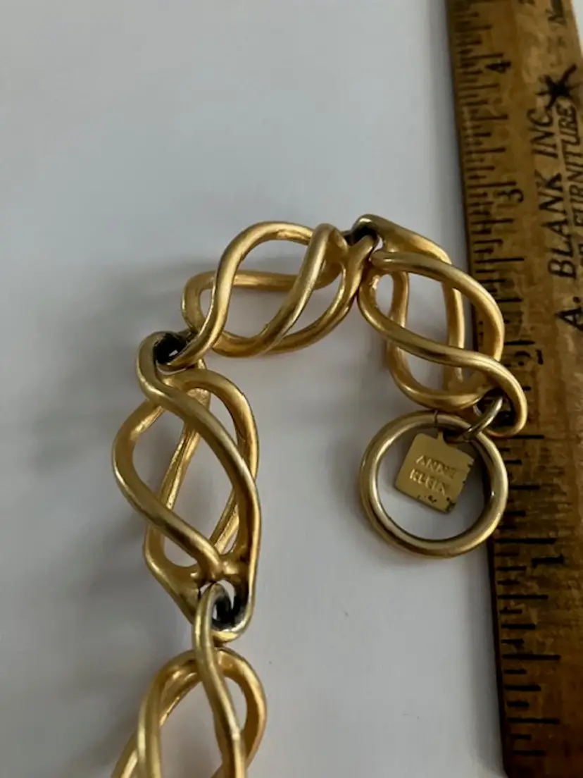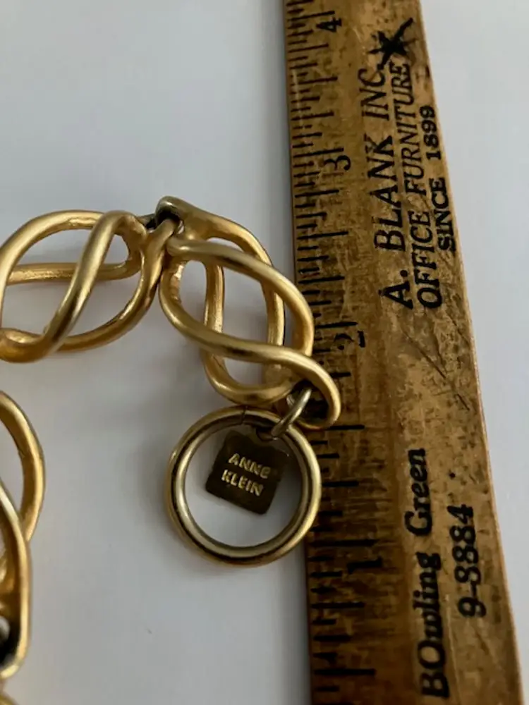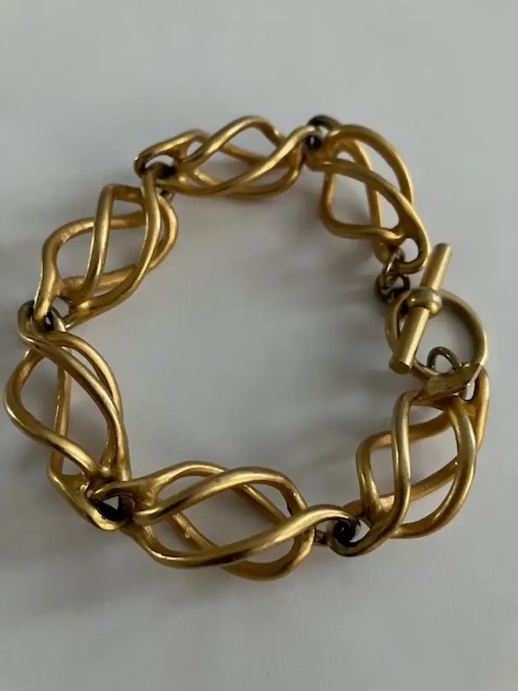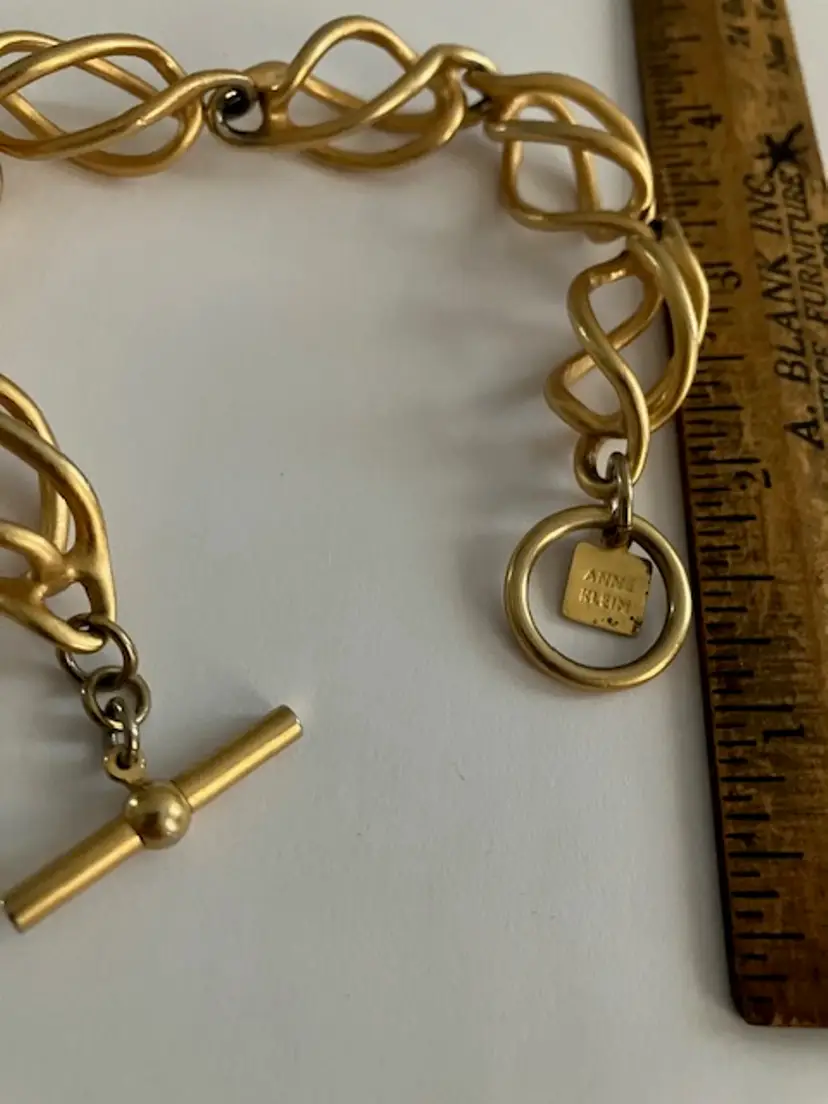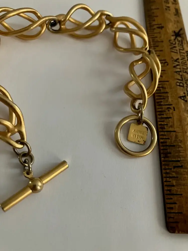 Vintage Anne Klein brushed gold tone bracelet. Measures 7 1/2". Lightweight. Great condition but has quite a bit of verdigris. Toggle closure. Signed Anne Klein.