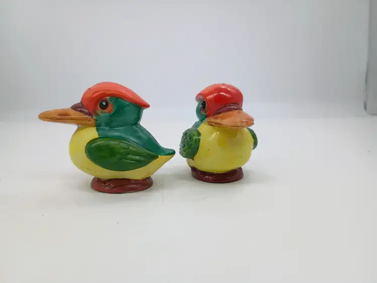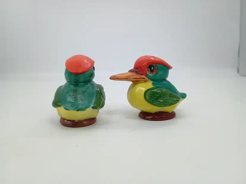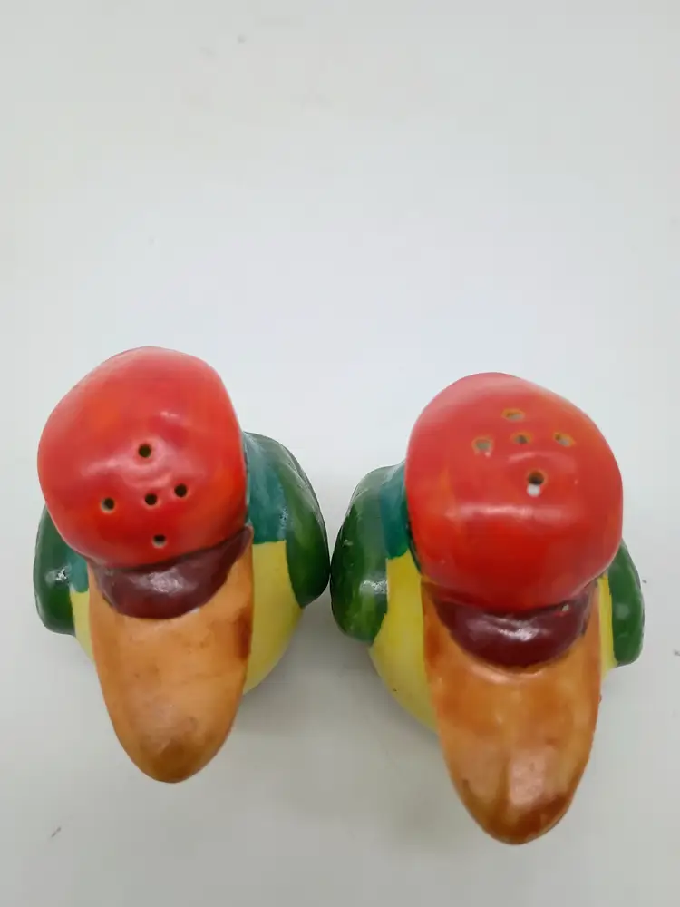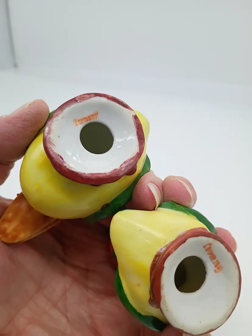 Vintage /Antique Germany Porcelain Colorful Kookaburra Parrots Birds Salt & Pepper Shakers. Circa 1915-1930. These are 2.5 inches tall 4 inches long and 2 inches wide. There are no chips or cracks barely any paint wear. The original bottoms are inside the shakers you can get replacements stoppers online or hand cut pieces of cork. These date from 1899-1920 time frame. They are in excellent condition for their age. Ships USPS domestically and UPS worldwide